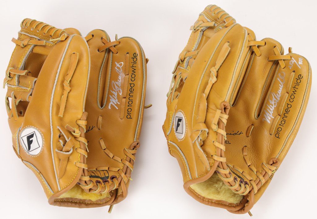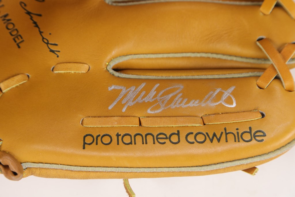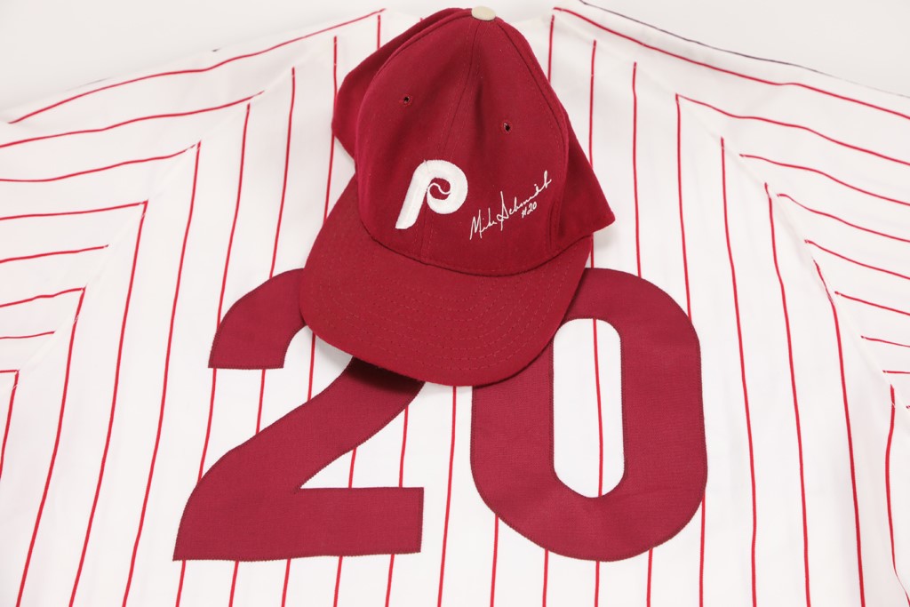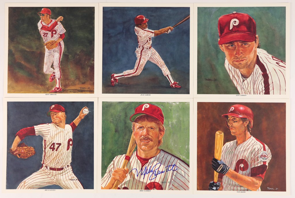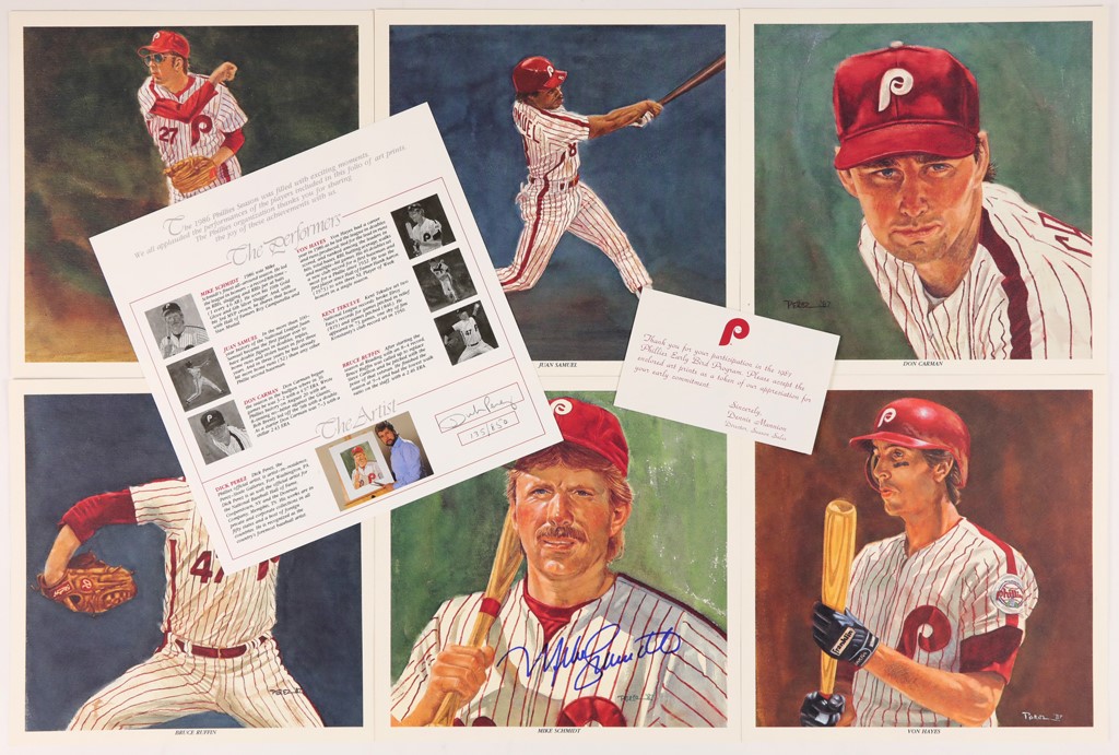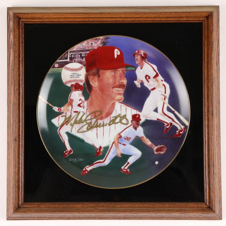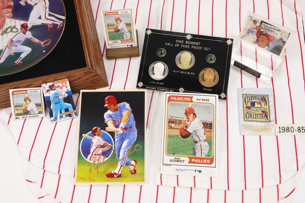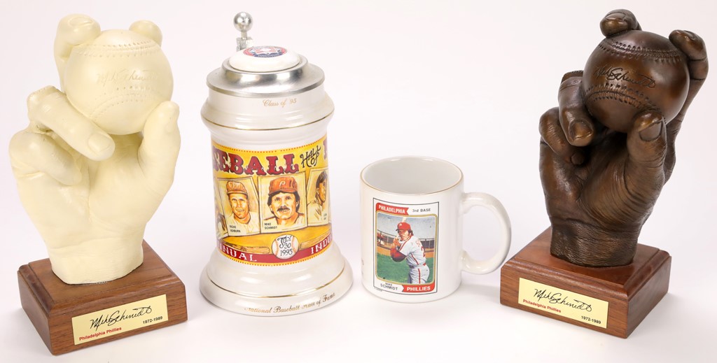 Mike Schmidt collection includes: 1995 HOF induction beer stein (#45); 1988 Gartlan signed plaque; print set "Performers of 1986" signed by Schmidt; 1987 full size Gartlan plate signed by Schmidt; 1972-89 cast of his hand (two different, one plaster, one bronze); 1995 Mike Schmidt 3-coin set w/two silver; signed porcelain baseball cards; Mitchell & Ness jersey; pair of Franklin signed gloves (Mike Schmidt professional models).