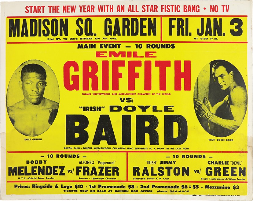 An original January 3, 1968, Madison Square Garden Boxing poster featuring Emile Griffith and Irish Doyle Baird. It measures 21.5x28" and features bright original colors. An unusual item as the bout between Griffith and Baird never transpired due to Griffith having the flu. Condition is Very good due to the approximate 10" water mark starting from the bottom of the poster.