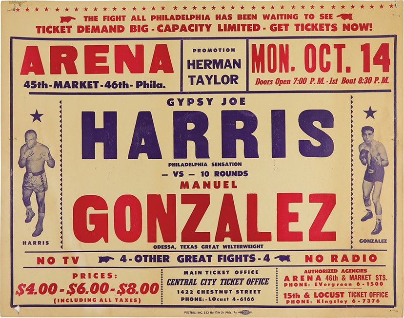 A rare October 14, 1968, Philadelphia boxing poster featuring Gypsy Joe Harris. It measures 22x27.5". It is in Good condition with several holes from hanging and some reinforcement repairs on reverse.