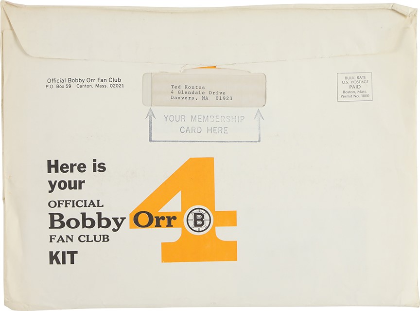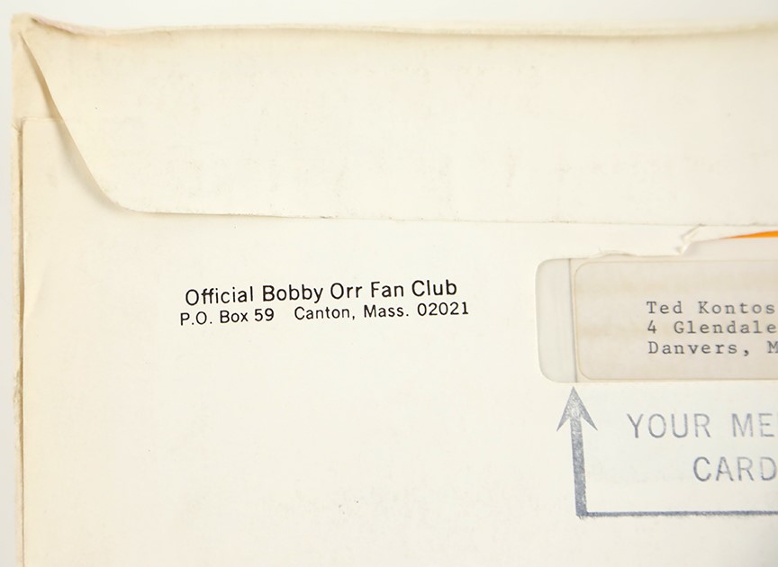 Boston Bruins legend and NHL icon Bobby Orr had no shortage of fans on both sides of the border, and this unopened envelope contains "... your Official Bobby Orr Fan Club kit." Name of the receiver is still in the envelope window on his membership card, but it is a mystery as to exactly what else is inside. Envelope shows wear, nice treasure find of the Hall of Fame defenseman.