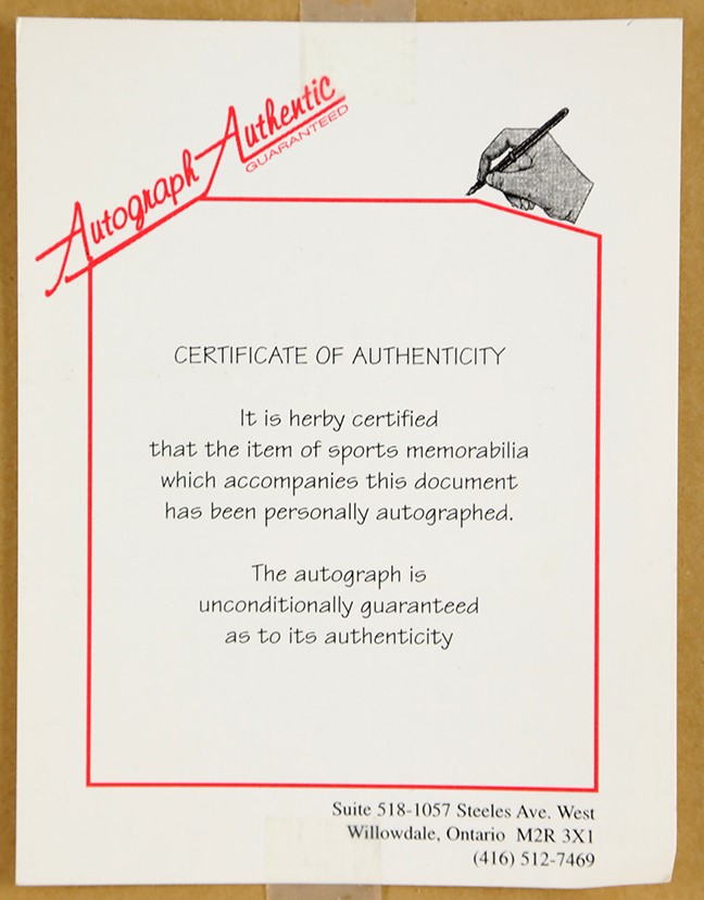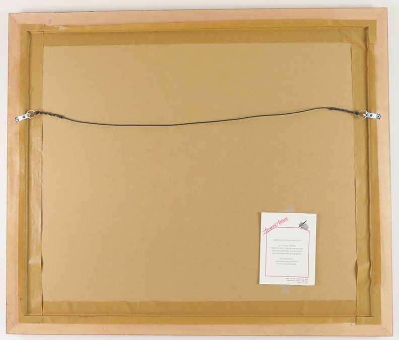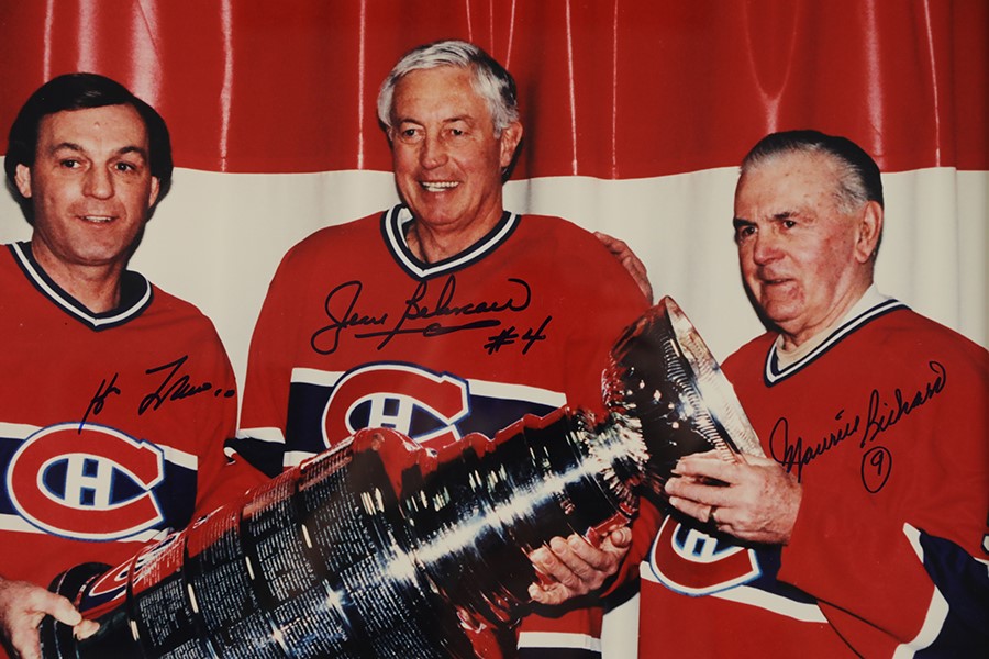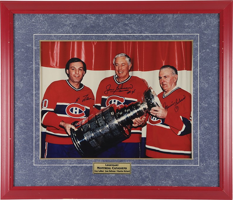 This photo shows what could be called a "Dream Line." The framed photo shows three Hall of Fame superstars of the Montreal Canadiens. If these players could go back to their youth, I'm sure one of the two right wings in the picture (Guy Lefleur on the left and Maurice Richard on the right) would agree to play on the left to flank the great center, Jean Beliveau. Here this magnificent trio holds the Stanley Cup, with which they are all so familiar. Maurice "Rocket" Richard won eight of them, Lafleur won five times, and Beliveau took an astounding 10. All three players scored over 500 goals. Photo is measured at 16x20", framed to 26x30". The frame has some paint chipping. The photo is in Excellent condition. All signatures in black with Richard adding his number 9. This item comes with a Letter of Authenticity certifying the signatures - by Autograph Authentic.