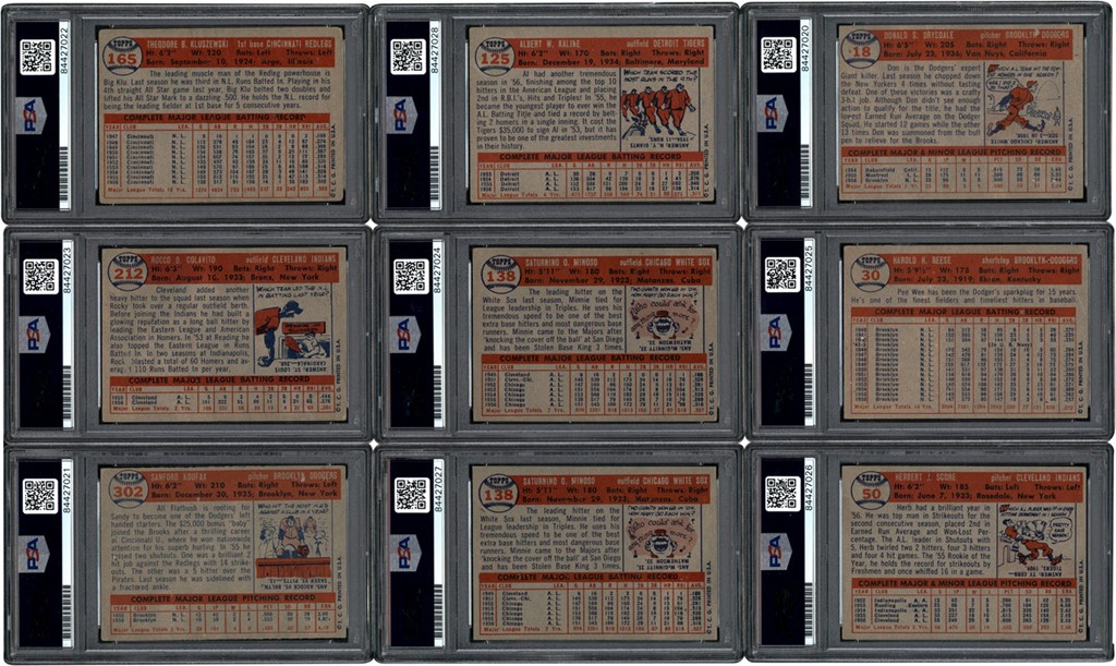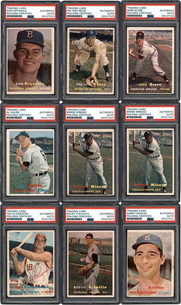 1957 Topps Baseball Autograph collection of (9) cards. All of the autographs have been authenticated and encapsulated by PSA/DNA. The collection includes: #18 Drysdake (R); #30 Reese; #50 Score; #125 Kaline; (2) #138 Minoso; #165 Kluszewski; #212 Colavito (R); and #302 Koufax.