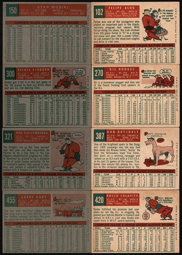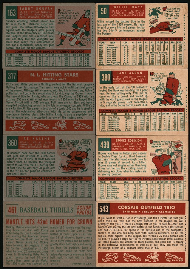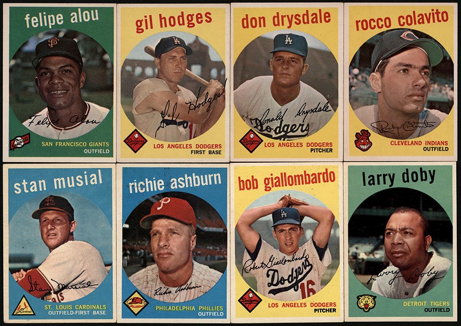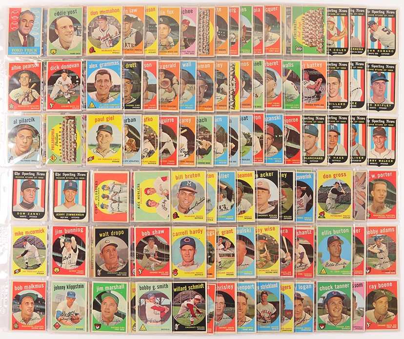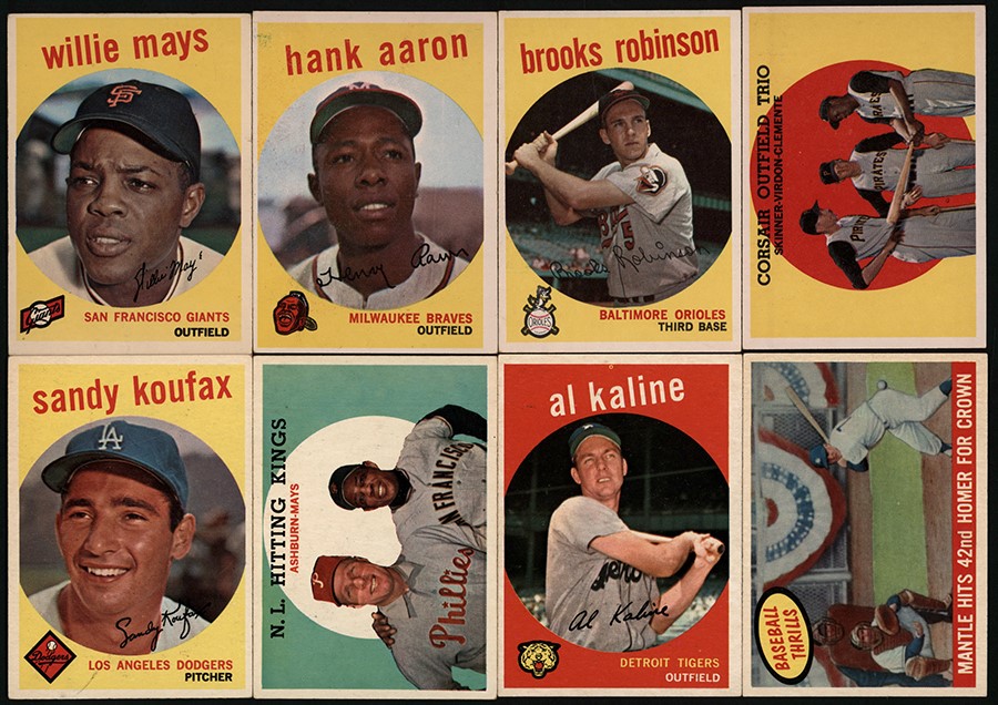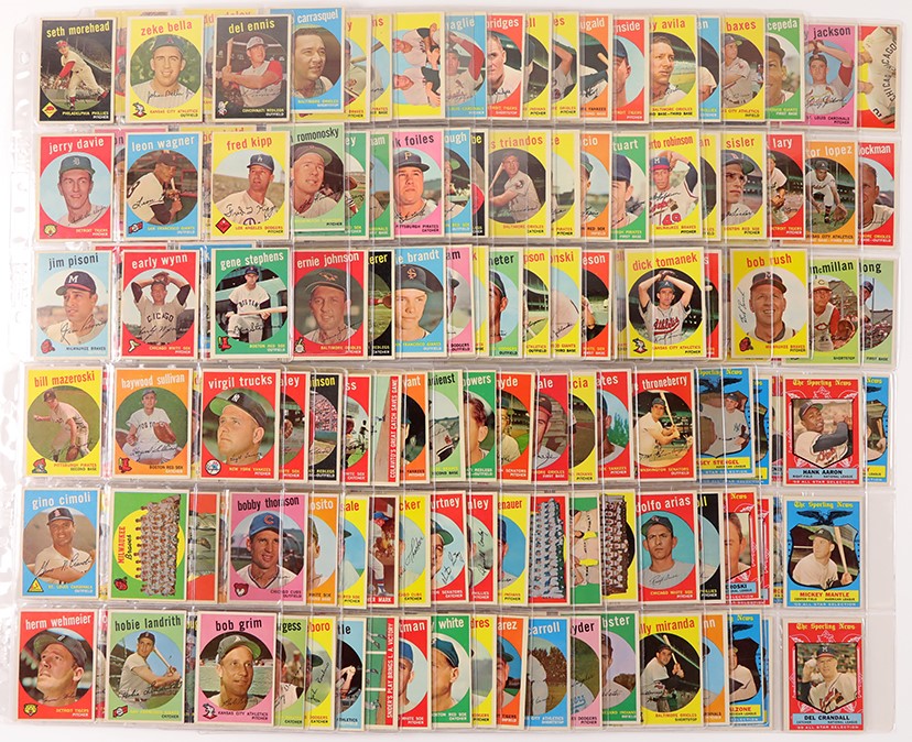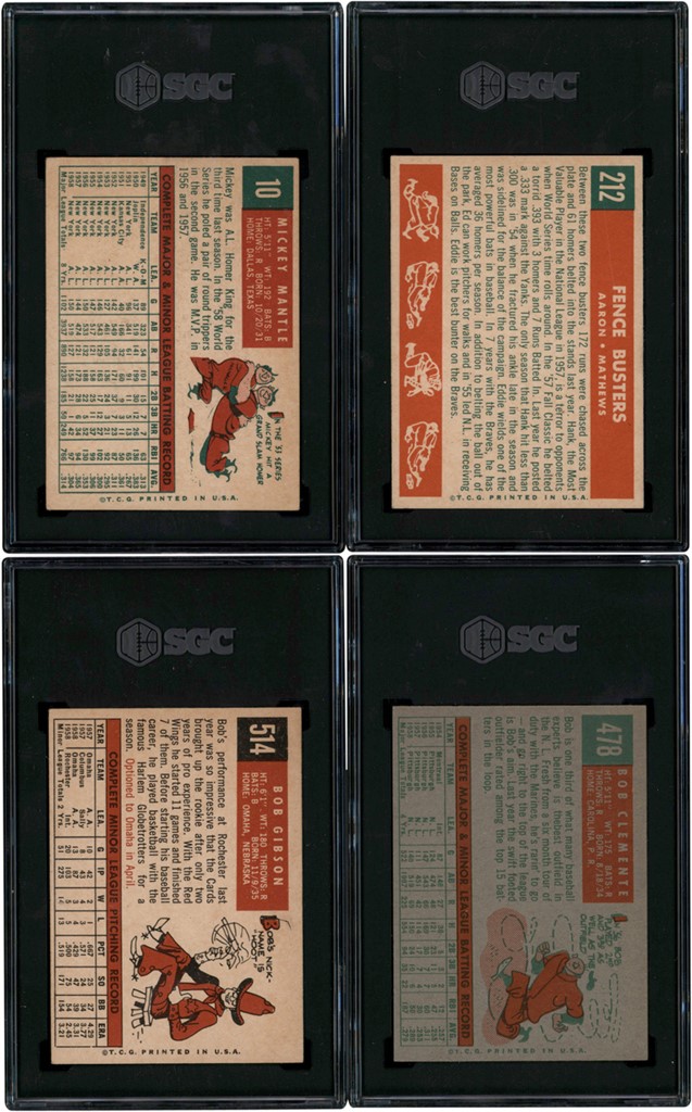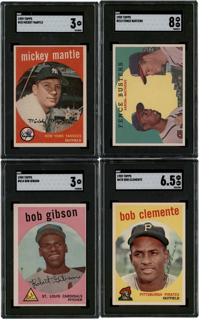 1959 Topps Baseball complete set of (572) cards. Four (4) cards have been graded and encapsulated by SGC with: #10 Mantle VG 3; #212 Fence Busters NM-MT 8; #478 Clemente EX-MT+ 6.5; and #514 Gibson (R) VG 3. Ungraded highlights include: #1 Frick GD; #20 Snider VG; #30 Fox VG-EX; #34 Pitchers Beware VG; #35 Kluszewski VG-EX; #40 Spahn VG; #50 Mays VG-EX; #76 Richardson GD; #90 Skowron GD-VG; #102 F Alou (R) EX-MT (OC); #147 Cub Clubbers GD-sticker on back; #150 Musial VG-EX; #155 Slaughter VG; #163 Koufax VG-EX; #180 Berra VG; #200 Giles FR; #202 Maris VG-EX; #260 Wynn VG; #262 Hitters Foes VG; #270 Hodges VG-EX; #295 Martin VG-EX (MC); #300 Ashburn EX-MT; #306 Gilliam NM; #310 Aparicio VG-EX; #317 NL Hitting Kings VG-EX; #321 Giallombardo-No Option VG-EX; #338 Anderson (R) VG-EX; #345 McDougald EX; #349 Wilhelm GD; #350 Banks VG; #352 Roberts VG-EX; #360 Kaline EX; #380 Aaron VG-EX; #387 Drysdale VG-EX; #390 Cepeda VG; #395 Howard VG (MC); #408 Keystone Combo VG-EX; #415 Mazeroski VG-EX; #420 Colavito EX; #430 Ford EX-MT (OC); #435 F Robinson VG-EX; #439 B Robinson EX; #450 Mathews VG-EX; #455 Doby NM; #461 Mantle Homers VG-EX; #464 Mays Catch EX (OC); #467 Aaron Homer EX-MT (OC); #470 Musial 3000 Hits VG-EX; #480 Schoendienst EX-MT (OC); #509 Cash (R) VG-EX; #510 Yankees TC GD-marked; #515 Killebrew VG-EX; #543 Corsair Trio VG-EX; #550 Campanella VG-EX; #561 Aaron AS VG; #563 Mays AS VG-EX; #564 Mantle AS VG; #572 Pierce AS VG-EX. Overall condition breakdown is 10% GD or lesser; 20% VG; 40% VG-EX; 20% EX; 10% EX-MT.