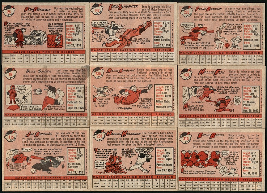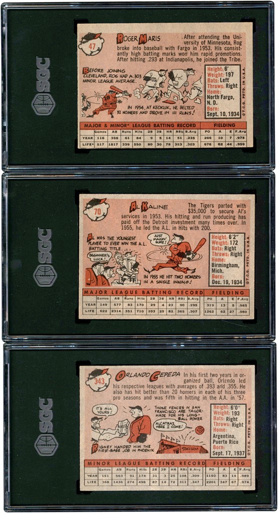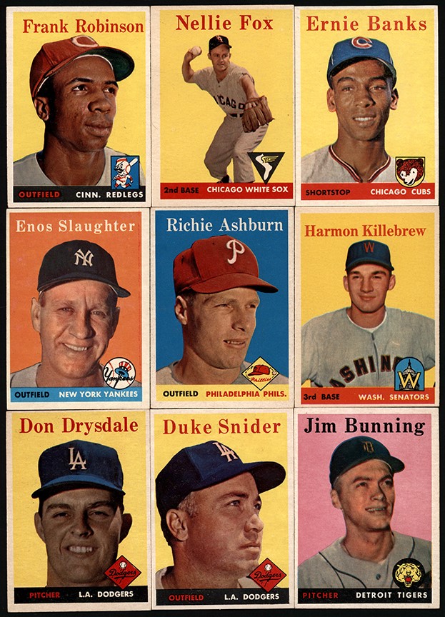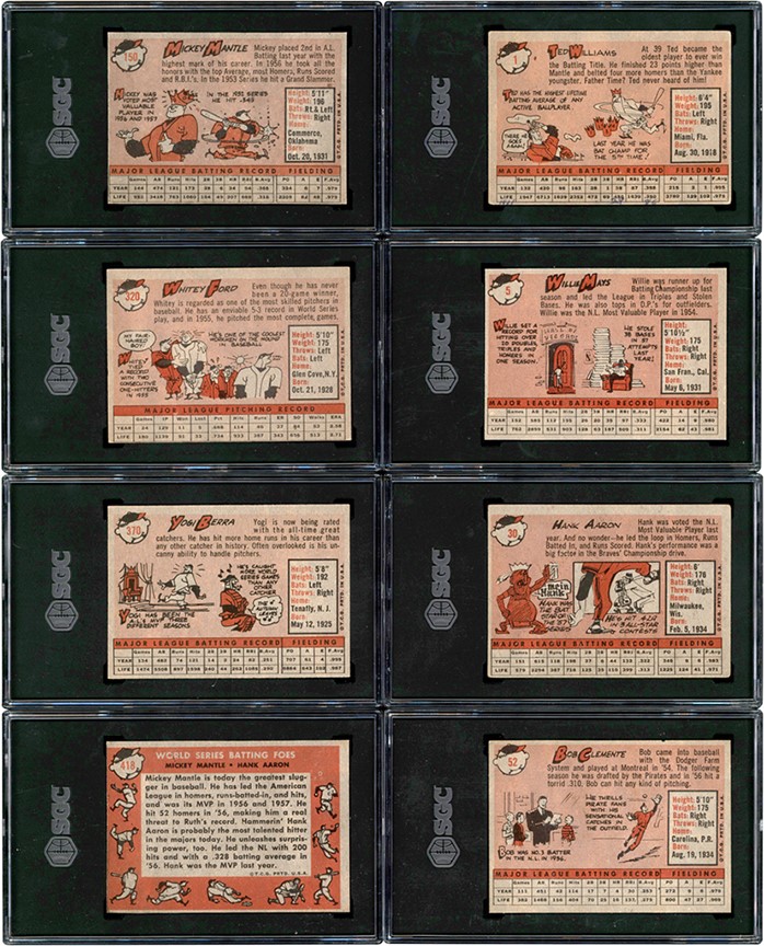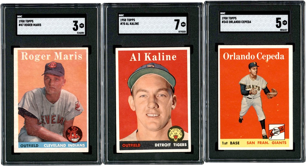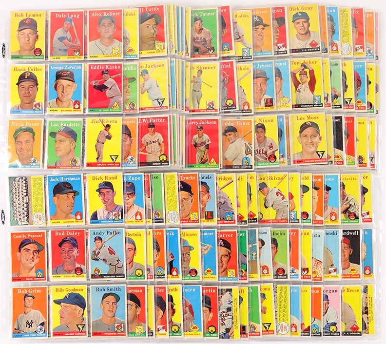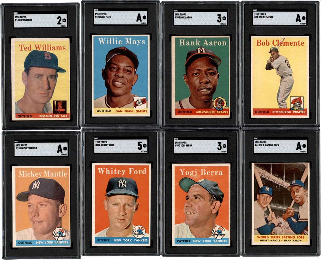 1958 Topps Baseball partial set of (382/494) cards. Eleven (11) cards have been graded and encapsulated by SGC with: #1 Williams GD 2; #5 Mays Authentic; #30 Aaron VG 3; #47 Maris (R) VG 3; #52 Clemente Authentic; #70 Kaline NM 7; #150 Mantle Authentic; #320 Ford EX 5; #343 Cepeda (R) EX 5; #370 Berra VG 3; #410 Batting Foes Authentic. Ungraded highlights include: #2 Lemon VG; #9 Bauer EX; #20 McDougald EX; #25 Drysdale EX; #40 Kell VG; #70 Kaline VG-short; #71 Dodgers TC VG-EX (OC); EX-MT; #90 Roberts VG-EX; #100 Wynn VG-EX; #101 Richardson EX; #115 Bunning EX; #120 Podres EX; #142 Slaughter EX; #162 Hodges VG-EX-short; #178 Kluszewski VG-EX; #190 Schoendienst VG; #230 Ashburn EX; #238 Mazeroski VG-EX; #240 Skowron EX; #246 Yankees TC EX (OC); #258 Erskine VG-EX; #270 Spahn EX-MT (OC); #271 Martin EX-MT (OC); #275 Howard EX; #288 Killebrew EX; #285 F Robinson EX; #300 Commissioners VG-EX; #310 Banks EX-MT; #307 B Robinson VG-EX; #324 Wilhelm EX; #368 Colavito VG-EX; #375 Reese EX-MT (OC); #400 Fox EX; #436 Fence Busters VG-EX; #440 Mathews VG-EX. Overall condition breakdown is 10% GD; 10% VG; 30% VG-EX; 40% EX; 10% EX-MT.