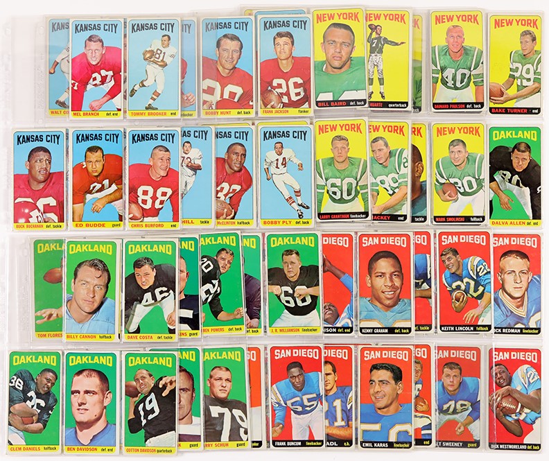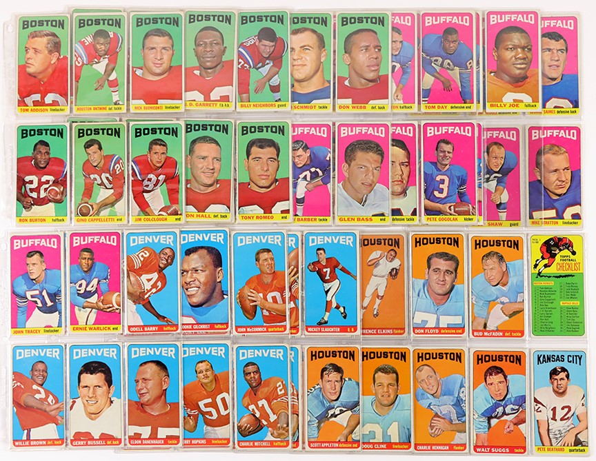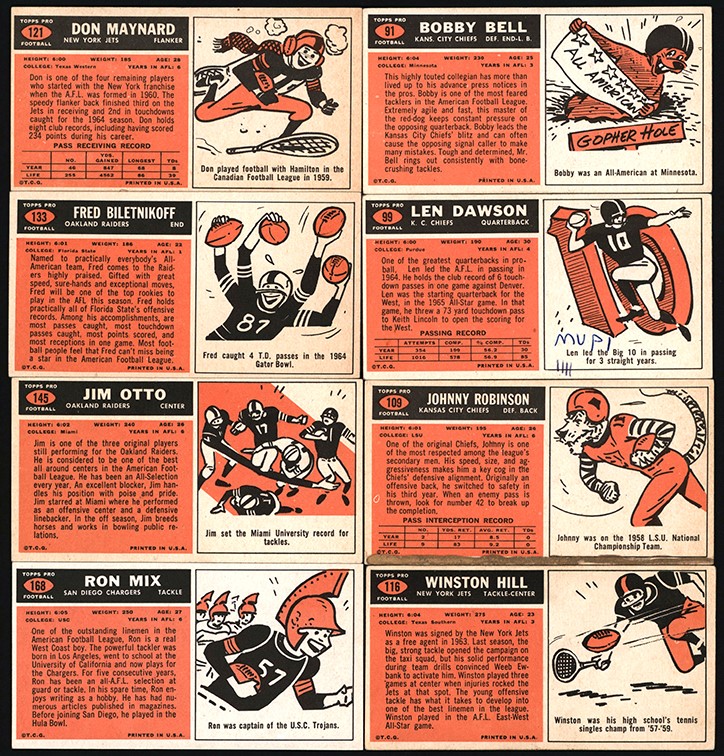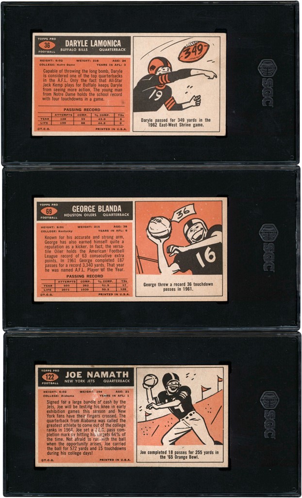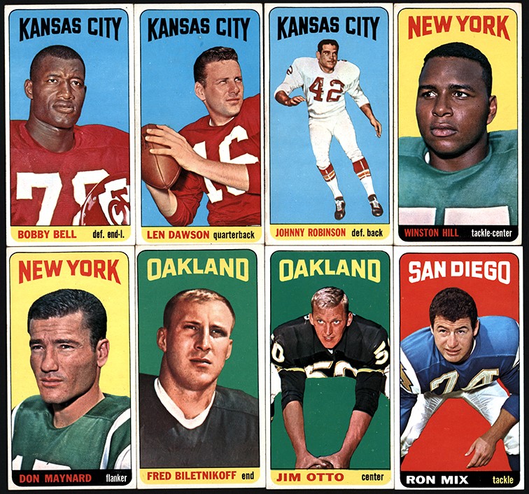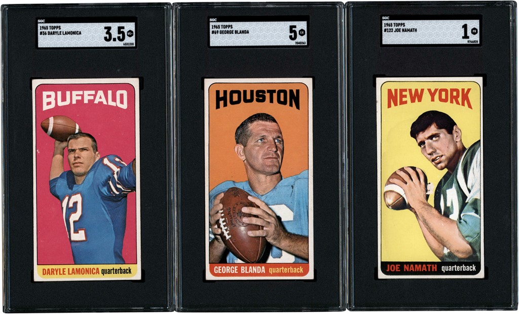 1965 Topps Football complete set of (176) cards. (3) cards have been graded and encapsulated by SGC with: #36 Lamonica VG+ 3.5; #69 Blanda EX 5; #122 Namath (R) PR 1. Ungraded highlights include: #1 Addison VG; #3 Buoniconti PR; #35 Kemp VG; #46 W Brown (R) GD; #51 Gilchrist FR; #87 Checklist-unmarked GD-VG; #91 Bell VG; #94 Buchanan GD; #99 Dawson VG-EX; #109 Robinson VG-EX; #116 Hill (R) VG; #121 Maynard VG-EX; #133 Biletnikoff (R) VG; #137 Davidson (R) GD; #139 Flores VG (MC); #145 Otto VG-EX; #155 Alworth EX (MC); #168 Mix EX. Overall condition breakdown is 20% FR or lesser; 20% GD; 30% VG; 25% VG-EX 5% EX.