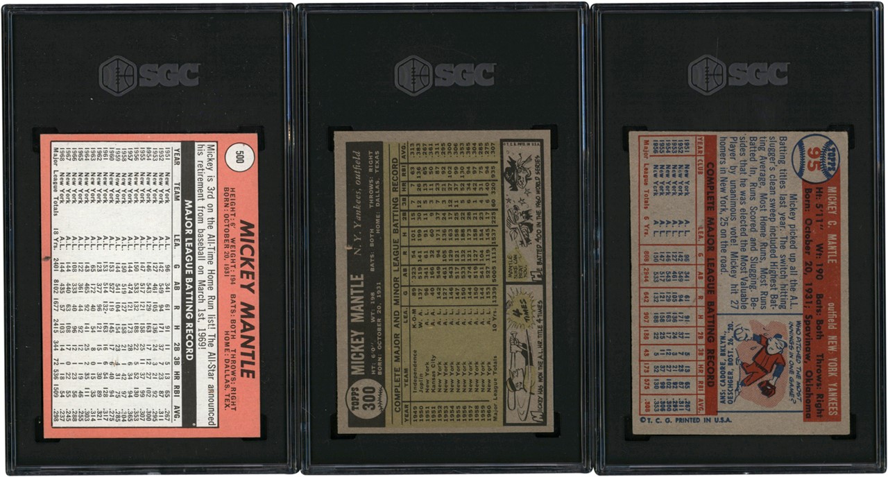 1957-1969 Topps baseball Mickey Mantle collection of (3) cards. All of the cards have been graded and encapsulated by SGC. The collection includes: 1957 #95 VG 3; 1961 #300 EX-MT 6; and 1969 #500 NM 7.