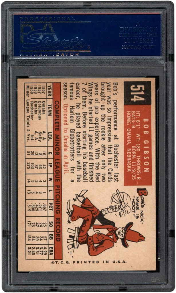 1959 Topps #514 Bob Gibson. Graded NM 7 by PSA. Bob Gibson's rookie card is one of the keys to the 1959 Topps set and has always been popular with collectors. The card is just slightly off center to the left and top, but displays strong corners, bright colors, clean surfaces, and bold printing. An extremely attractive high-grade example of this desirable Hall of Famer rookie card from Topps' final issue of the decade.