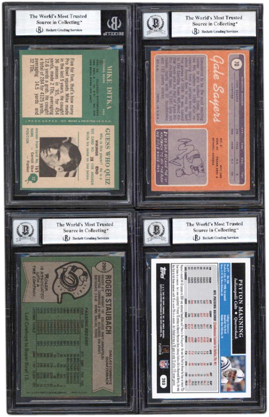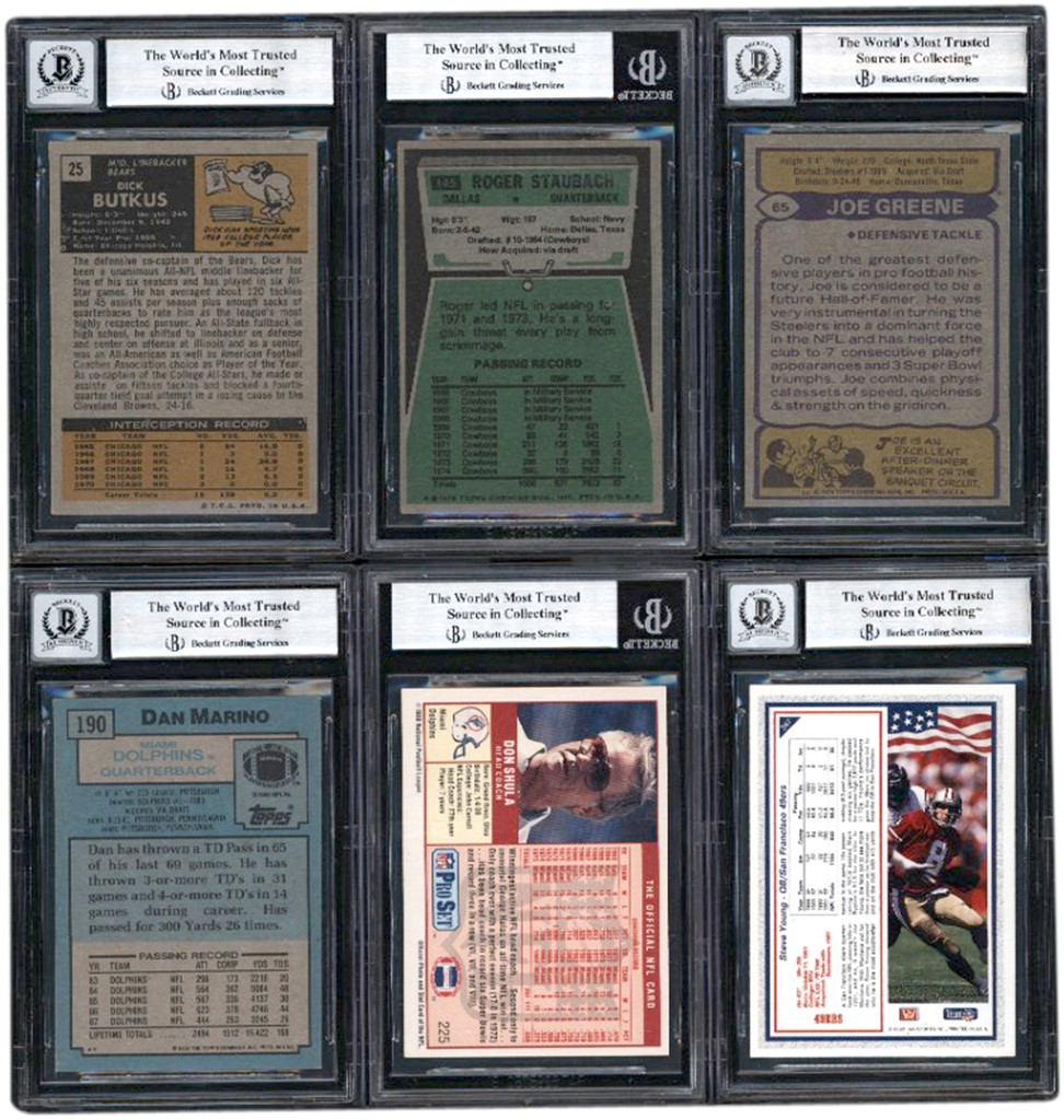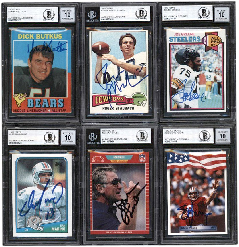 1966-2005 Autographed Football collection of (10) cards. All of the autographs have been authenticated and encapsulated by Beckett. The collection includes: 1966 Philadelphia #32 Mike Ditka (R); 1970 Topps #70 Gale Sayers-auto grade 10; 1971 #25 Dick Butkus-auto grade 10; 1975 Topps #145 Roger Staubach; 1978 Topps #290 Roger Staubach-auto grade 10; 1979 Topps #65 Joe Greene-auto grade 10; 1988 Topps #190 Dan Marino-auto grade 10; 1989 Pro Set #225 Don Shula; 1992 All World #247 Steve Young-auto grade 10; 2005 Topps #203 Peyton Manning-auto grade 10.