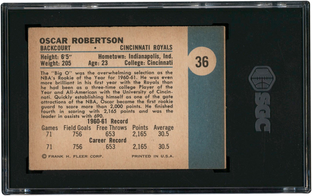 1961-1962 Fleer Basketball #36 Oscar Robertson (R) card.  The card has been graded and encapsulated by SGC EX 5.  The card has rich, deep coloring and a sharp image of Robertson.  All four corners have slight touches and the card is off center left to right as is common for this issue.  The edges are smooth while the reverse has some edge toning but is otherwise defect free. A fine example of Robertson's rookie card.