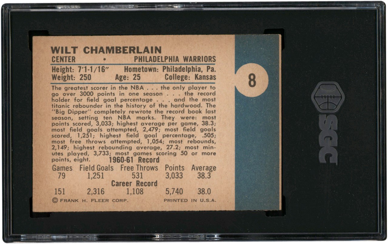 1961-1962 Fleer Basketball #8 Wilt Chamberlain (R) card. The card has been graded and encapsulated by SGC EX-MT 6. The card has vivid coloring and a clear image of Chamberlain. It has good centering and fairly smooth edges. All four corners have slight touches. The reverse has light edge toning but is otherwise defect free. A solid example of one of basketball's most desirable rookie cards.