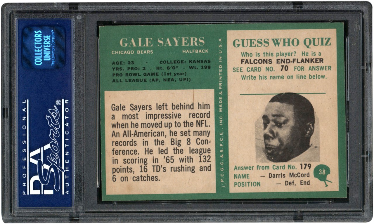 1966 Philadelphia Football #38 Gale Sayers Rookie Card. Graded NM-MT 8 by PSA. To date, PSA has graded 2,715 examples of Sayers' 1966 Philadelphia rookie card. Of that total, only 49 have been graded higher than the offered example. This is an outstanding high-grade Sayers rookie card, which is also one of the keys to the popular 1966 Philadelphia Football set.