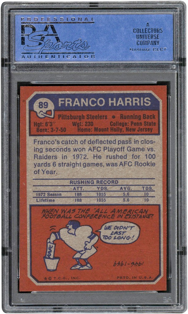 1973 Topps Football #89 Franco Harris Rookie Card. Graded MINT 9 by PSA. To date, PSA has graded 2,306 examples of Harris' 1973 rookie card. Of that total, ONLY 1 has been graded higher than the offered example. This is an outstanding high-grade Franco Harris rookie card that would represent an upgrade for nearly every 1973 Topps Football set in the hobby.