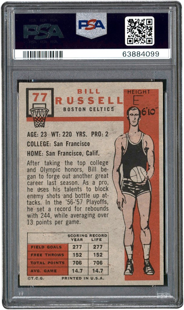 1957-1958 Topps Basketball #77 Bill Russell (R) card. The card has been graded and encapsulated by PSA EX-MT 6. The card has a bright, vivid, and clear image of Russell with a clean surface. The corners are fairly sharp while the edges appear smooth. The card is slightly off center left to right as well as top to bottom. The reverse is clean with no visible defects. A very nice example of this desirable basketball rookie card.