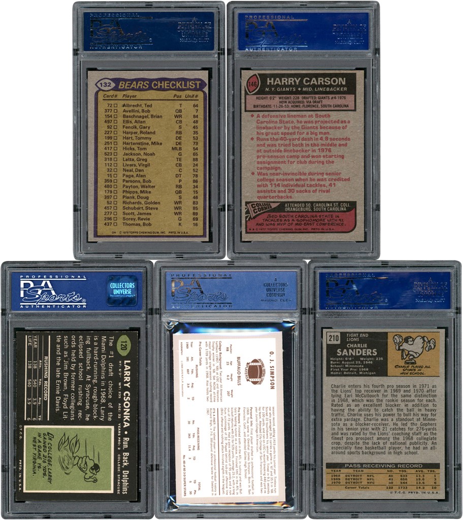 All PSA graded Hall of Fame collection includes five (5) outstanding examples including 1969 Topps #120 Larry Csonka NM MT 8; 1970 Kellogg's #48 O.J. Simpson MINT 9; 1971 Topps #210 Charlie Sanders NM 7; 1977 Topps #146 Harry Carson NM MT 8; and 1979 Topps #132 Chicago Bears Team Leaders w/Walter Payton MINT 9.