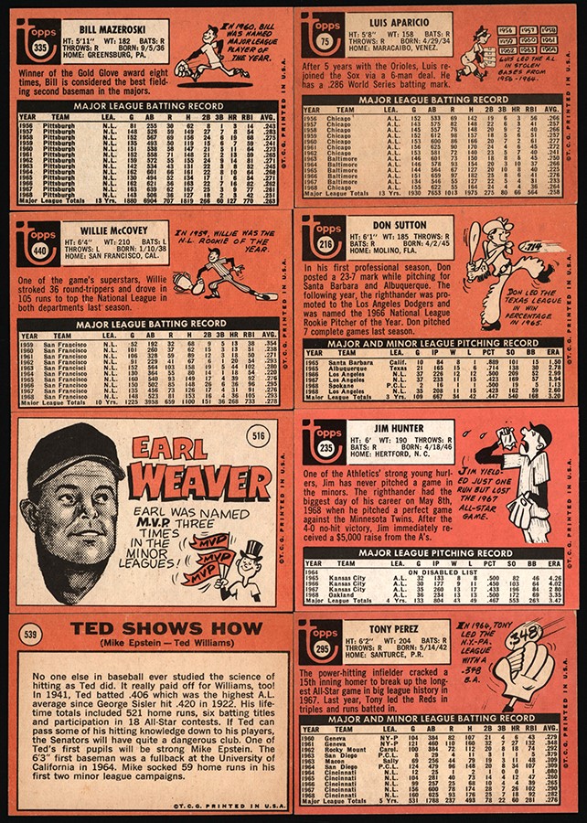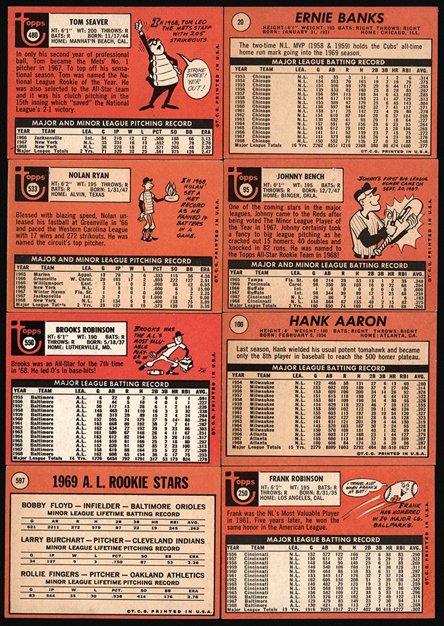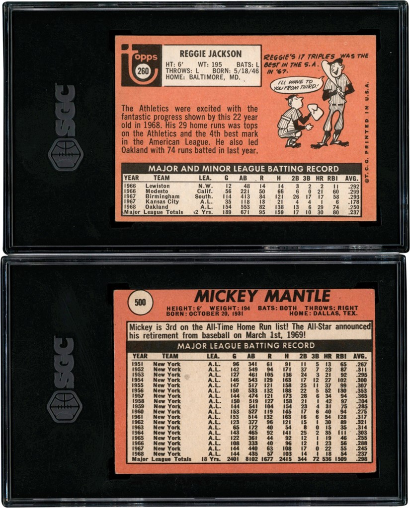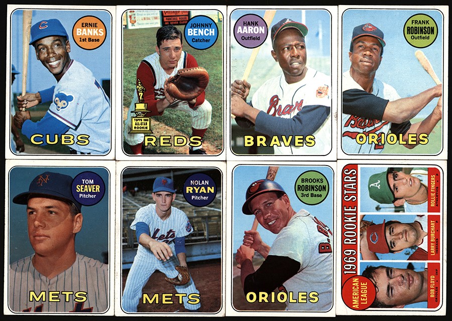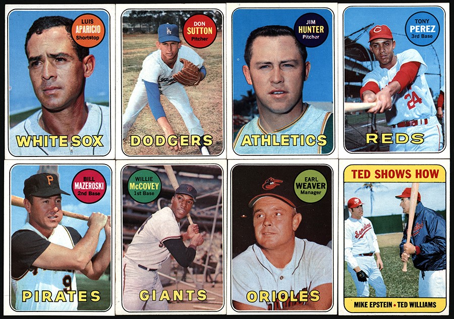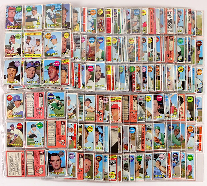 1969 Topps Baseball complete set of (664) cards.  (2) cards have been graded and encapsulated by SGC with: #260 R Jackson (R) EX 5 and #500 Mantle GD 2.  Ungraded highlights include: #2 VG; #130 Yastrzemski GD; #147 Durocher VG-EX; #175 Bunning VG-EX; #190 Mays 0 Banks EX; #24 Alston EX-MT; #35 Morgan EX (MC); #50 Clemente GD-VG; #75 Aparicio EX; #85 Brock GD; #95 Bench VG-EX; #99 Nettles (R) VG; #100 Aaron VG-EX; #120 Rose; #130 Yastrzemski GD; #147 Durocher VG-EX; #175 Bunning VG-EX; #190 Mays VG; #200 Gibson VG-EX; #216 Sutton EX; #235 Hunter EX; #237 Cox (R) VG; #250 F Robinson EX; #255 Carlton VG; #290 Kaat VG; #295 Perez EX; #311 Lyle (R) VG-EX; #335 Mazeroski EX; #255 Niekro VG-EX (MC); #370 Marichal VG-EX; #375 Killebrew VG; #385 Cepeda VG-EX; #400 Drysdale VG; #410 Kaline VG-EX (MC); #412 Checklist-Mantle VG; #416 McCovey AS VG-EX; #419 Carew AS EX (MC); #420 Santo AS VG-EX; #421 B Robinson AS VG-EX; #424 Rose AS VG-EX; #425 Yastrzemski AS VG-EX; #427 Oliva AS EX; #428 Brock AS VG-EX; #430 Bench AS VG; #432 Gibson AS VG; #440 McCovey VG-EX; #450 B Williams EX (OC); #460 Torre VG; #462 Schoendienst VG-EX; #480 Seaver VG-EX; #485 G Perry VG; #510 Carew EX (MC); #516 Weaver (R) EX-MT; #527 Lopez EX; #533 Ryan GD; #539 Ted Shows How EX; #545 Stargell VG; #550 B Robinson EX; #564 Hodges EX; #565 Wilhelm VG-EX; #570 Santo GD; #572 Giant Heroes VG-EX; #573 Palmer VG-EX; #597 Fingers (R) VG-EX; #600 Oliva VG-EX; #630 Bonds (R) VG; #640 Jenkins EX; #650 T Williams VG-EX.  Overall condition breakdown is 10% GD; 30% VG; 40% VG-EX; 20% EX.