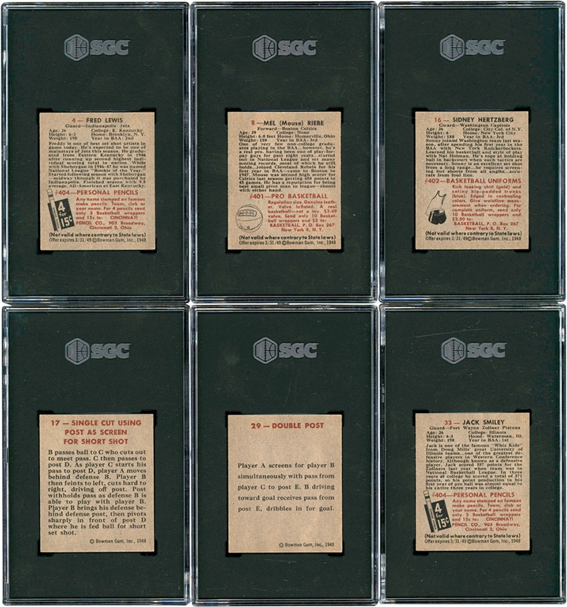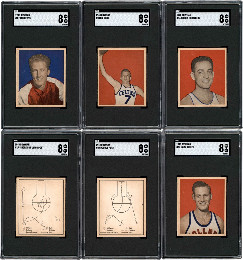 1948 Bowman Basketball collection of (9) cards. All of the cards have been graded and encapsulated by SGC with: #1 Calverley (R) NM-MT 8; #4 Lewis NM-MT 8; #8 Riebe NM-MT 8; #9 Phillip (R) NM-MT 8; #10 Davies (R) NM-MT 8; #16 Hertzberg NM-MT 8; #17 Single Cut NM-MT 8; #29 Double Post NM-MT 8; #33 Smiley NM-MT 8.