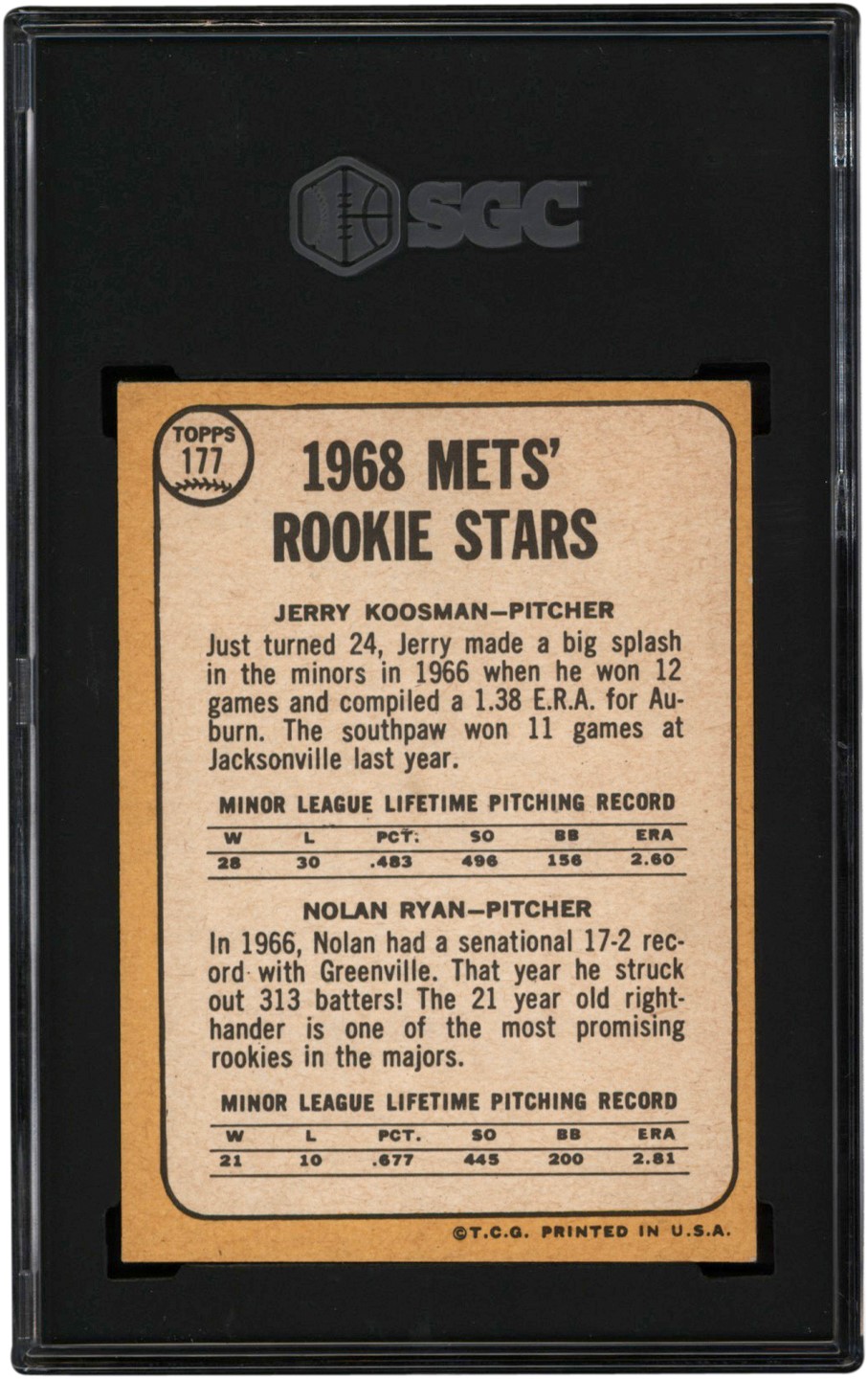 1968 Topps Baseball #177 Nolan Ryan (R) card. The card has been graded and encapsulated by SGC EX-MT 6. The card has a bright, clear image of Ryan with rich coloring. It has very light touches to both left corners while the right corners are sharp. It is slightly off center left to right with a small dimple in the bottom of the Mets logo. The reverse is defect free. A nice Ryan rookie example.