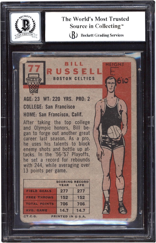 1957-1958 Topps Basketball #77 Bill Russell rookie card flawlessly signed by Russell in blue Sharpie on the front. Beckett has encapsulated the card and graded the signature GEM MINT 10. The card displays light creasing and both edge and corner wear, none of which significantly detract from its overall visual appeal. Russell's 1957 Topps rookie card is not only his most popular card, but one of the most iconic sports cards ever issued. Not surprisingly, signed examples are scarce and seldom seen at auction. This is the just the second signed Russell rookie card we have ever offered and one that would be a prize addition to any advanced basketball card or autograph collection.