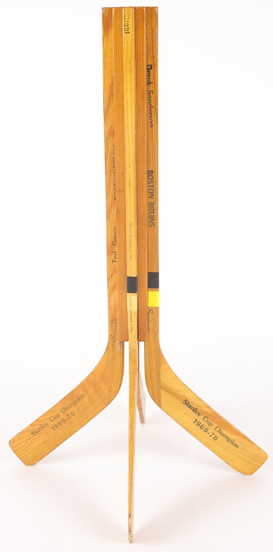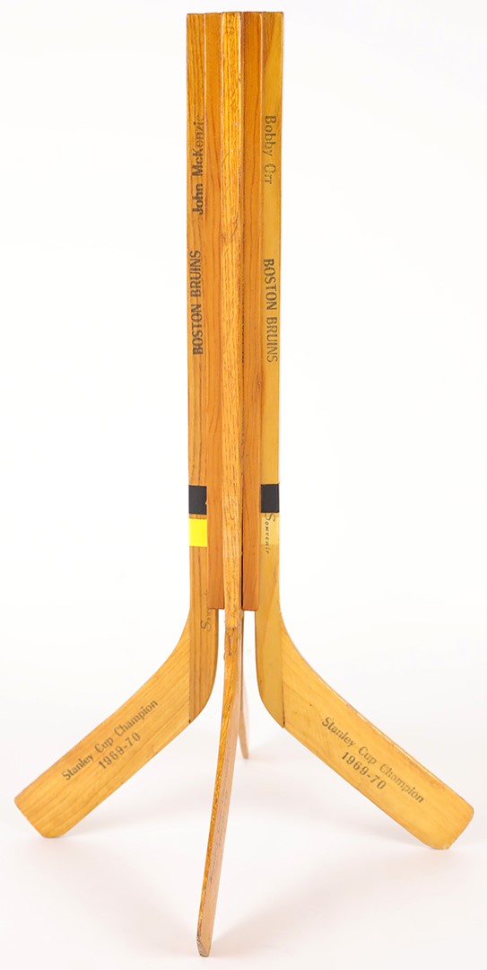Presented is an unusual item: a lamp base made from miniature hockey sticks. The four wooden sticks are labeled John McKenzie, Ted Green, Bobby Orr. and Derek Sanderson. On the blade of each stick is imprinted, "Stanley Cup Champion 1969-70." The lamp base is 21" tall and has a diameter of 12".