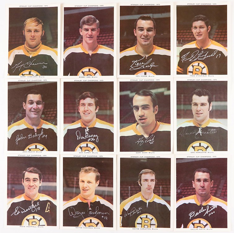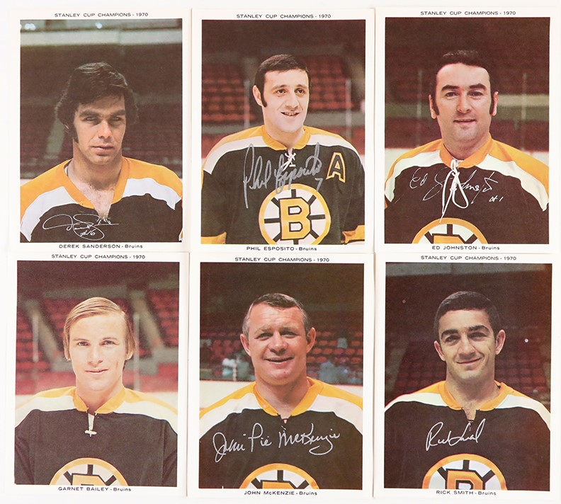 There are also 18 different color 6x8" photos of the 1969-1970 Stanley Cup Champion Boston Bruins. Some people consider this team as the best hockey team of all-time. The high scoring Bruins had the NHL's points leader in Bobby Orr, who tallied 120 points, on 33 goals and 87 assists. It was the first time in history that a defenseman had scored over 100 points and Orr's 33 goals was also a record for a backliner. Phil Esposito added 99 points on 43 goals and 56 assists. The team included four Hall of Famers: Bobby Orr, Phil Esposito, Johnny Bucyk, and Gerry Cheevers. Two of the photos are unsigned: Bobby Orr and Garnet Bailey. The other 16 photos are signed, each in silver. The signed photos are: Derek Sanderson; Gerry Cheevers; Ken Hodge; John Bucyk; Don Awrey; Don Marcotte; Gary Doak; Eddie Westfall; Wayne Cashman; Wayne Carlton; Fred Stanfield; Dallas Smith; John"Pie" McKenzie; Rick Smith; Ed Johnston; and Phil Esposito. A great set of autographed photos from a legendary team.