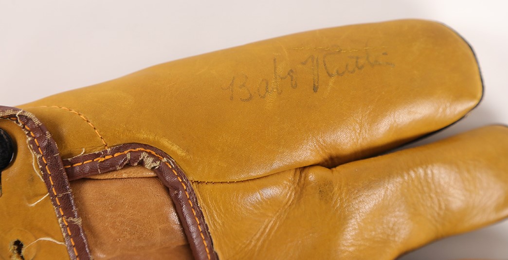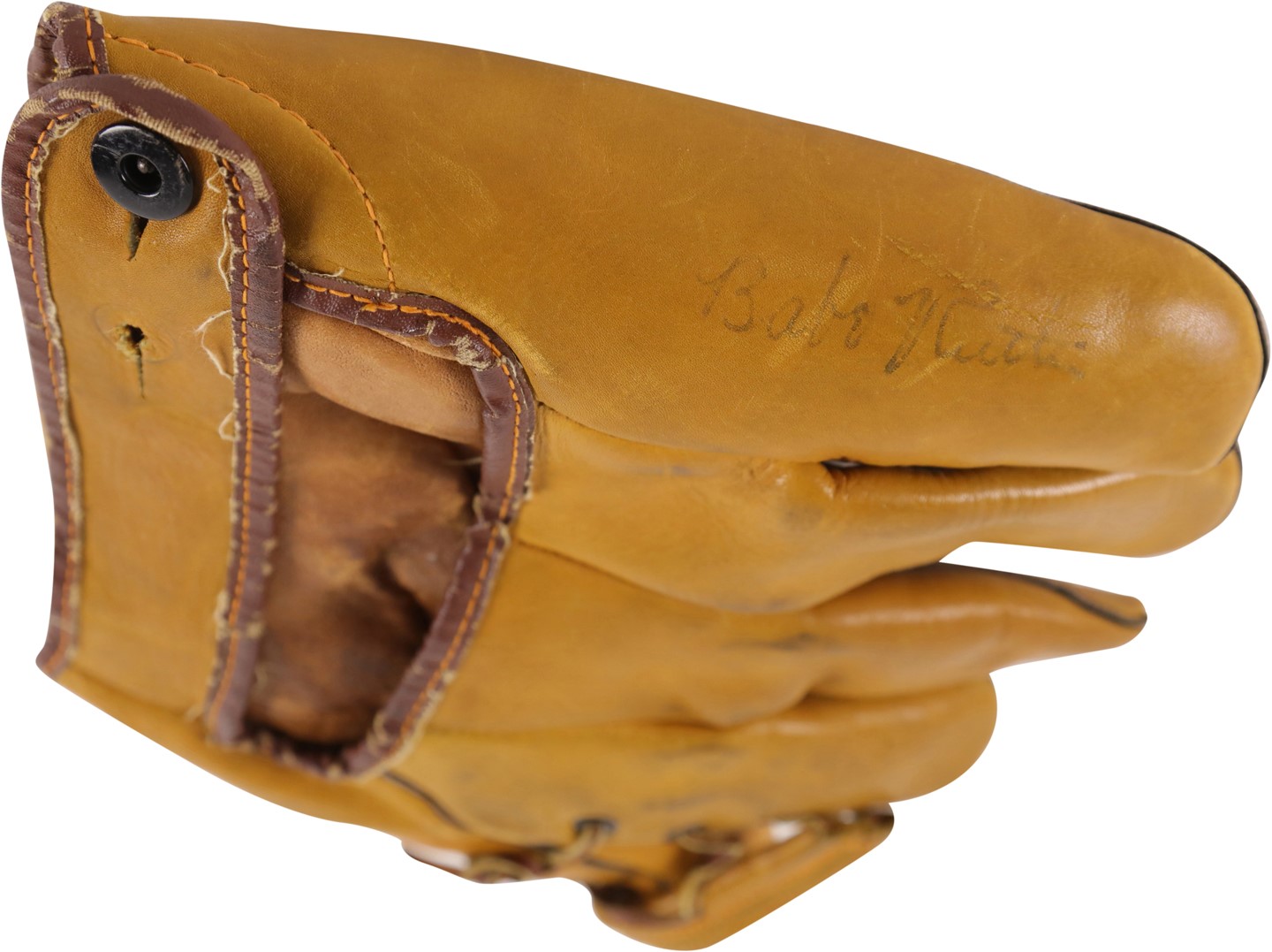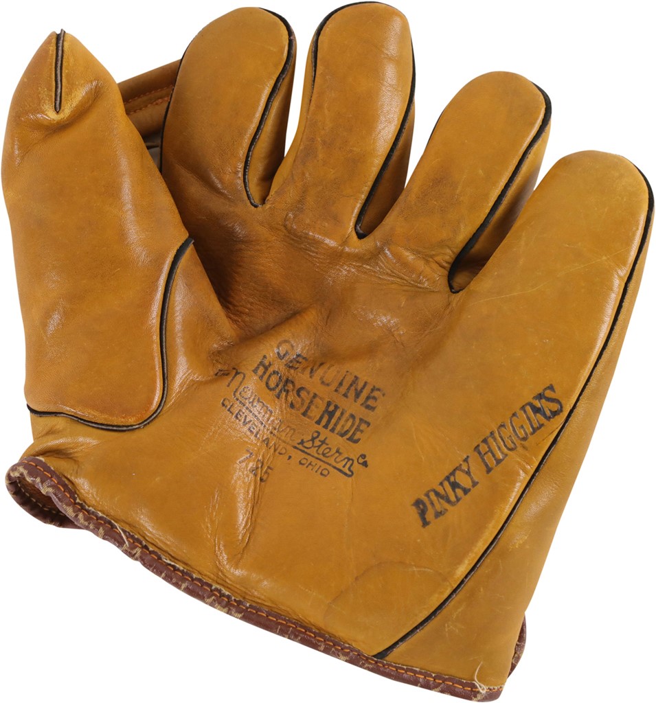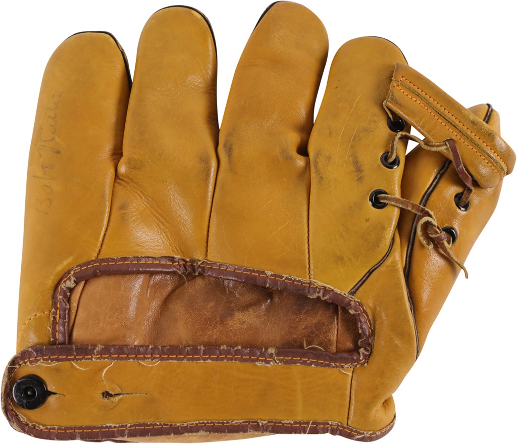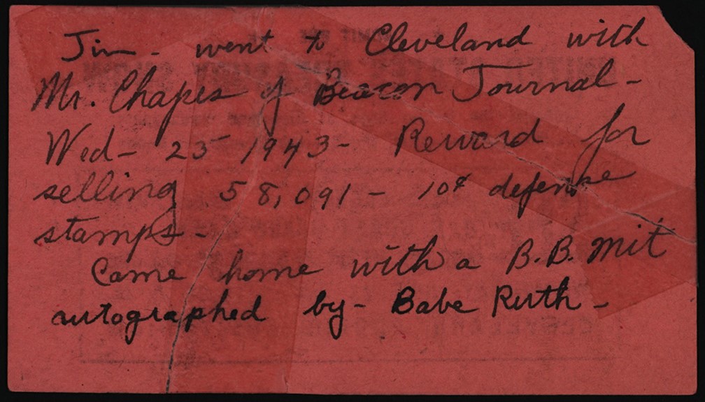 While the world was at war overseas, back in the home-front of the USA, civilians helped the effort by buying war bonds and defense stamps. As the included photocopy of a story in the Akron Beacon Journal newspaper (May 22, 1942) relates, news carriers of the newspaper had sold four million war stamps, more than any other newspaper of comparable size in the country. The article relates that the prize for the carriers was a trip to the June 23,1943 celebration at the Cleveland Public Auditorium. Jim Headley brought his Pinky Higgins model glove, manufactured by The Newman Sterns Co, of Cleveland. The enclosed photo shows the Babe signing the glove right on the spot on glove's pinky finger. Did the Babe sign the pinky finger in fun to match the Pinky Higgins model? A close perusal of the photo shows the Babe signing exactly where his signature resides on this glove. Jim's ticket to the celebration has these words on the verso: "Jim - went to Cleveland with Mr. Chapes of Beacon Jornal - Wed. 25,1943 - Reward for selling 59,091 10 C[ent] defense stamps. Came home with a B.B. mit [sic] signed by Babe Ruth." The Babe was a generous signer of autographs and photos, but very few items signed by Ruth have photos of him signing, and this adds to the glove's value. Gloves signed by Babe Ruth are very scarce. Perhaps many of the gloves he signed were later used so much in play that the signatures became lost to time. Thus, the few remaining gloves signed by Babe Ruth have great, and increasing, value. Jim's glove, after all these years shows only the slightest of wear, consistent with light use, near the stitch trim region. Ruth signed "Babe Ruth" in a clear, neat script with a black fountain pen. The autograph rates about 7/10. Any collection would be enhanced by not only a glove signed by the Babe, but the ONLY Babe Ruth signed glove we know of with a photo of the event.