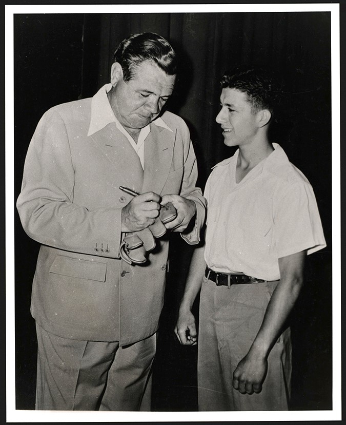 Here is a true story about Babe Ruth, a hard-working newspaper boy from the Midwest named Jim Headley, war time, the boy's glove signed by the Babe, and a photograph recording the event - all of this story is wrapped up an exclusive photo of Babe Ruth signing the glove. Yes, these items transport us back in time to 1942 and 1943 when World War II was ragging, and the sweet story of the newsboy and the Babe stands in startling contrast to the often devasting stories of young men, not much older Jim, in combat. Thankfully, this story, although war related, is one of innocent happiness.