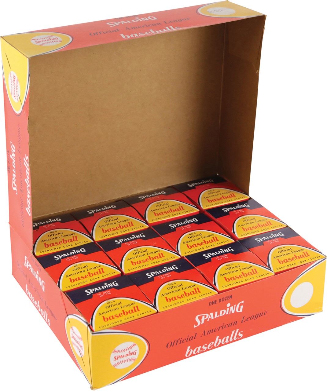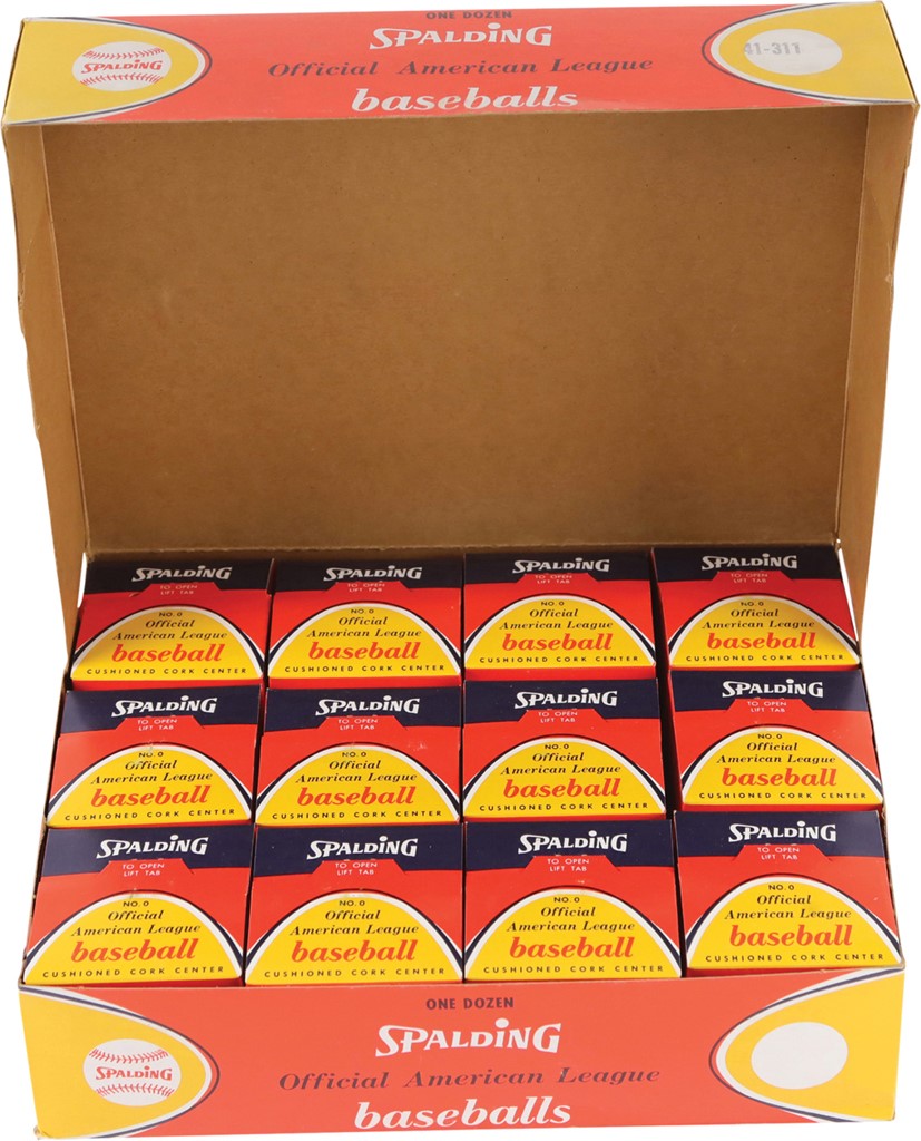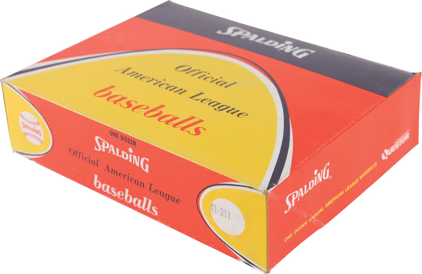 Collection of twelve circa mid-1970s Official American League (MacPhail) baseballs, each still housed in their original sealed box. The balls, in turn, remain housed in their original Spalding twelve-count retail box. Each individual ball box is in overall Near Mint condition. The retail box (11.75x9.25x3") remains in Excellent to Mint condition.