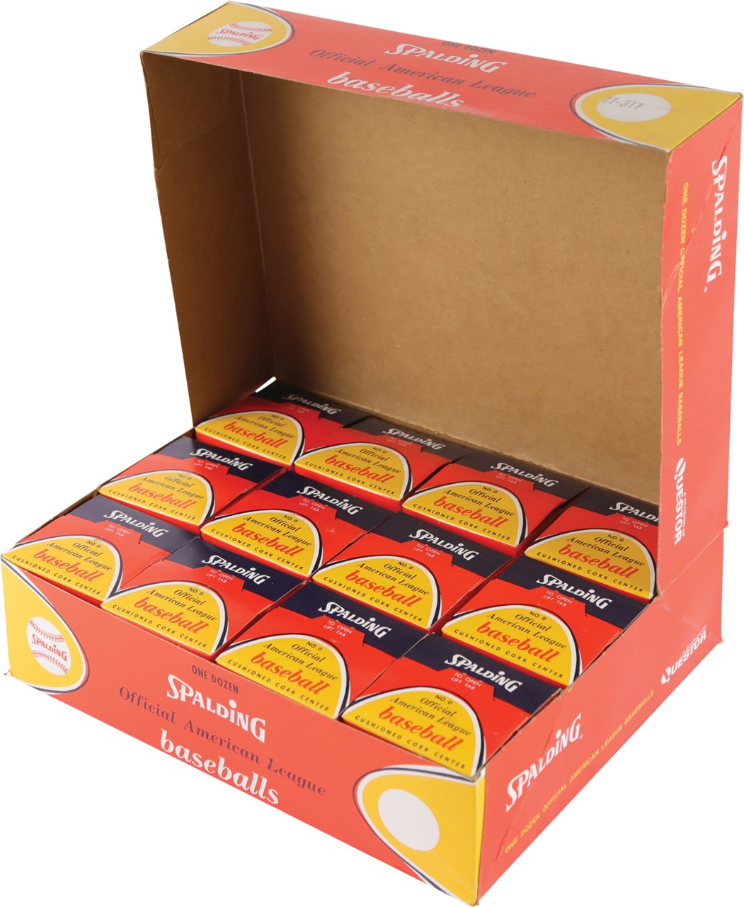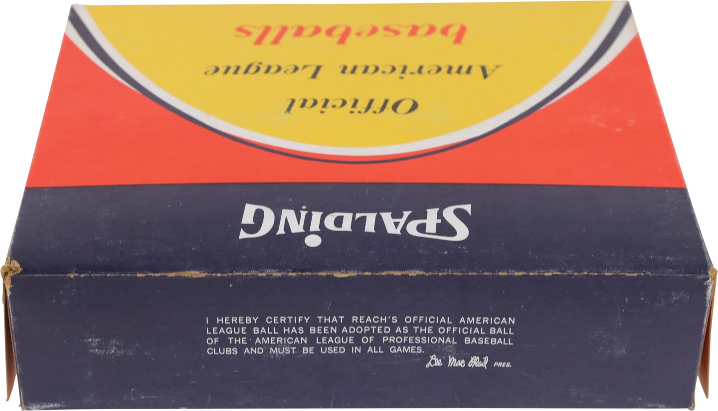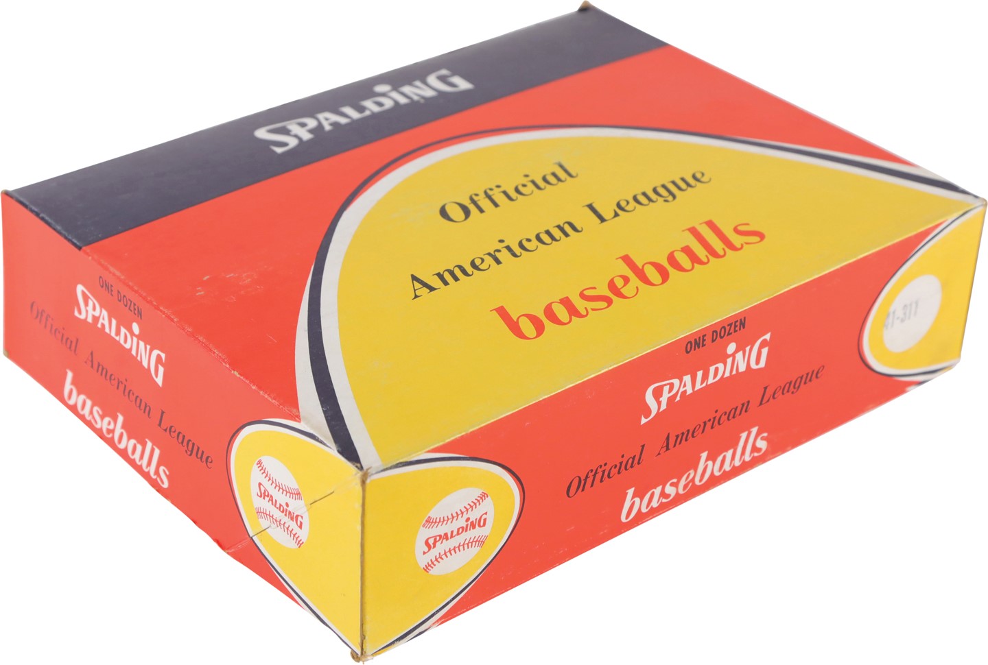 Collection of twelve circa mid-1970s Official American League (MacPhail) baseballs, each still housed in their original sealed box. The balls, in turn, remain housed in their original Spalding twelve-count retail box. Each individual ball box is in overall Near Mint condition. The retail box (11.75x9.25x3") remains in Excellent to Mint condition.