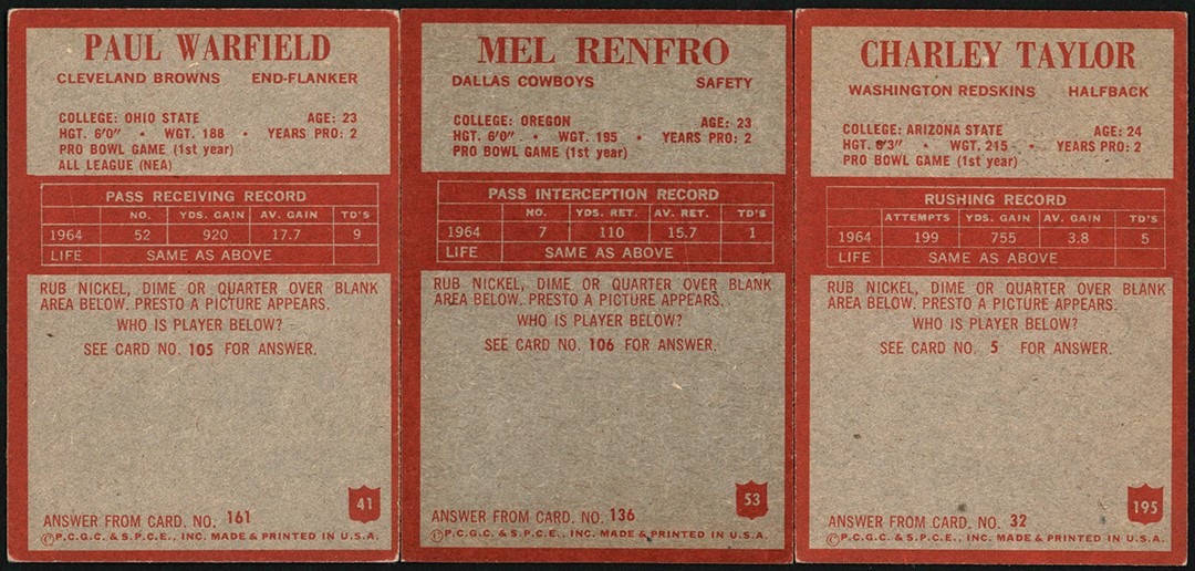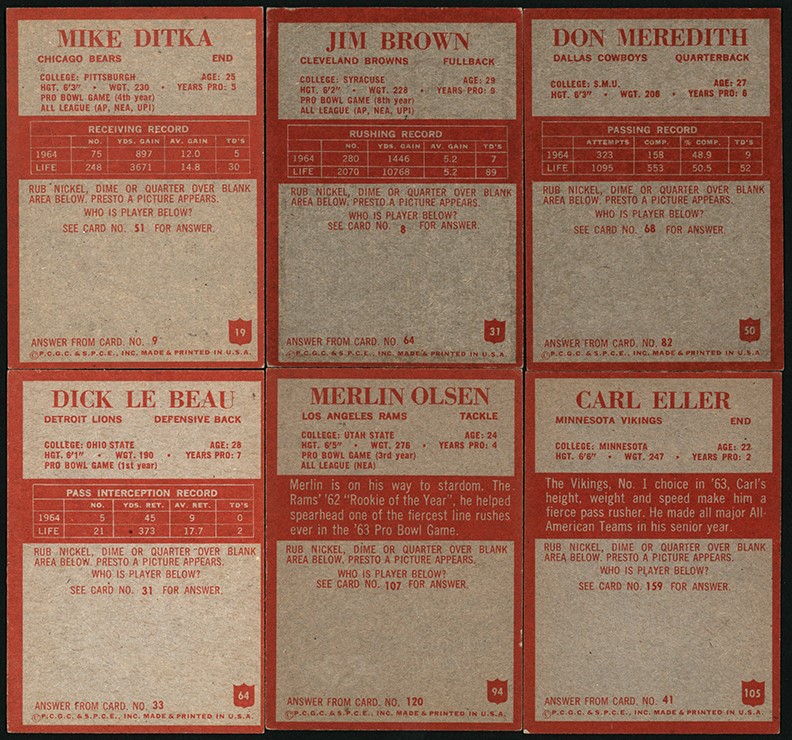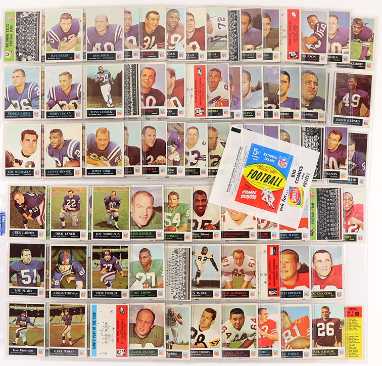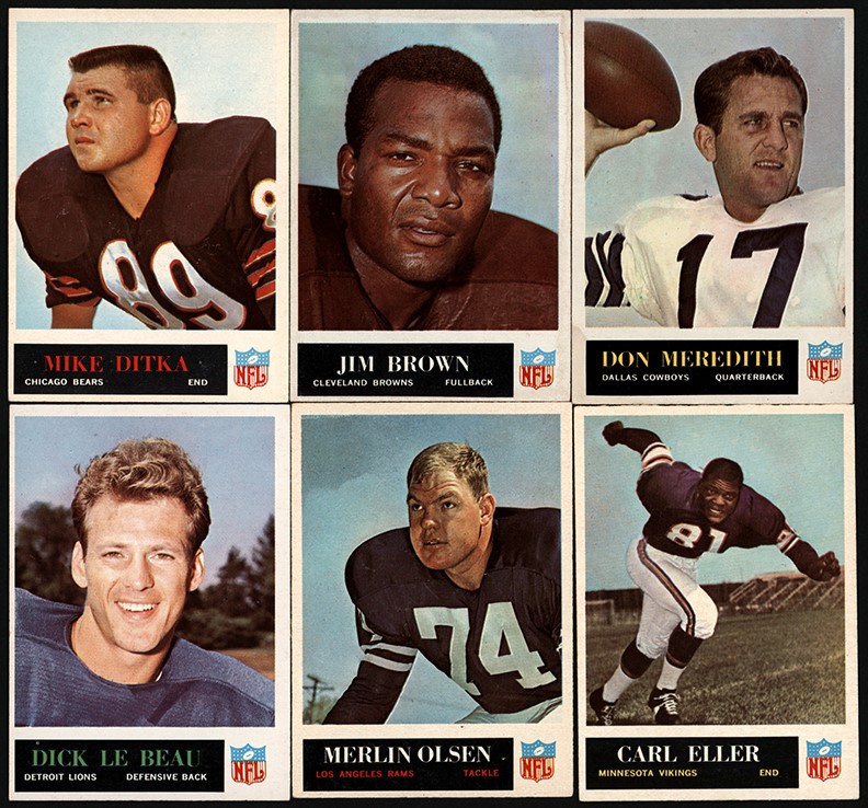 1965 Philadelphia Football complete set of (198) cards. Highlights include: #2 Berry EX; #8 Moore G-VG; #10 Parker EX; #12 Unitas EX-MT (OC); #19 Ditka EX; #31 J Brown VG-EX; #41 Warfield (R) VG; #47 Lilly VG; #50 Meredith EX; #53 Renfro (R) VG-EX; #63 Lary VG-EX; #64 LeBeau (R) EX; #72 Adderly EX; #73 W Davis VG-EX; #75 Gregg EX; #76 Hornung VG-EX; #77 Jordan VG-EX; #79 Nitschke VG; #81 Starr VG-EX; #82 Taylor VG-EX; #83 Wood EX; #89 D Jones VG-EX; #94 Olsen EX; #105 Eller (R) EX; #107 Marshall EX; #110 Tarkenton VG; #111 Tinglehoff VG-EX; #115 R Brown EX; #138 Ringo VG-EX; #147 JH Johnson EX; #187 Huff G-VG; #188 Jurgensen VG; #189 Krause (R) EX-MT (MC); #191 Mitchell VG-EX; #195 C Taylor (R) VG-EX; #197 Checklist-unmarked EX; #198 Checklist-unmarked EX. (1) original wrapper is also included. Overall condition breakdown is 10% GD; 25% VG; 50% VG-EX; 15% EX.
