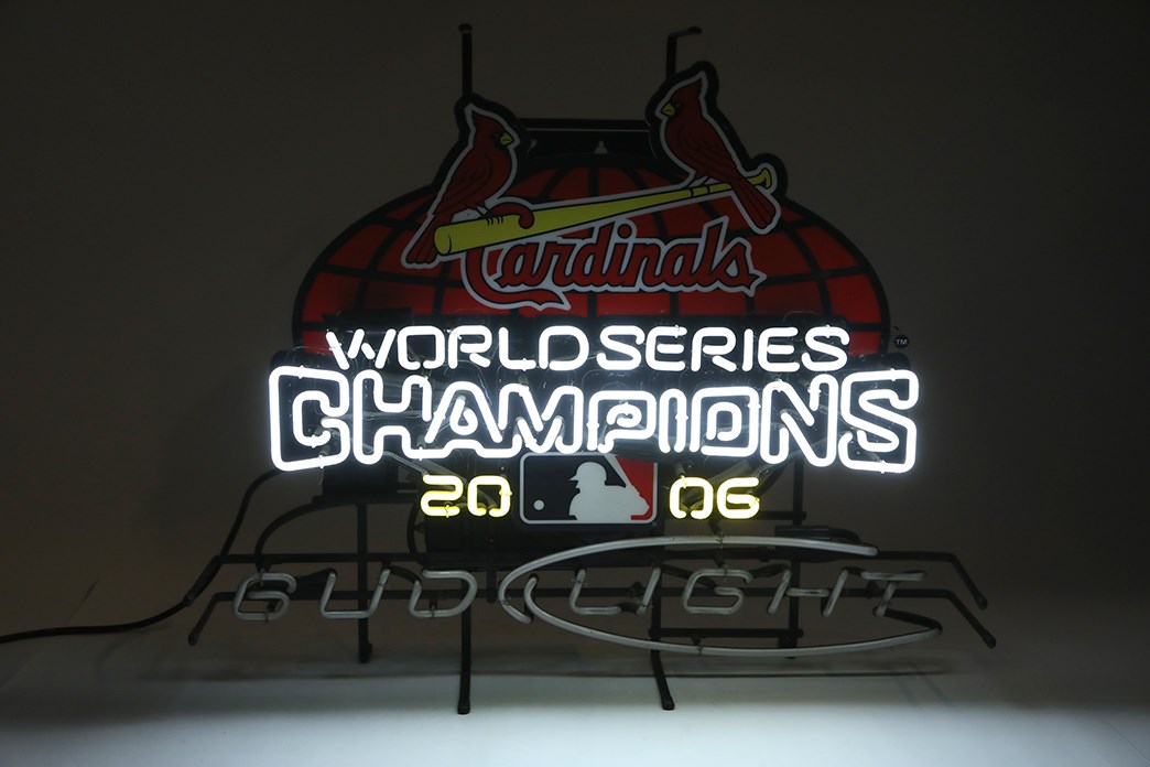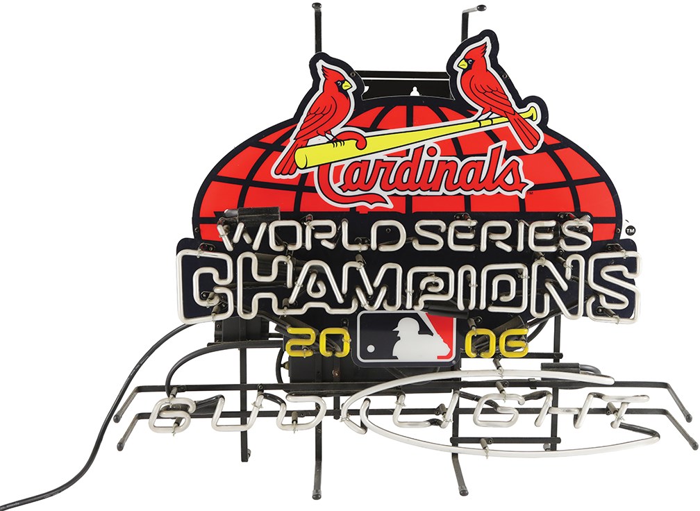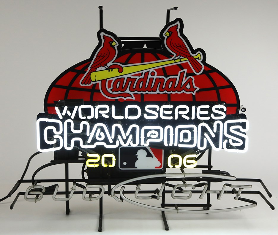 2006 St. Louis Cardinal World Champions Bud Light neon advertising display is as rare as they come. Only given to bars and establishments in the St. Louis area, not many were made. The "Bud Light" portion of the neon at the bottom of the sign does not work but rest is functional. Measures roughly 26x30x10" overall. Please note: this lot will necessitate the buyer arranging their own third-party packing and shipping or an in-house pick up.