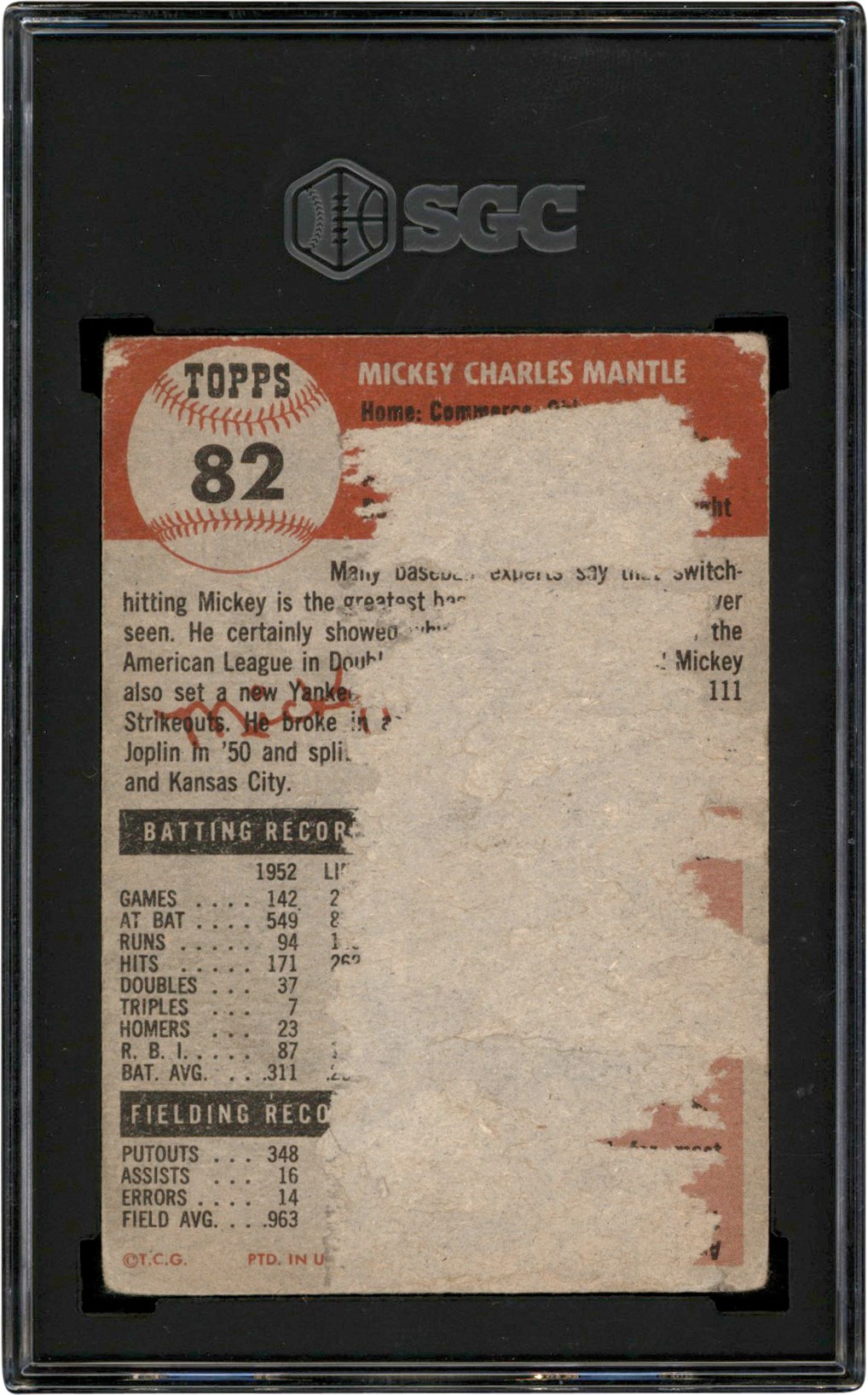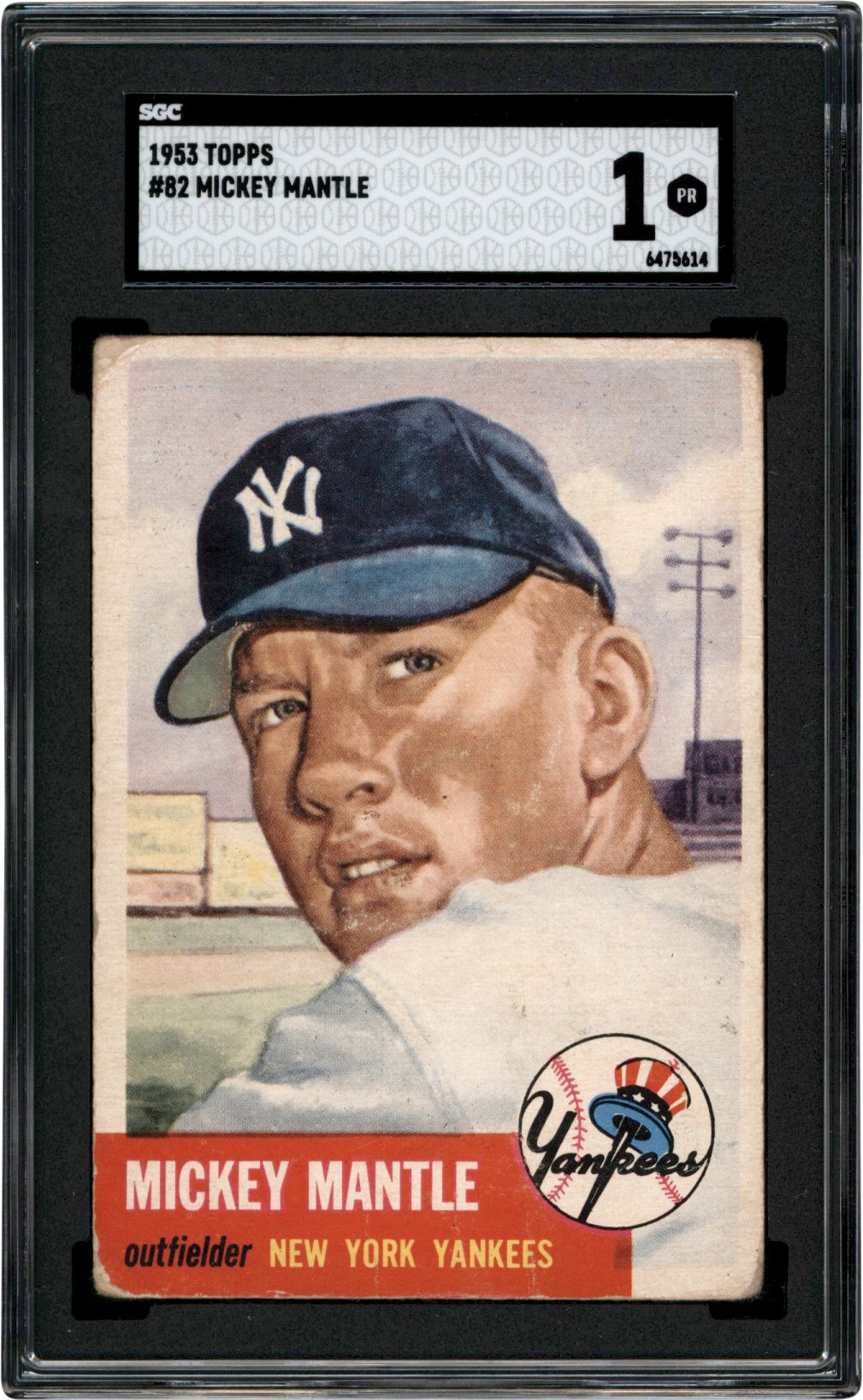 1953 Topps Baseball #82 Mickey Mantle card. The card has been graded and encapsulated by SGC PR 1. It has a colorful and clear image of a concentrating Mantle. All four corners are rounded and the edges have areas of roughness and chipping. Centering is good. The reverse is missing around 2/3 of its paper.