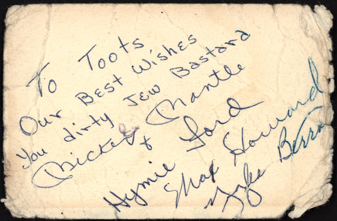 On the reverse is the real treasure; signed in dark blue ink by 4 of the greatest Yankees players of the 1950s & 60s adorns the signatures of Mickey Mantle who wrote (one could only write this to a very close friend), “To Toots Our Best Wishes you dirty Jew Bastard – Mickey Mantle”