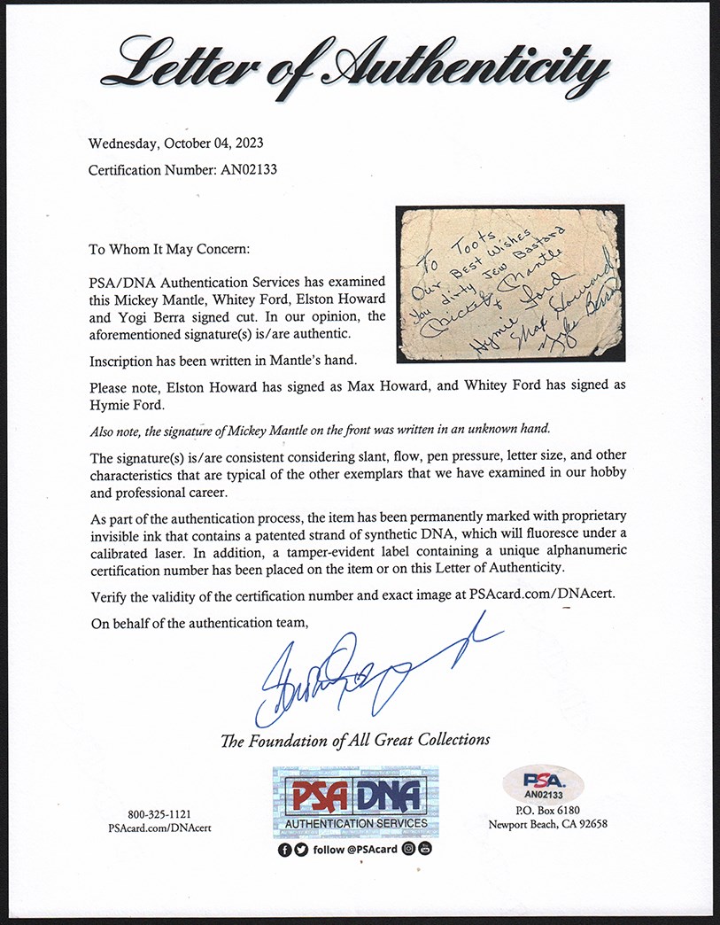 One of the most unique Mantle autographed pieces besides the infamous “Lewd” Yankees Questionnaire that we previously sold in December 2022 for just under $243,000