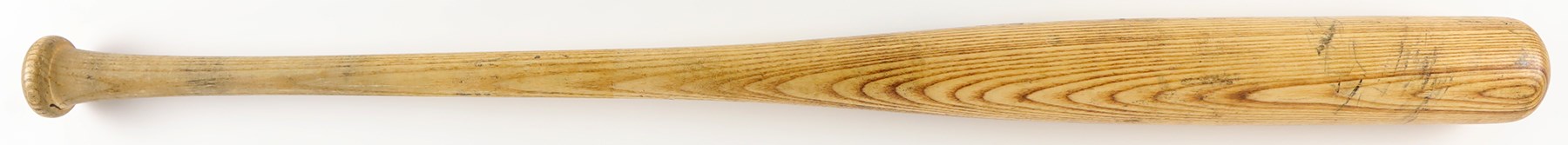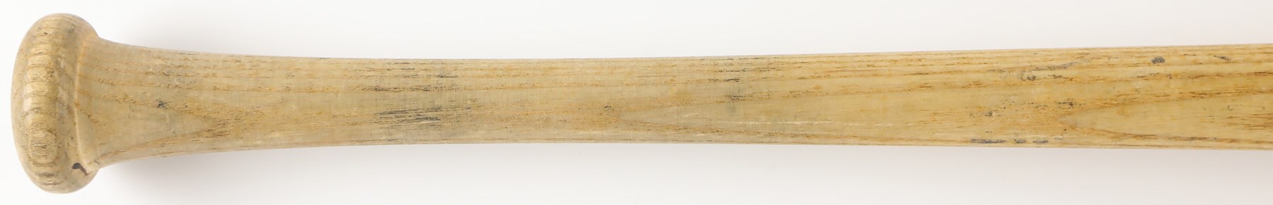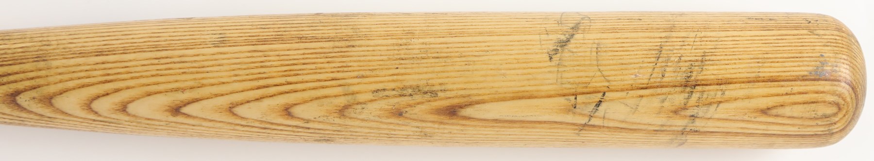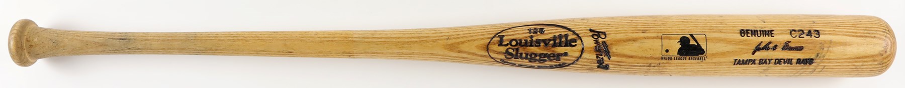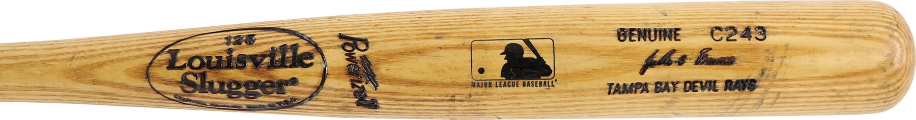 Julio Franco holds the all-time record for being the oldest player in Major League baseball history to hit a home run when he belted one into the swimming pool at Chase Stadium on May 4, 2007, when he was 48 years old. he was playing first base for the New York Mets in that game, and he hit a two-run home run in the top of the 2nd inning off the Arizona Diamondbacks' lefty Randy Johnson. "I want to hit one [a home run] when I'm fifty," said Franco. He didn't get his wish, because he finished playing in the Major leagues in 2007, but he had quite a ride. He played shortstop, second base, and first base. and he hit .298 over his long career. In his late forties he was primarily a pinch hitter. Franco played for eight different Major League teams, mostly for the Cleveland Indians and the Atlanta Braves. He was a 3-time All-Star, won 5 Silver Slugger Awards, and was the 1991 American League batting champion. The offered bat is a Louisville Slugger. On the barrel of the bat is imprinted "Genuine C243 Julio Franco (on a facsimile signature) Tampa Bay Devil Rays." Also on the barrel is the Major League Baseball logo. The bat is 35.25" long, and it weighs 33.9 ounces. The bat exhibits nice use. The handle has been boned and/or shaved, and there are numerous ball marks, and some scratches. The bat was used during the 1999 season when Franco was playing his lone season for the Tampa Bay Devil Rays. Franco had a long and distinguished career, but he is best remembered for his amazing longevity. In addition to holding the record for being the oldest player to hit a homer, he holds records for the oldest player to hit a grand slam (47 years old) in 2005, and the second oldest player to steal a base (48 years old) in 2007. This game used Julio Franco bat makes a nice memento from one of the oldest, and still effective, position players in history.