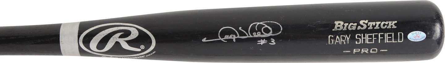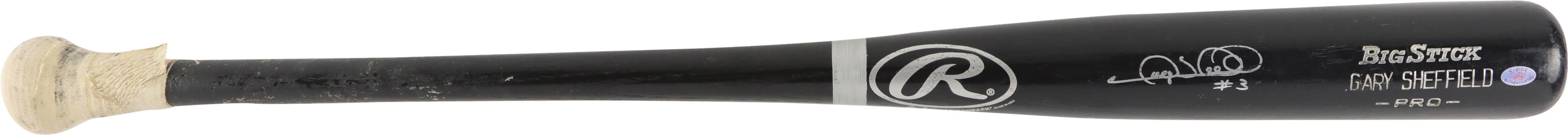 Gery Sheffield spoke loudly through his bat, to the tune of 509 home runs and a .292 lifetime average. He also spoke loudly through his voice, and made statements that ruffled the feathers of players, management, and writers. "I tell myself every off-season that I'm not going to say anything crazy," said Sheffield. "Can't do it. I'm cut from a different cloth." Sheffield played 22 Major League seasons and was with eight teams: Primarily, the Florida Marlins, Los Angeles Dodgers, Milwaukee Brewers, and New York Yankees. Offered is a 2008-09 Gary Sheffield game used bat from his time with the Detroit Tigers. An outfielder, shortstop and third baseman, Sheffield hit 44 homers and drove in 132 runs in his two years with Detroit. He also helped win a World Series with the Miami Marlins in 1997. The Rawlings Adirondack bat is a "Big Stick Gary Sheffield Pro" model, and it is 34.5" in length, and it weighs 33.25 ounces. The bat has a classic taped knob. Sheffield signed the bat on the barrel with a silver marker, and he inscribed the bat with "#3", his jersey number, and during his time with Detroit, the only time he wore #3. The bat is authenticated by Sheff Authentications with holo on barrel.