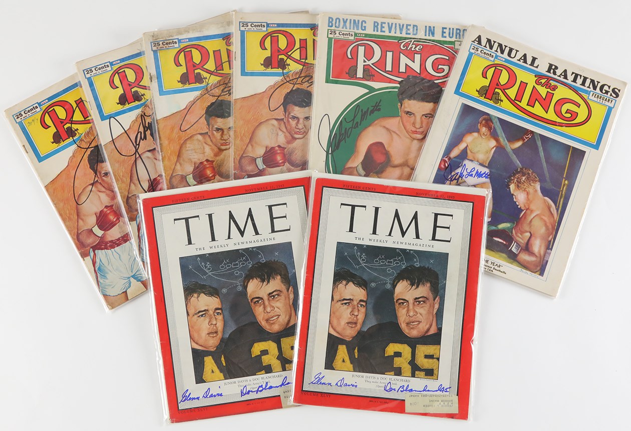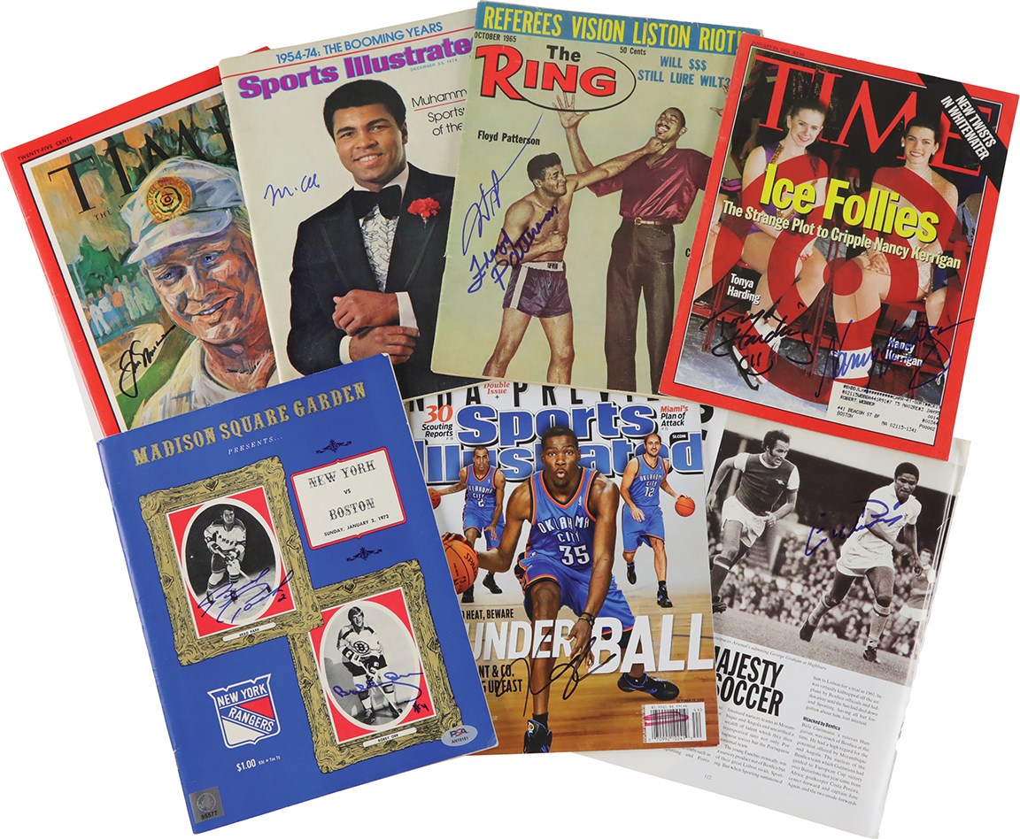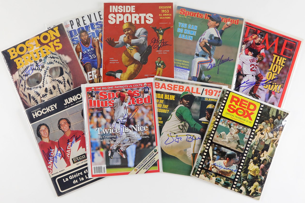 Nice selection of over 30 signed sports publications includes: Guide to World Soccer signed by Jake LaMotta (6); Boston Bruins '78-79 program Gerry Cheevers; Kevin Durant NBA Preview (2); Tom Seaver SI; Jack Nicklaus Time; Jonathan Papelbon SI; Johnny Lattner Inside Sports; Mike Bossy, Guy Lafleur, and Ray Bourque Hockey Junior; Bobby Orr and Brad Park Madison Square Garden; Bobby Orr SI; Glen Davis and Doc Blanchard Time: Nancy; Muhammad Ali SI; Louis Aparicio 1973 Red Sox Yearbook; and Vida Blue Baseball 1972.