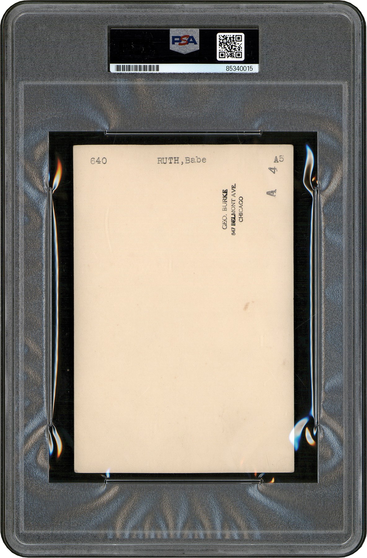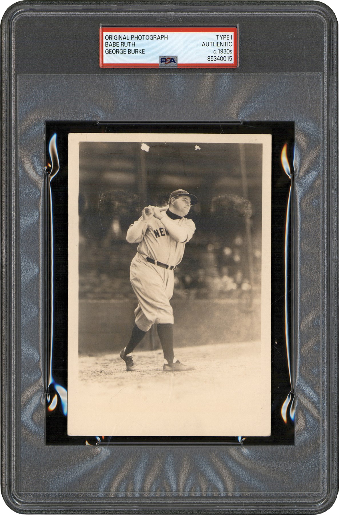 Displayed is a 1930s Babe Ruth original George Burke photograph that depicts the Bambino demonstrating his classic follow through. Although the Inaugural Hall of Famer's single-season (60) and lifetime (714) home run marks have been surpassed, Ruth still holds the all-time MLB career marks for slugging (.690) and OPS (1.164). There was no one like the Babe: In a number of seasons, he hit more home runs than the combined home run totals of several teams in the American League. The offered photo measures 4x6". Ruth's bulk places the photo as being in the 1930s, near the end of his years with the Yankees. On back, the photo shows a typed "640/RUTH, Babe" plus the stamped "GEO. BURKE/847 Belmont Ave./CHICAGO." Burke was one of the premier photographers of his era. The photo exhibits some sight foxing and darkening because of its age, and there are two spots of very small paper loss from the outer layer of the photograph. The photograph has been encapsulated and PSA graded TYPE I AUTHENTIC.