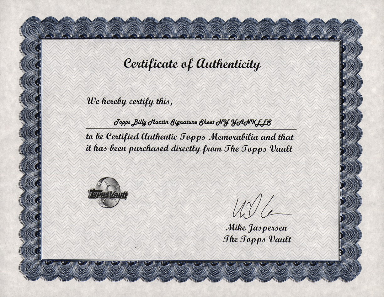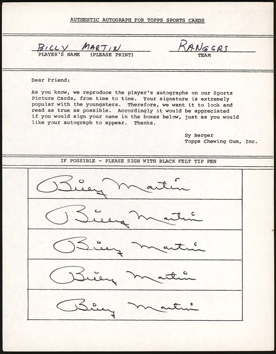 A letter from the Topps Collectibles company that has been signed multiple times by former Yankees player and manager Billy Martin. The letter requests that Martin sign his name in 5 boxes so that his signature could be replicated on his baseball cards, reading in part, "it would be appreciated if you would sign your name in the boxes below, just how you would like your autograph to appear." Martin has signed each of the five boxes. The lot also includes a Certificate of Authenticity from the Topps Vault. Martin played for the Yankees from 1950 through 1957, winning 4 World Series title. He would add another title in 1977 as the manager of the Bronx Bombers.