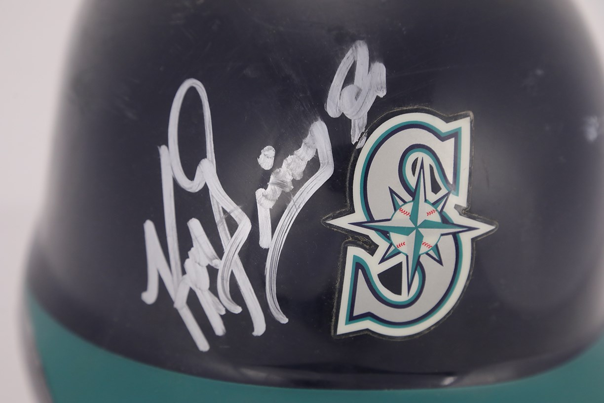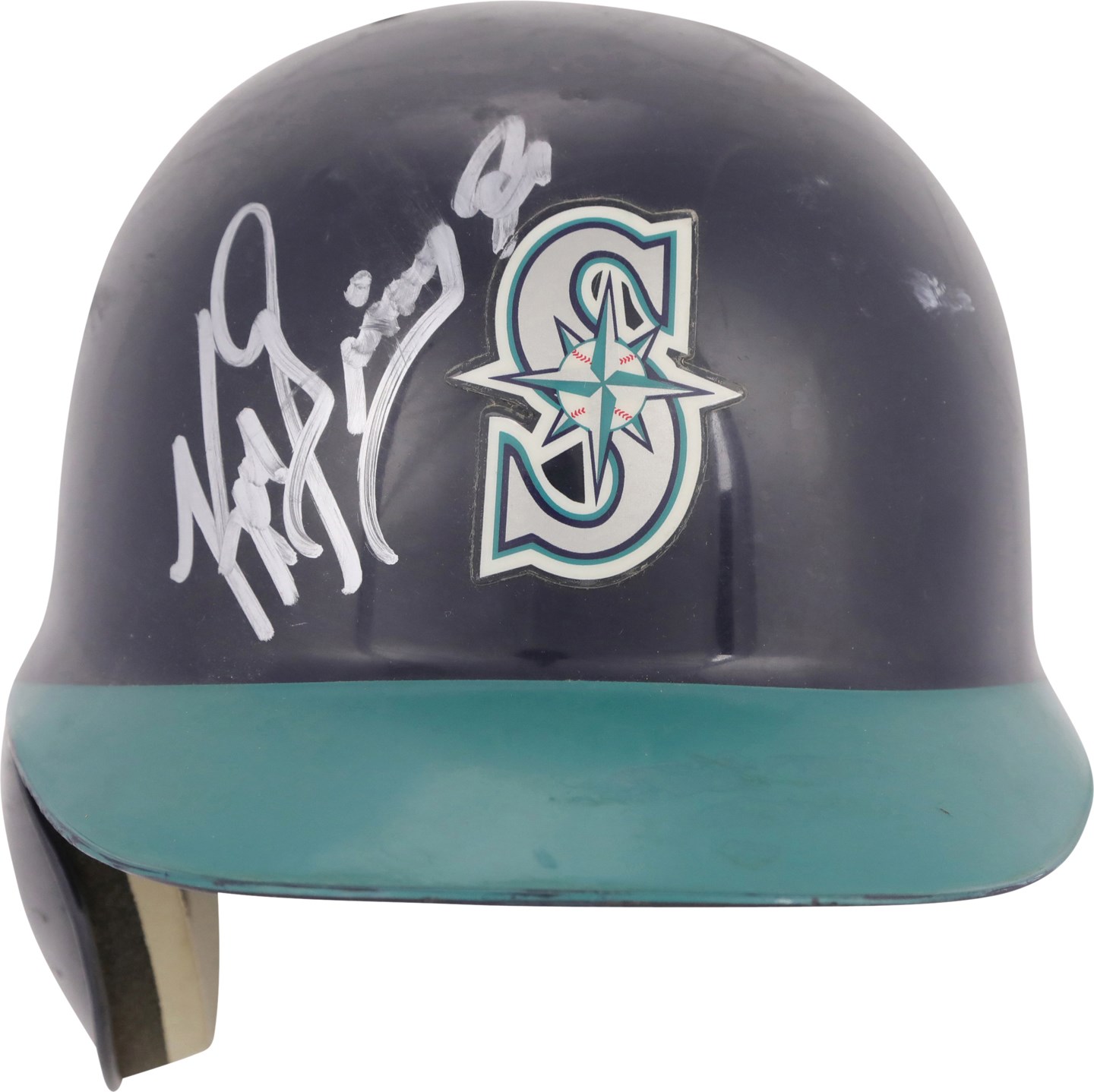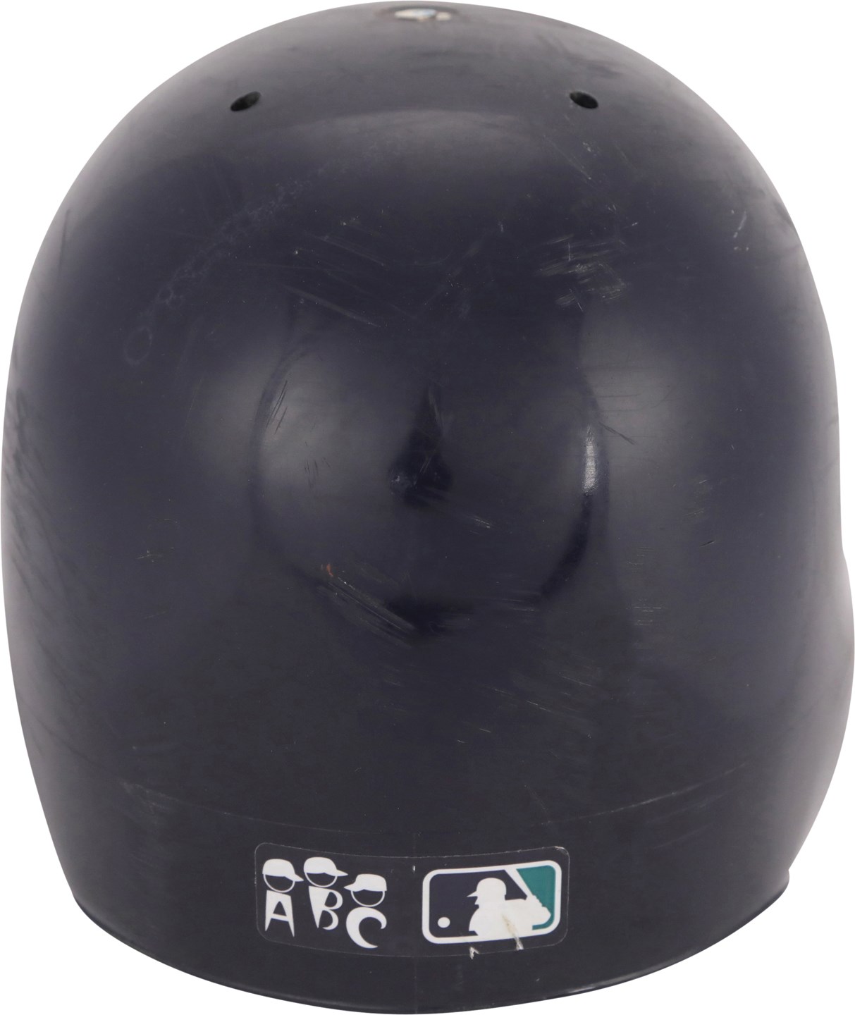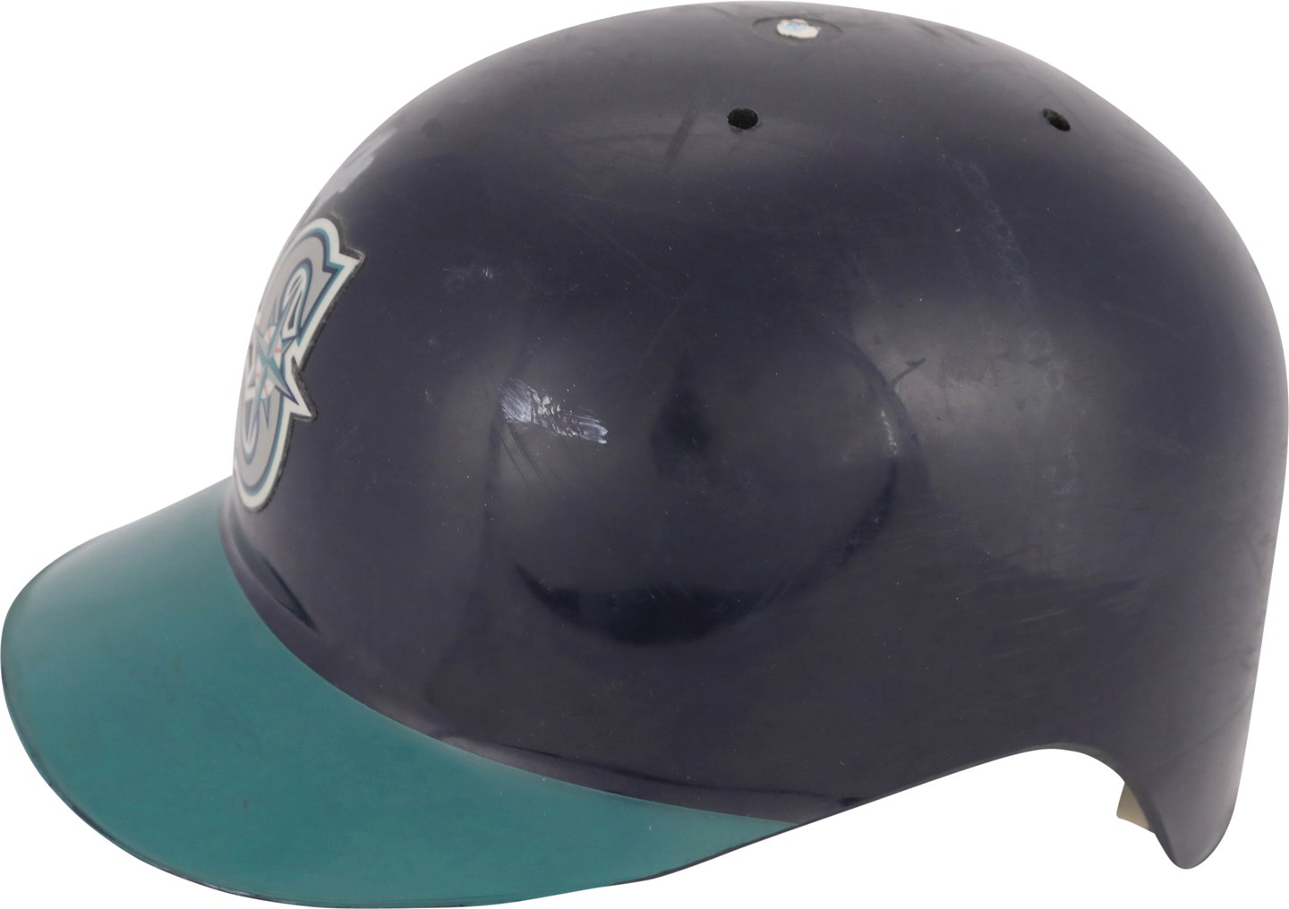 A helmet worn by Ken Griffey Jr. during the 1994 season. The black helmet features a teal brim and the Seattle Mariners logo. The item is a size 7 1/8 and was manufactured by American Baseball Cap in Media, PA. The helmet shows signs of significant use throughout with several scuff marks and is autographed by Griffey Jr. in silver ink near the logo. The lot includes a Certificate of Authenticity from Unique Sports (also signed by the player) verifying the item. Griffey Jr., the most popular player of his era, was an All-Star, Silver Slugger, and Gold Glover in 1994 and was inducted into the Baseball Hall of Fame in 2016.