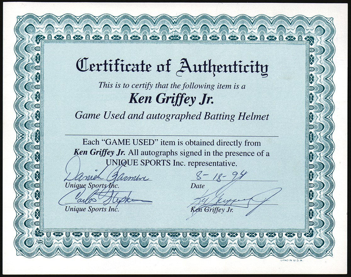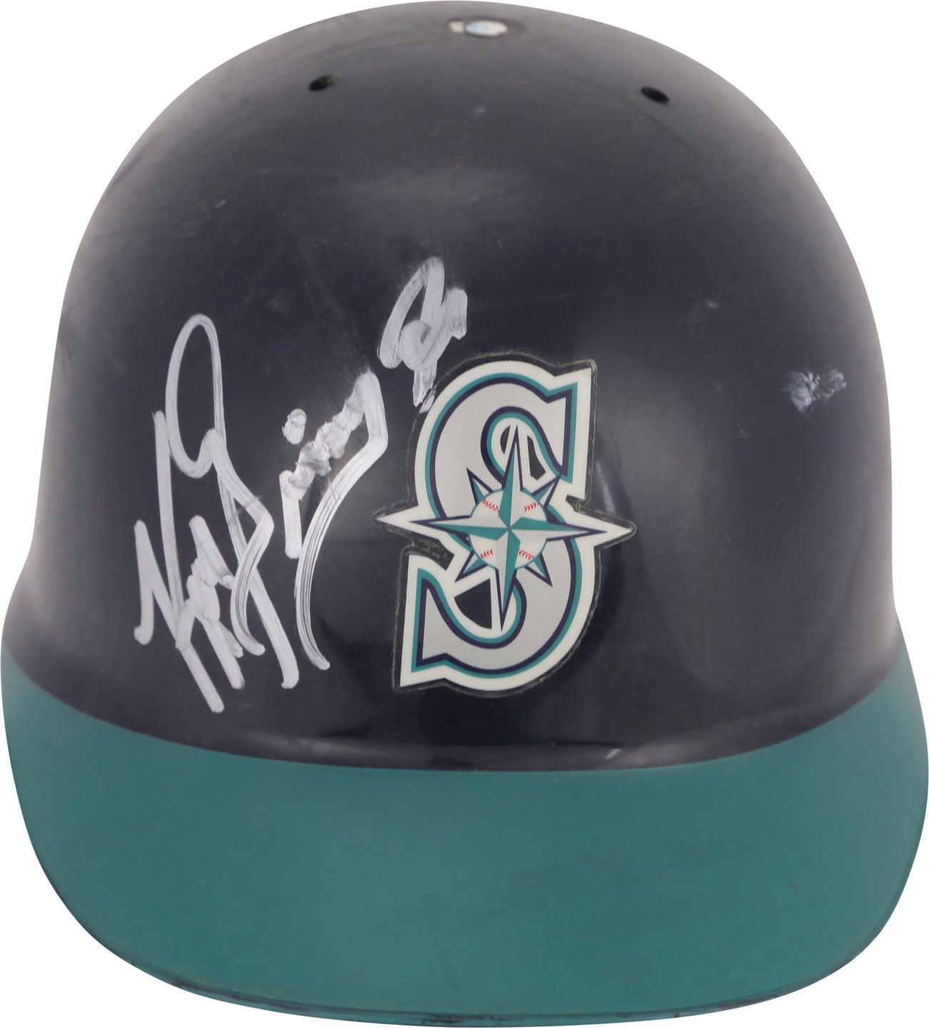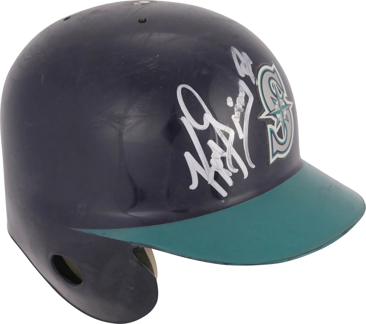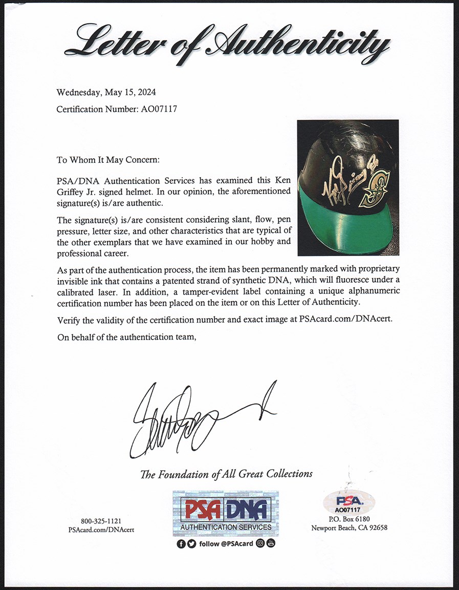A helmet worn by Ken Griffey Jr. during the 1994 season. The black helmet features a teal brim and the Seattle Mariners logo. The item is a size 7 1/8 and was manufactured by American Baseball Cap in Media, PA. The helmet shows signs of significant use throughout with several scuff marks and is autographed by Griffey Jr. in silver ink near the logo. The lot includes a Certificate of Authenticity from Unique Sports (also signed by the player) verifying the item. Griffey Jr., the most popular player of his era, was an All-Star, Silver Slugger, and Gold Glover in 1994 and was inducted into the Baseball Hall of Fame in 2016.