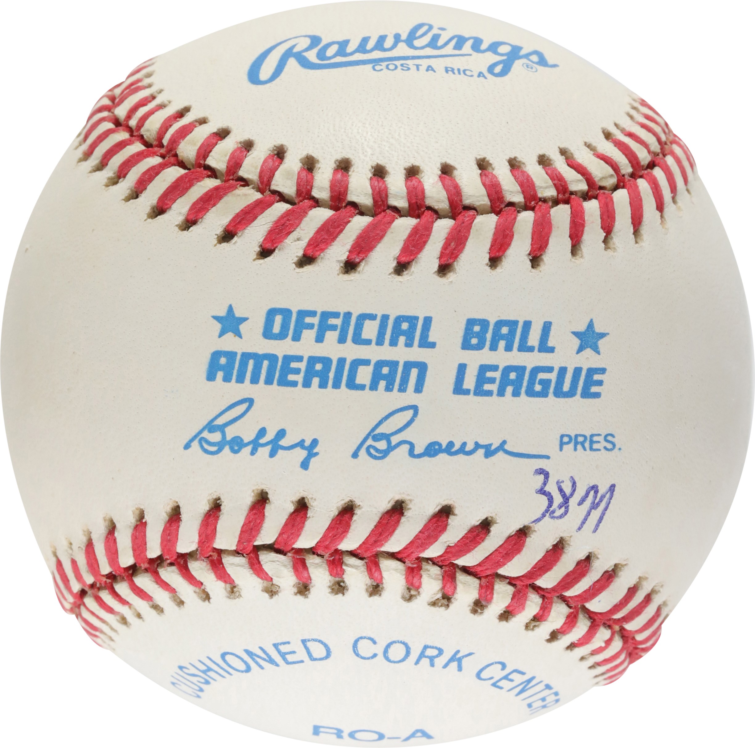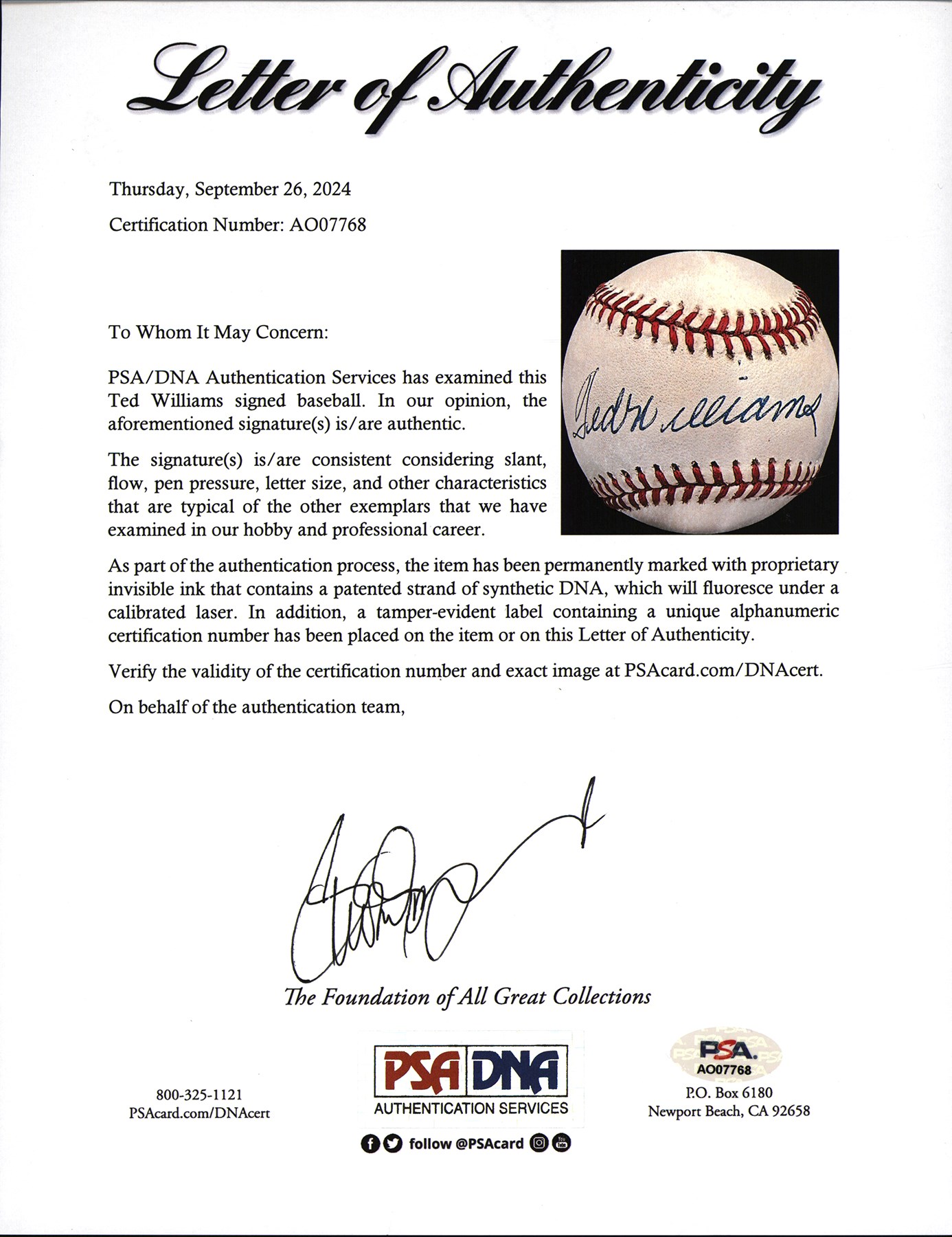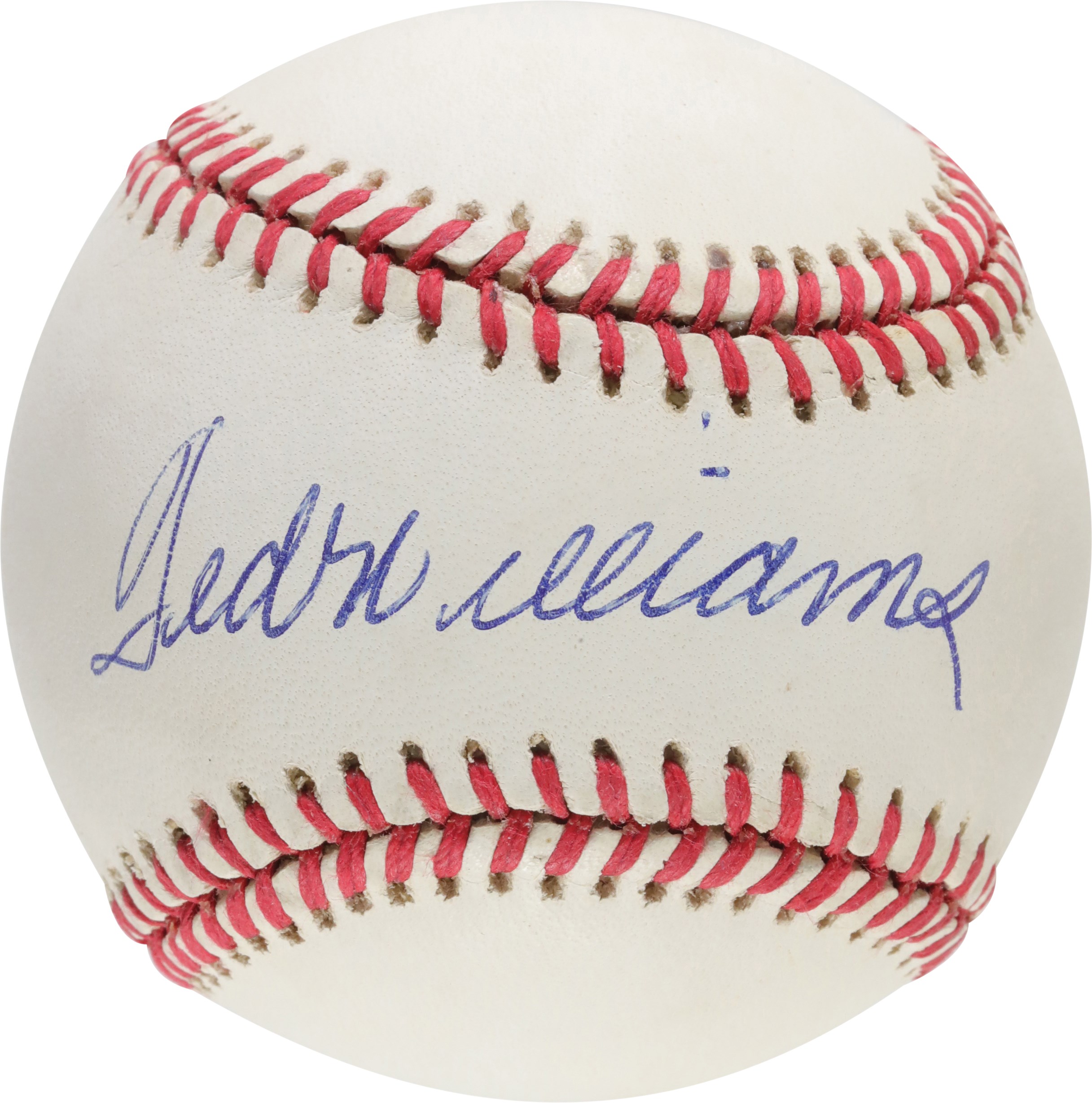 A baseball signed by Boston Red Sox legend Ted Williams. The American League baseball (Bobby Brown President) has been signed by the outfielder in blue pen. The item will include a letter of authenticity from PSA/DNA verifying the signature. Williams, who retired with a career batting average of .344 and 521 home runs, is widely considered to be among the greatest hitters of all-time. The iconic player, who was inducted into the Major League Baseball Hall of Fame in 1966, passed away in 2002.