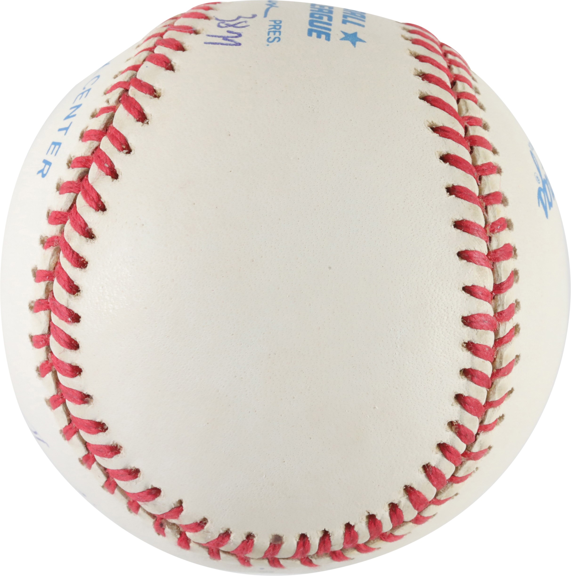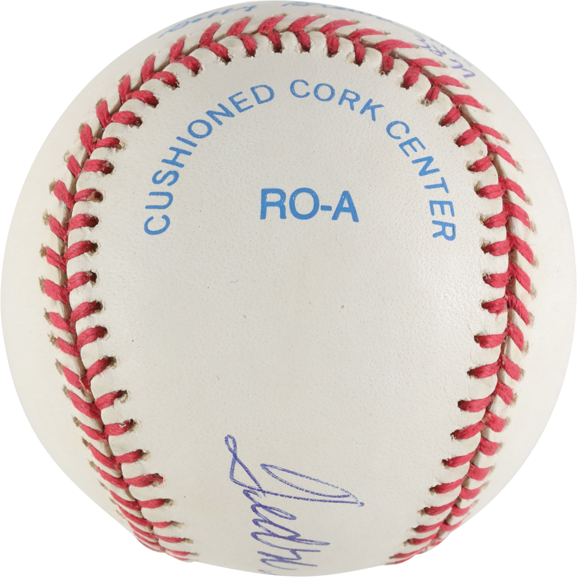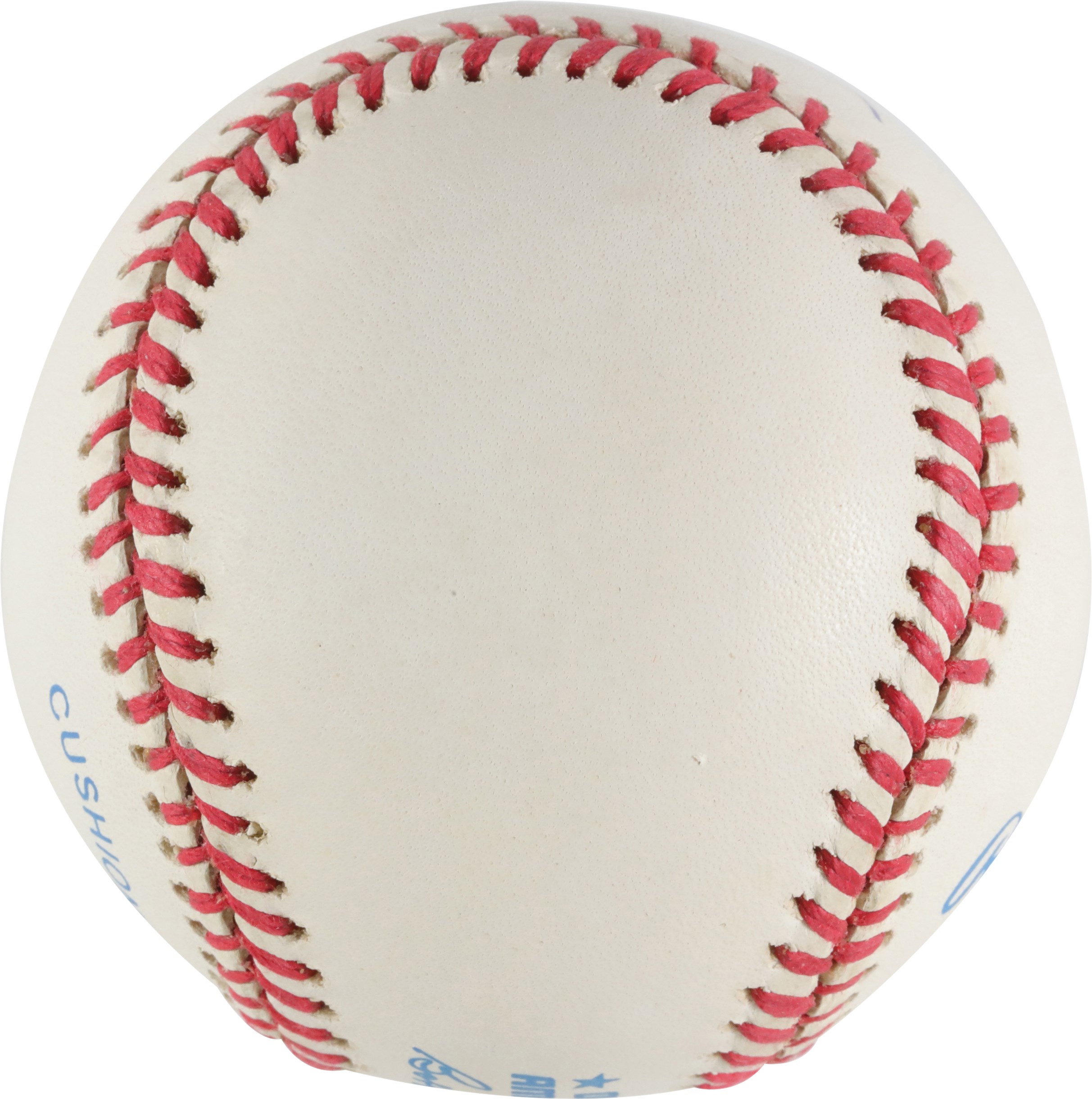 A baseball signed by Boston Red Sox legend Ted Williams. The American League baseball (Bobby Brown President) has been signed by the outfielder in blue pen. The item will include a letter of authenticity from PSA/DNA verifying the signature. Williams, who retired with a career batting average of .344 and 521 home runs, is widely considered to be among the greatest hitters of all-time. The iconic player, who was inducted into the Major League Baseball Hall of Fame in 1966, passed away in 2002.