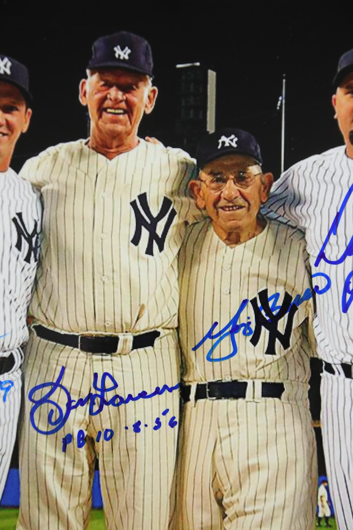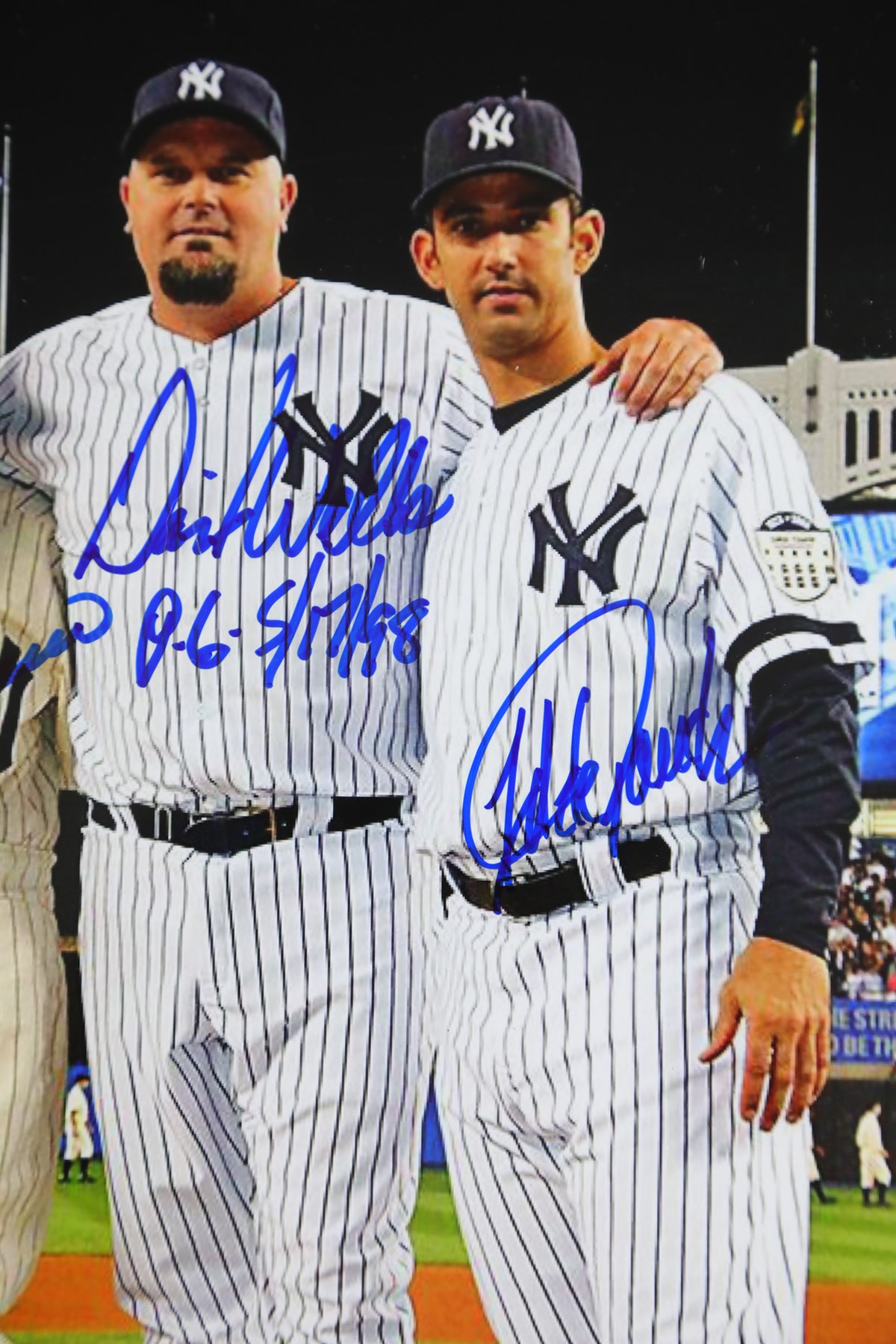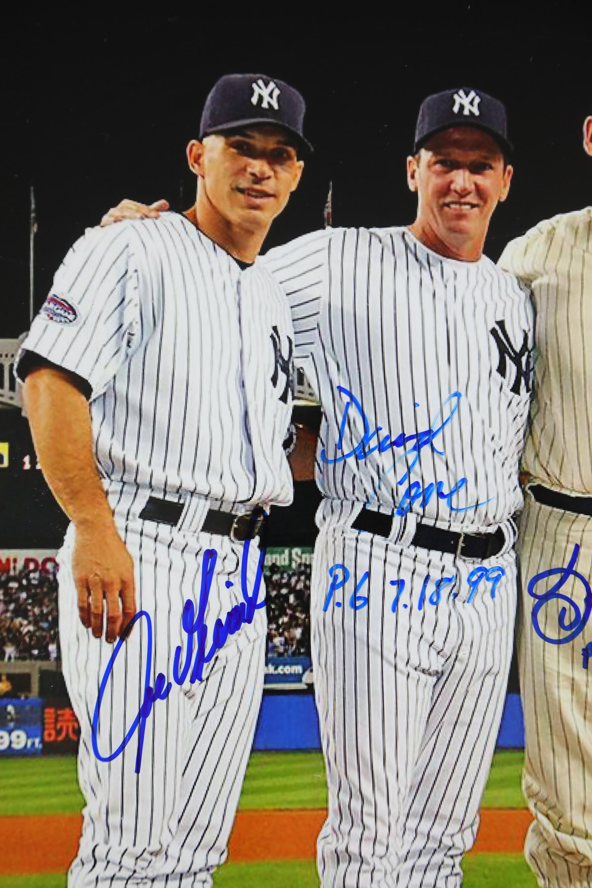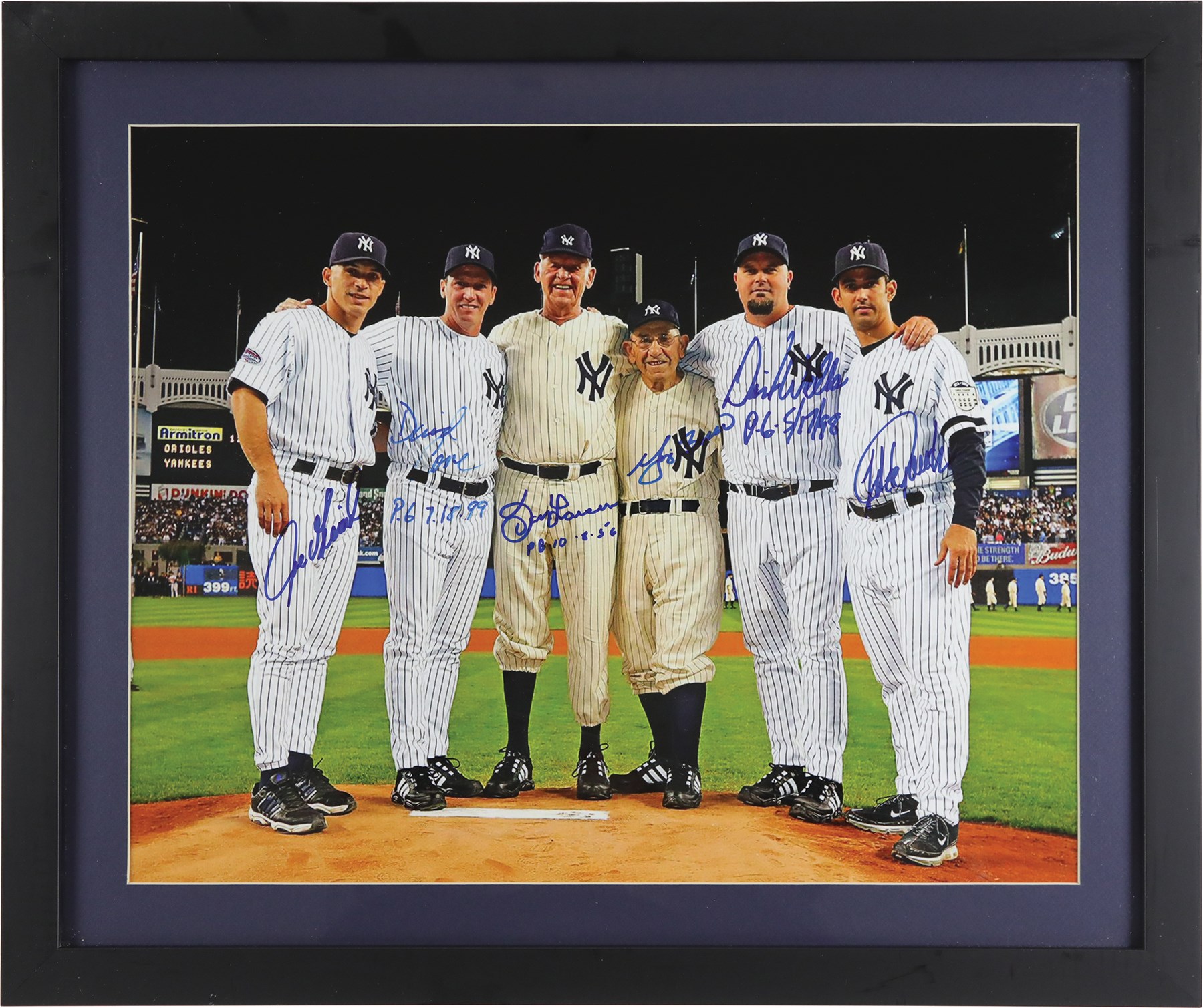 Image features the first three New York Yankees Perfect Game duos signed by Don Larsen; Yogi Berra; David Wells; Jorge Posada; David Cone; and Joe Girardi. Handsomely framed and matted in Yankees colors to 20x24" overall. Edge wear on frame and scratch on plexiglass noticed.