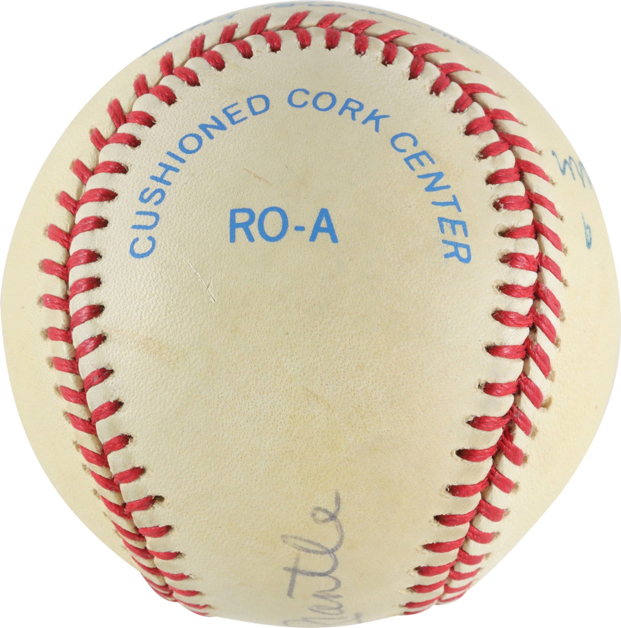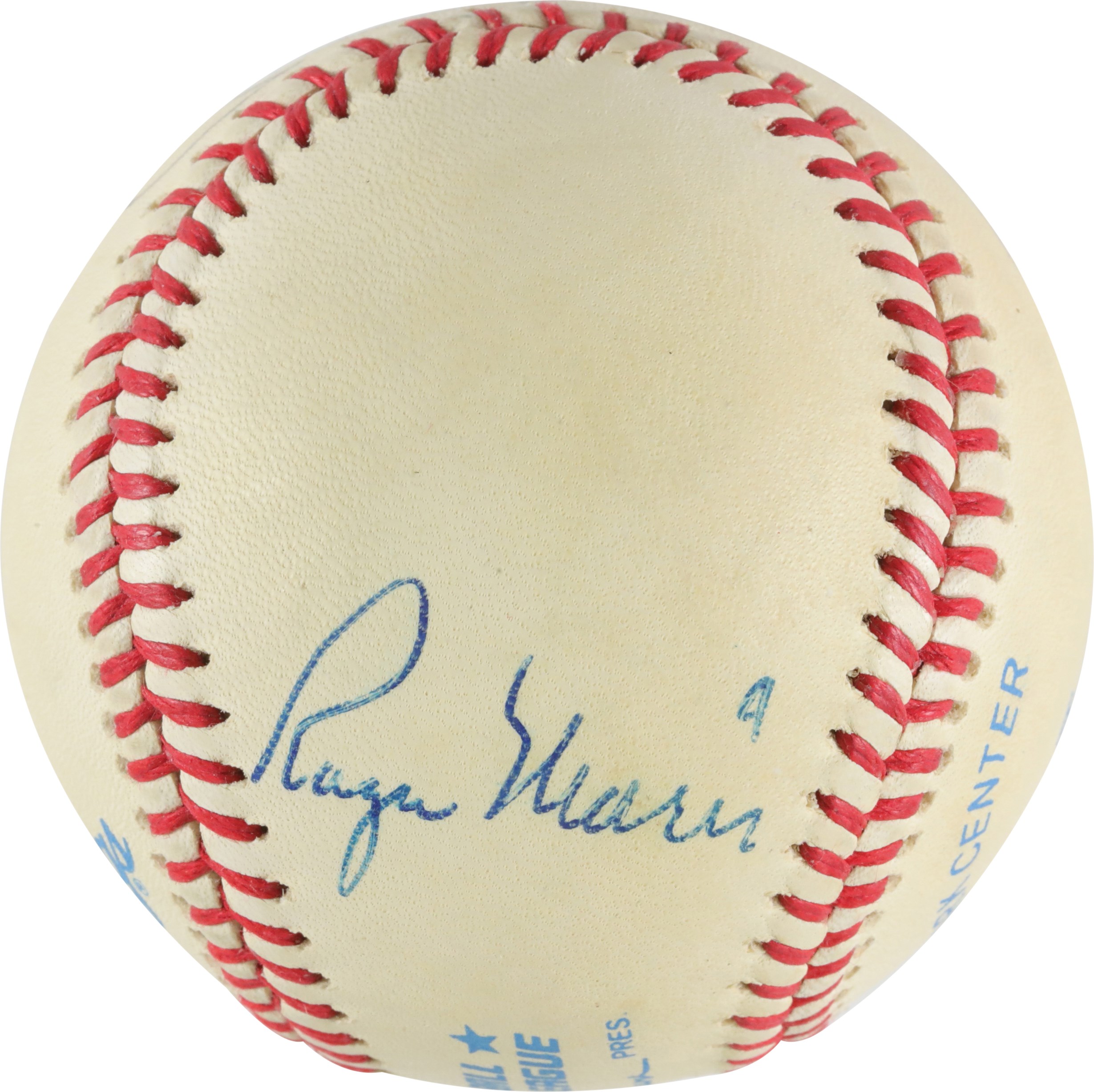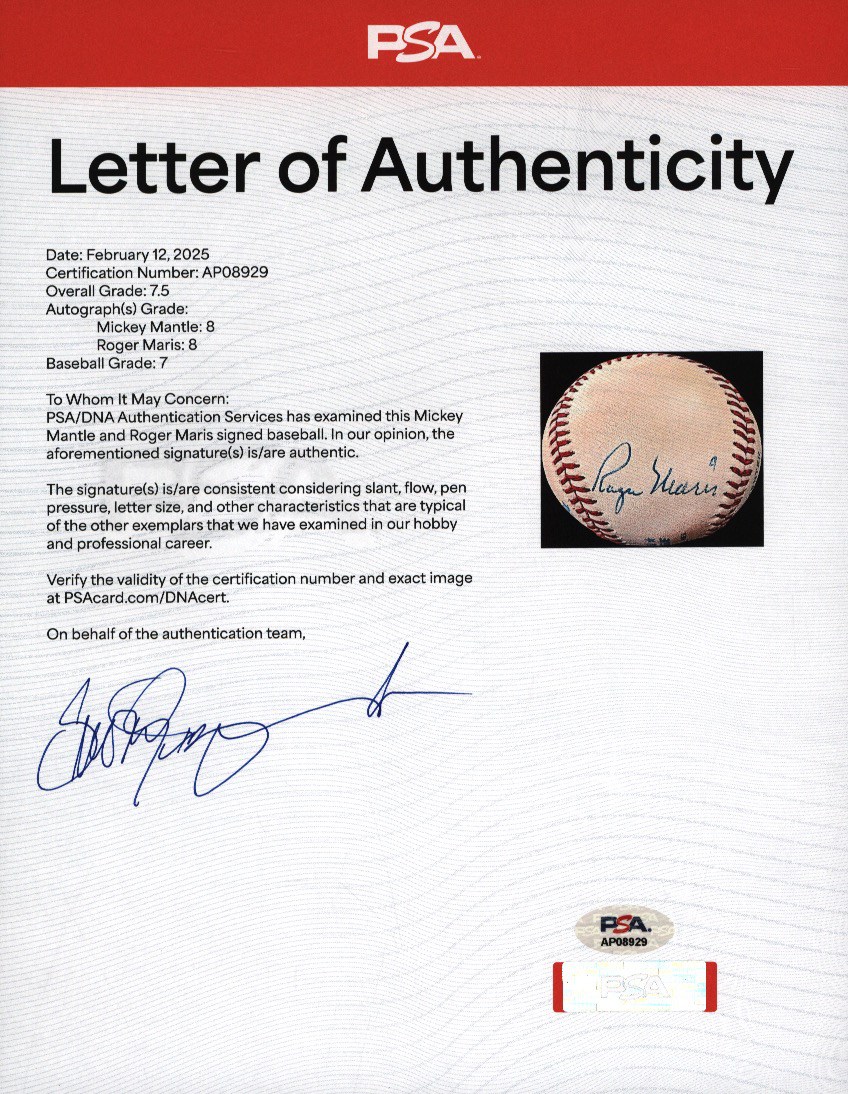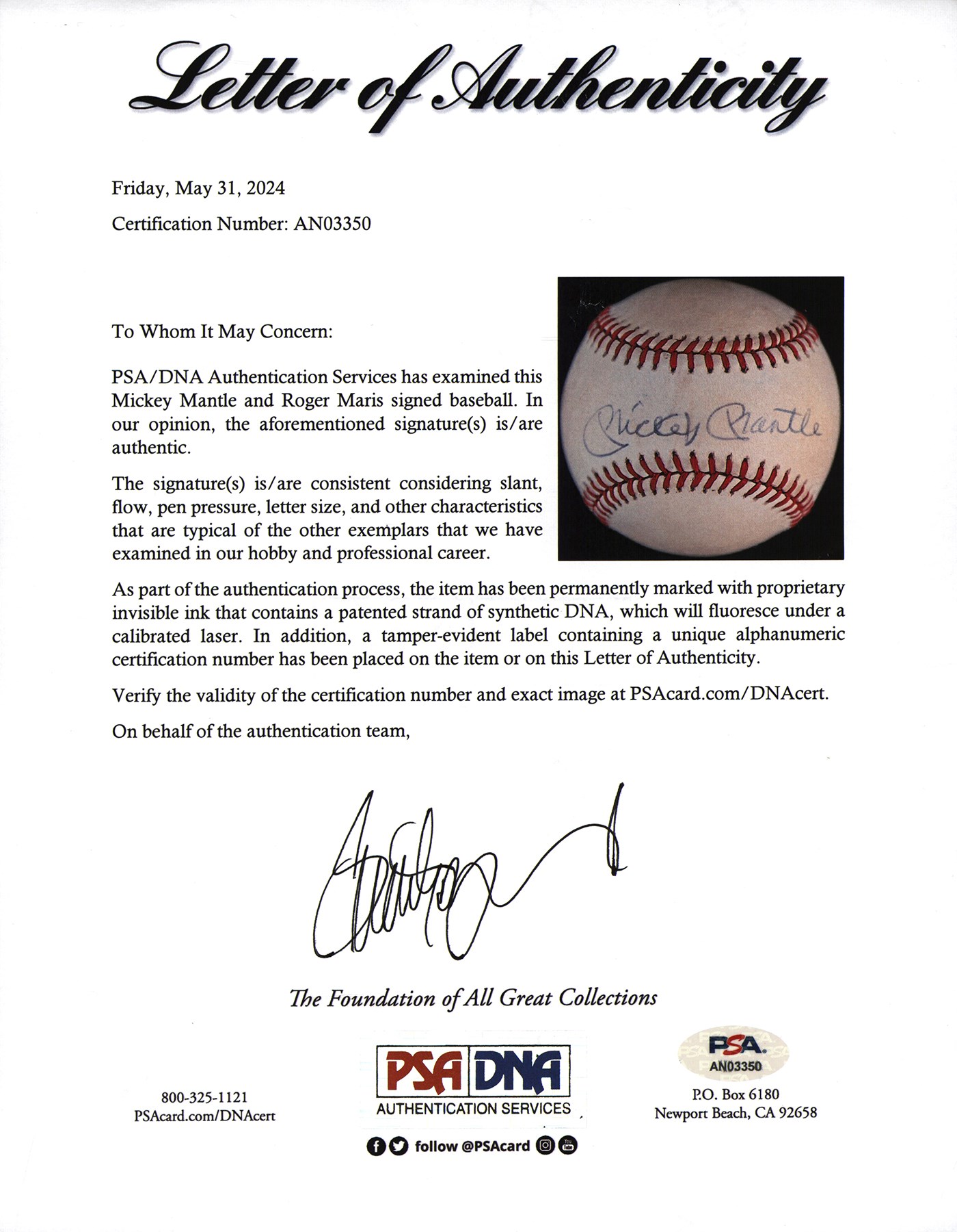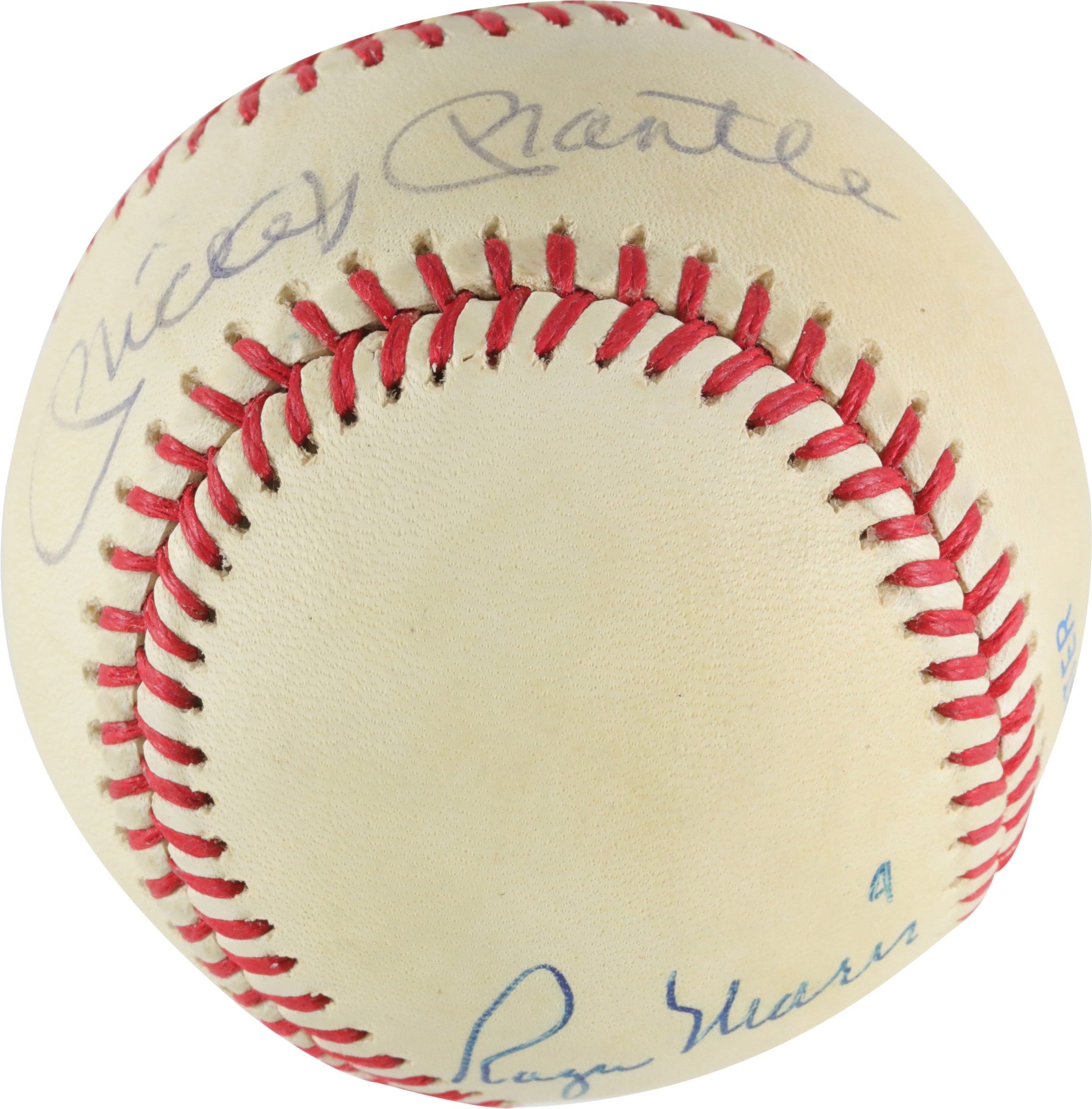 A baseball signed by famed New York Yankee outfielders Mickey Mantle and Roger Maris. The M and M boys, who had a legendary home run race during the 1961 season, has both signed the official American League ball in blue ink. The item will include a letter of authenticity from PSA/DNA verifying the signatures. A ball signed by both of these players is quite rare as Maris passed away in 1985 and Mantle passed away in 1995. This is a special opportunity to obtain a signed ball from two of the most famous baseball teammates ever.