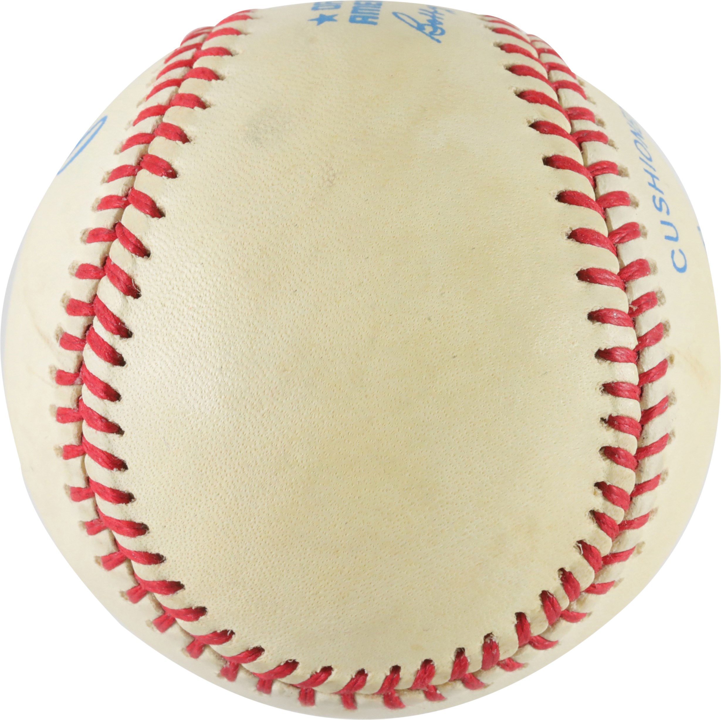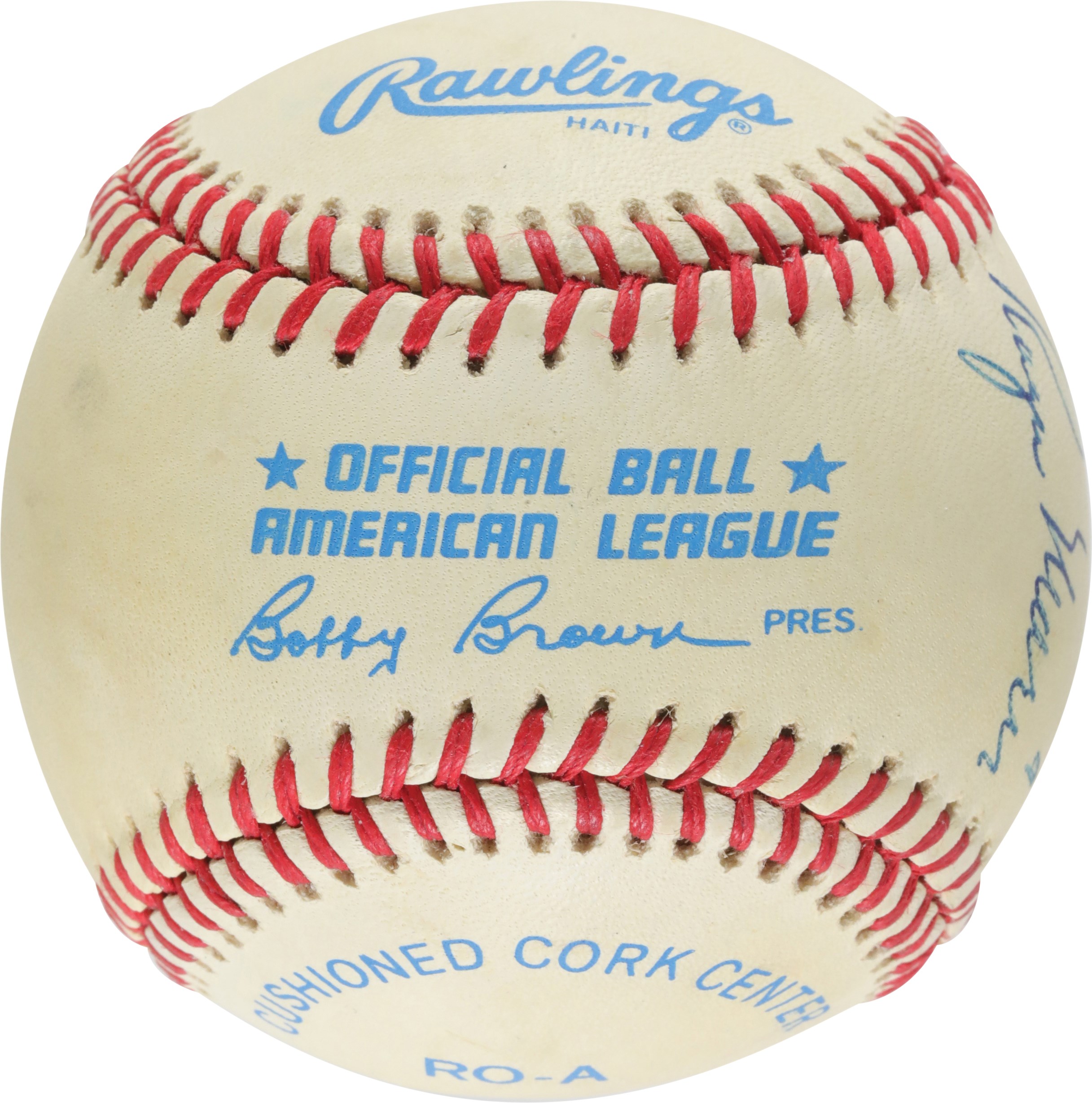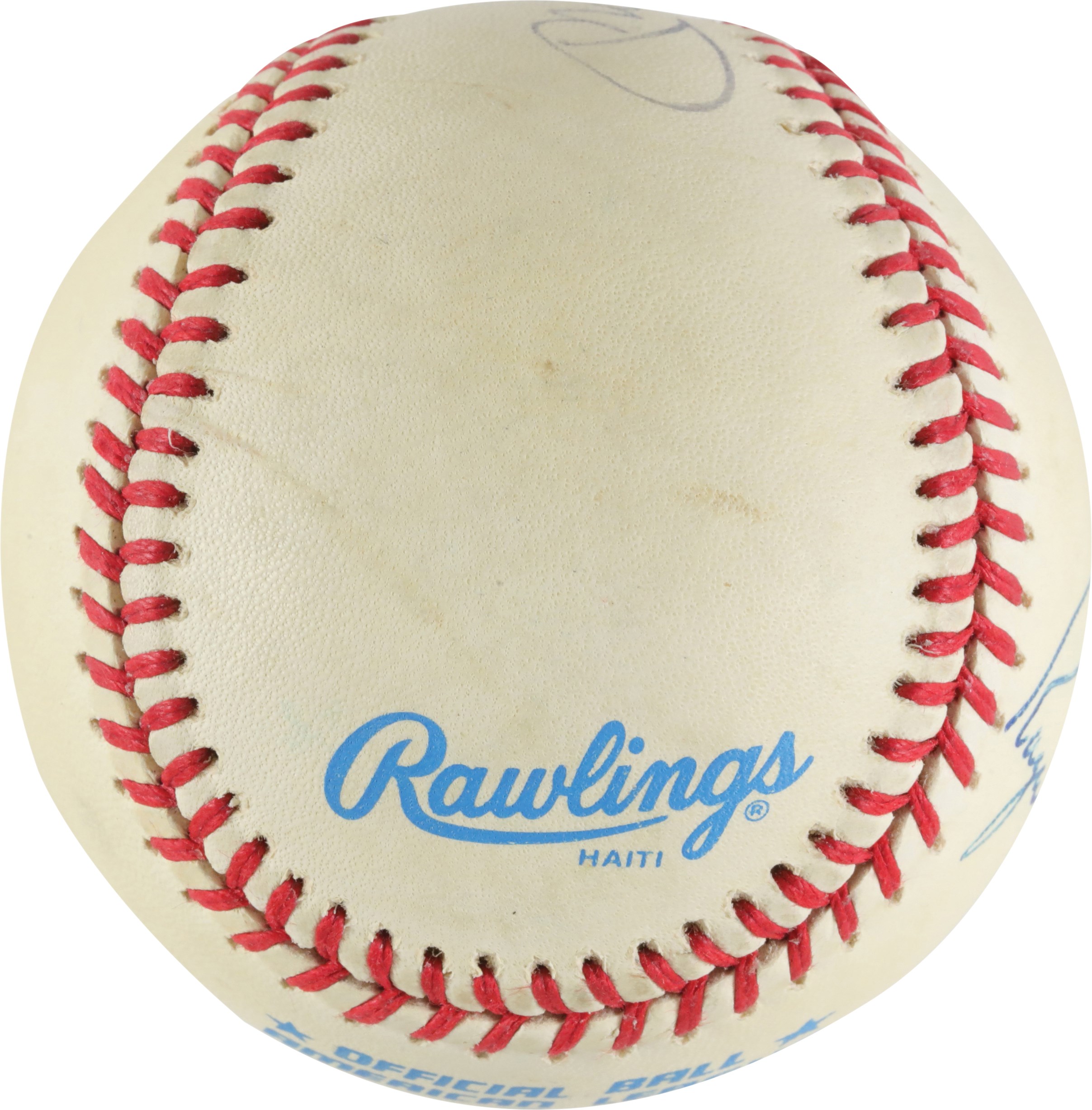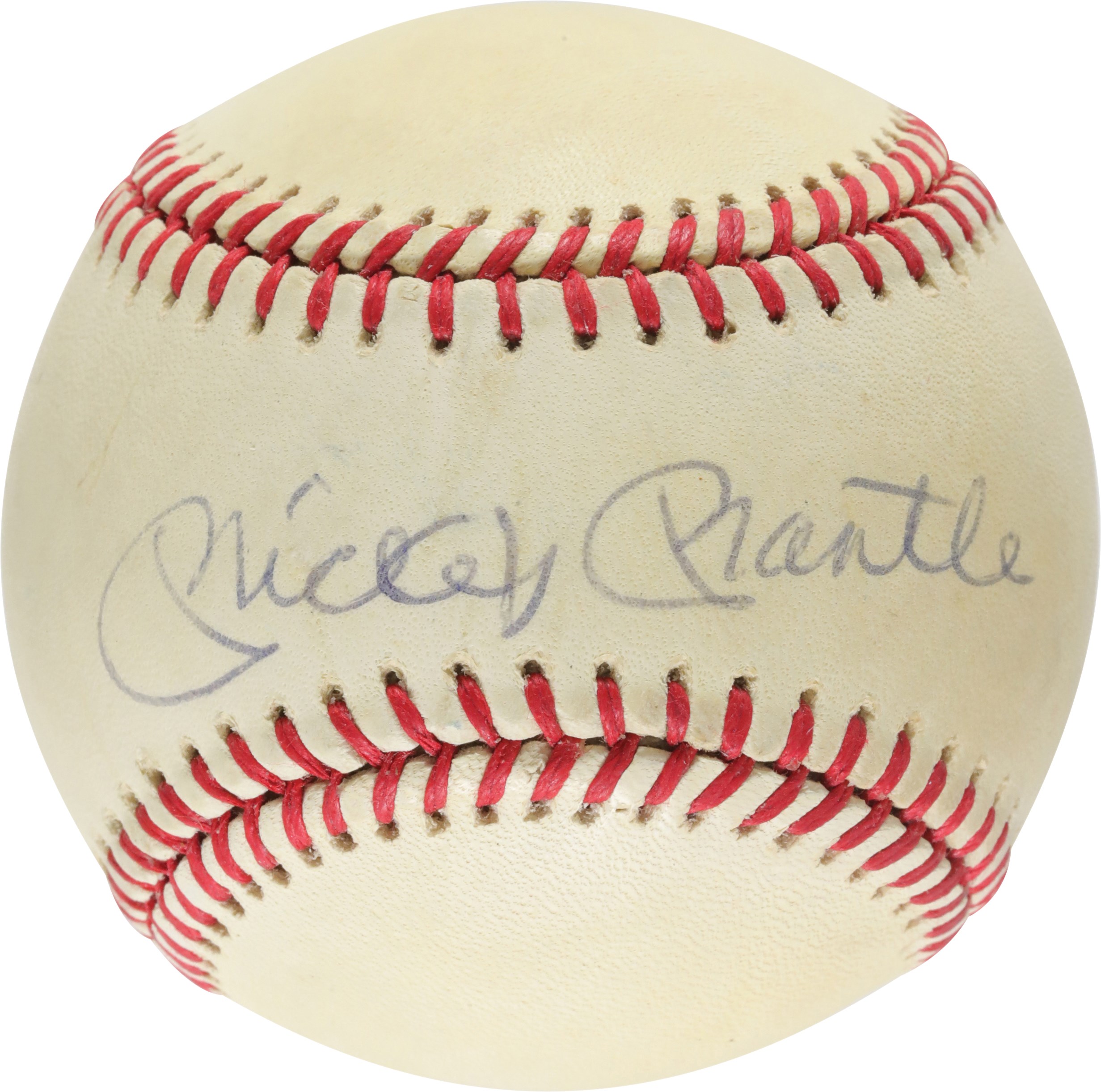 A baseball signed by famed New York Yankee outfielders Mickey Mantle and Roger Maris. The M and M boys, who had a legendary home run race during the 1961 season, has both signed the official American League ball in blue ink. The item will include a letter of authenticity from PSA/DNA verifying the signatures. A ball signed by both of these players is quite rare as Maris passed away in 1985 and Mantle passed away in 1995. This is a special opportunity to obtain a signed ball from two of the most famous baseball teammates ever.