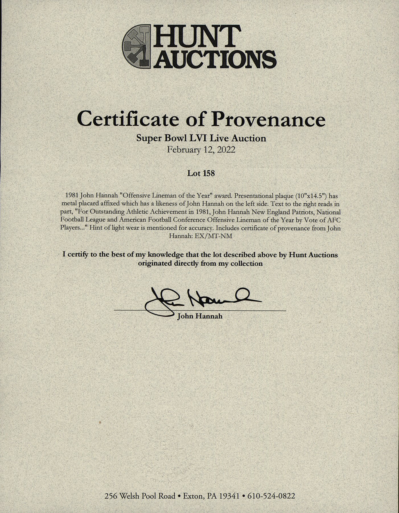 Offered is John Hannah's 1981 "Offensive Lineman of the Year" award. The plaque measures 10x14.5" and has a metal placard featuring the likeness of Hannah on the left. The National Football League Players Association logo is on the right side of the plaque. The text below the logo reads in part, "For Outstanding Athletic Achievement in 1981, John Hannah, New England Patriots, National Football League and American Football Conference Offensive Lineman of the Year." The plaque is in excellent condition and comes with a full LOA from John Hannah. Hannah played for the Patriots from 1973 to 1985. He was inducted to the Pro Football Hall of Fame in 1991.