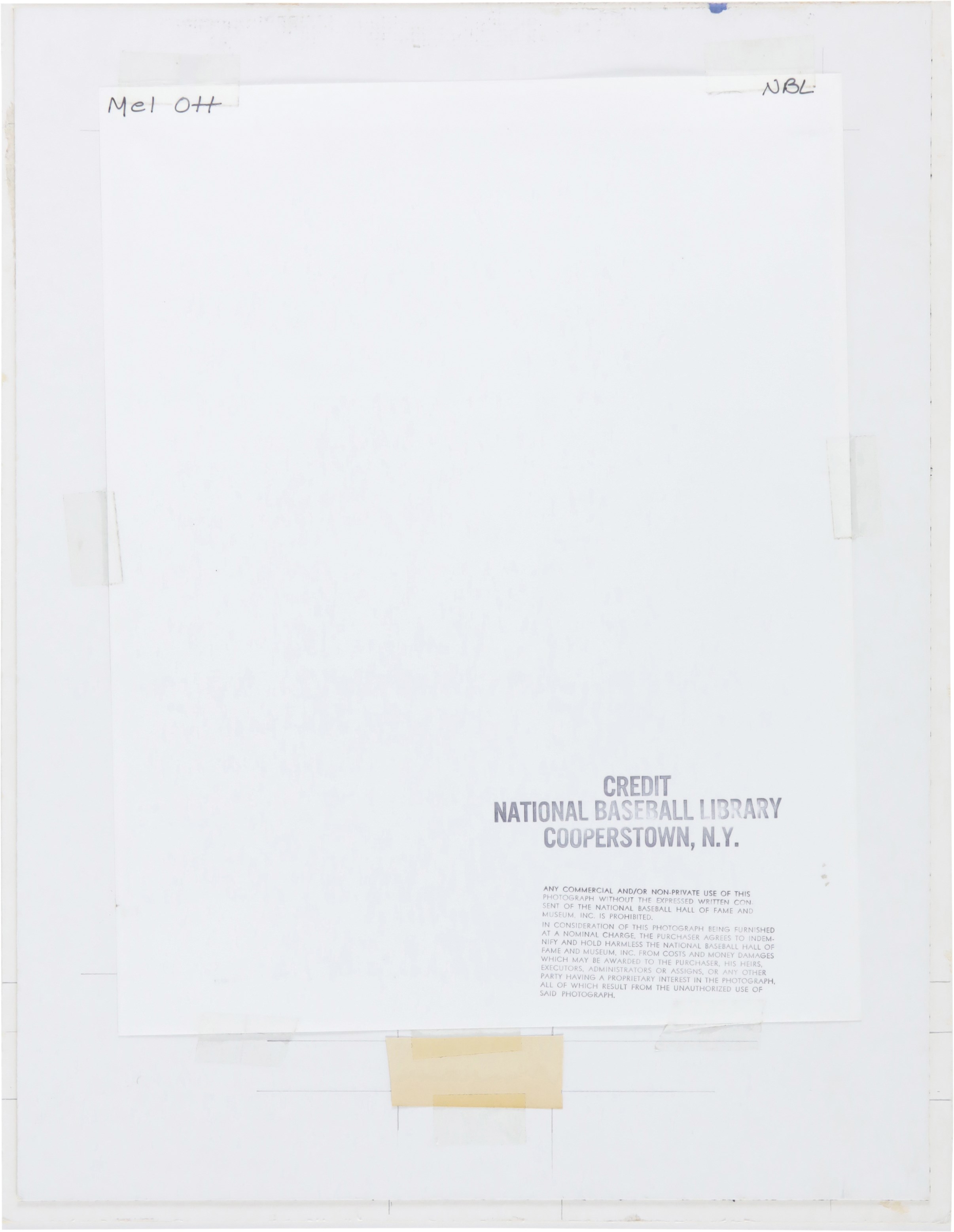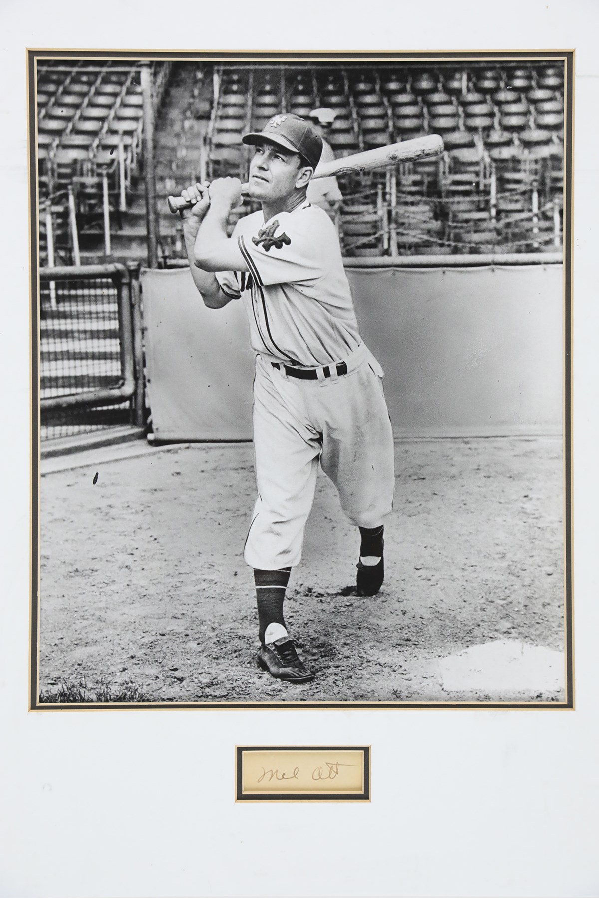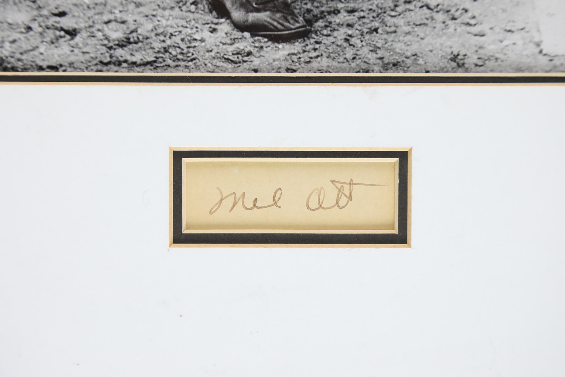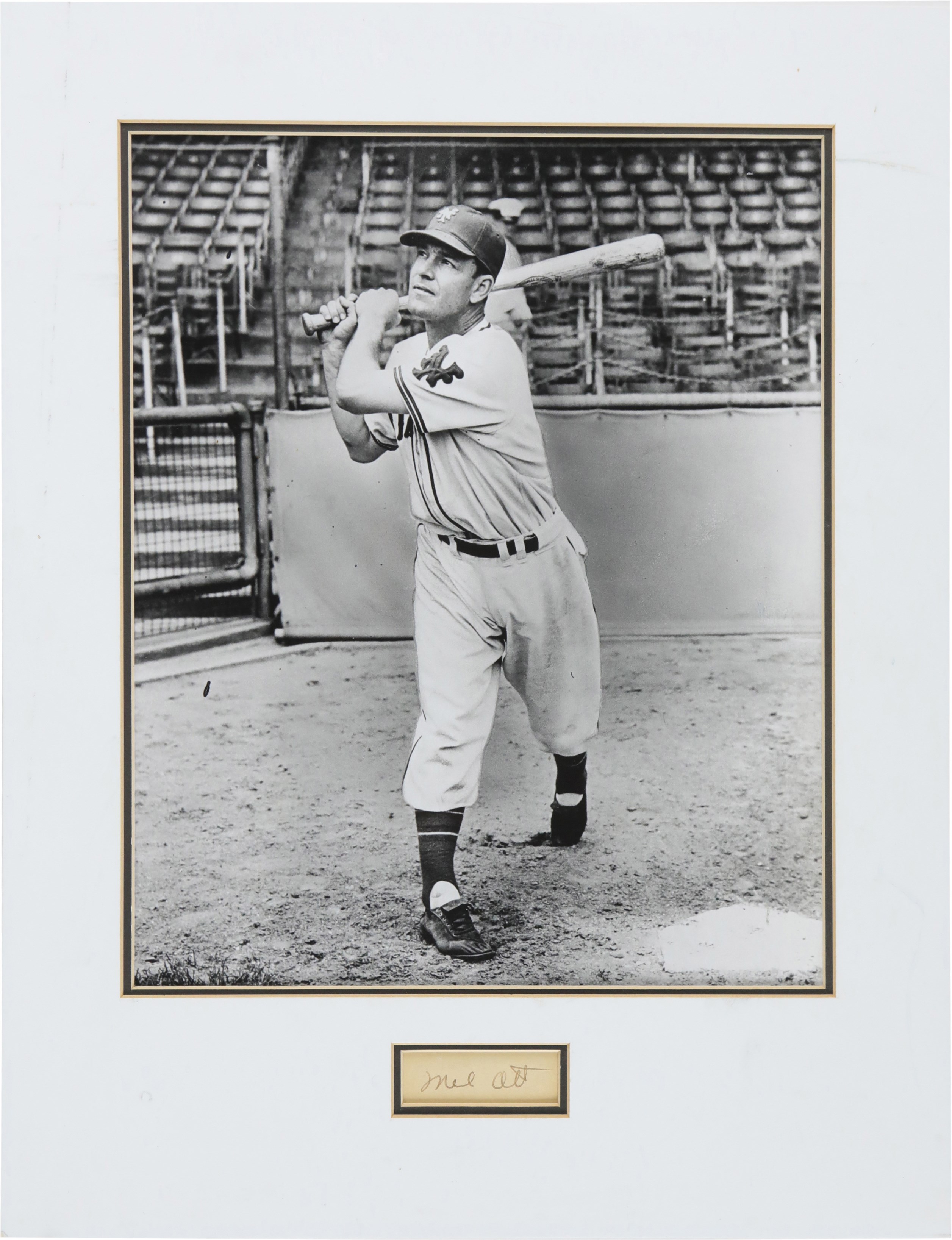 A matted photo of baseball Hall of Famer Mel Ott along with a cut signature. The photo (10x12 visible, 14x18 in set) shows the former Giants slugger swinging a bat. Under the photo is a cut signature from Ott. The item will include a Letter of Authenticity from PSA/DNA verifying the signature. Ott was one of the game's biggest stars of the 1930s and 40s, leading the National League in home runs 6 times. He was inducted into the Baseball Hall of Fame in 1951. Ott passed away in 1958, making examples of his signature very rare and highly collectible.