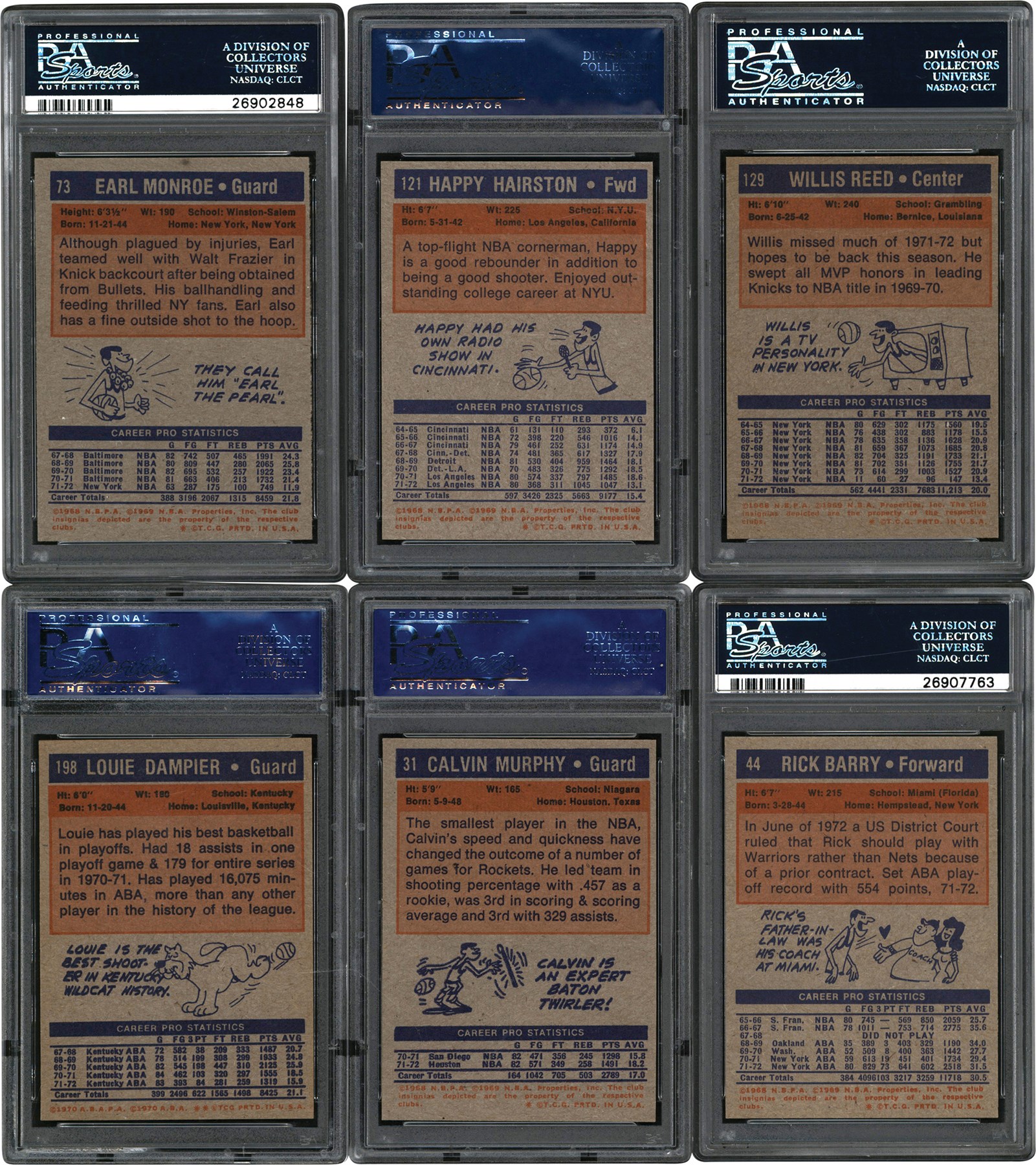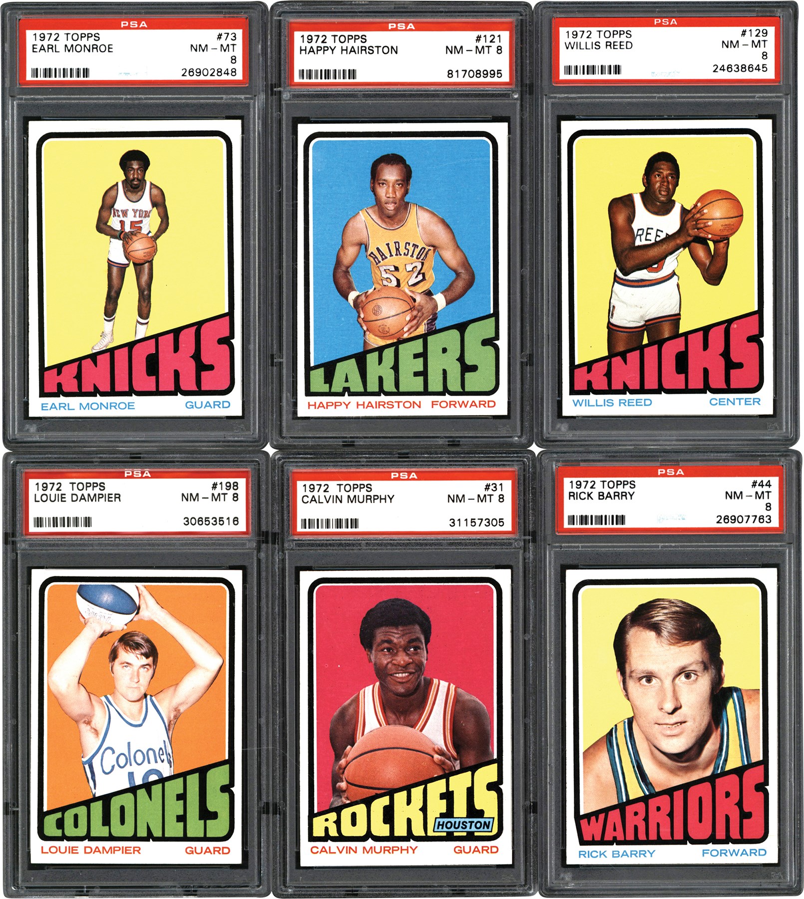 1972-1973 Topps Basketball collection of (10) cards.  All of the cards have been graded and encapsuated by PSA with: 1 Chamberlain NM 7; 6 G Johnson NM-MT 8; 11 Sloan NM-MT 8; 28 Thurmond NM-MT 8; 31 Murphy NM-MT 8; 44 Barry NM-MT 8; 73 Monroe NM-MT 8; 121 Hairston NM-MT 8; Reed NM-MT 8; 198 Dampier NM-MT 8;