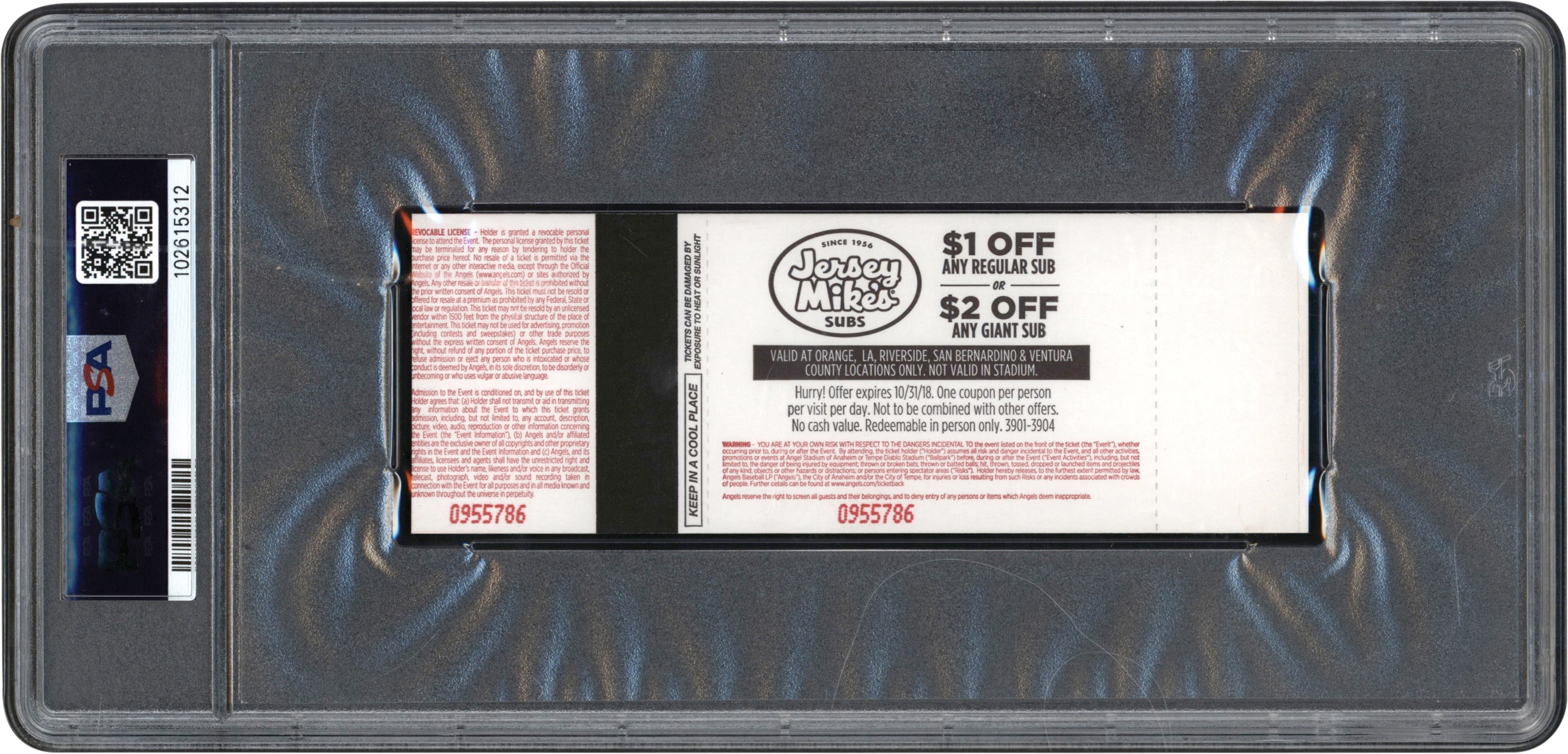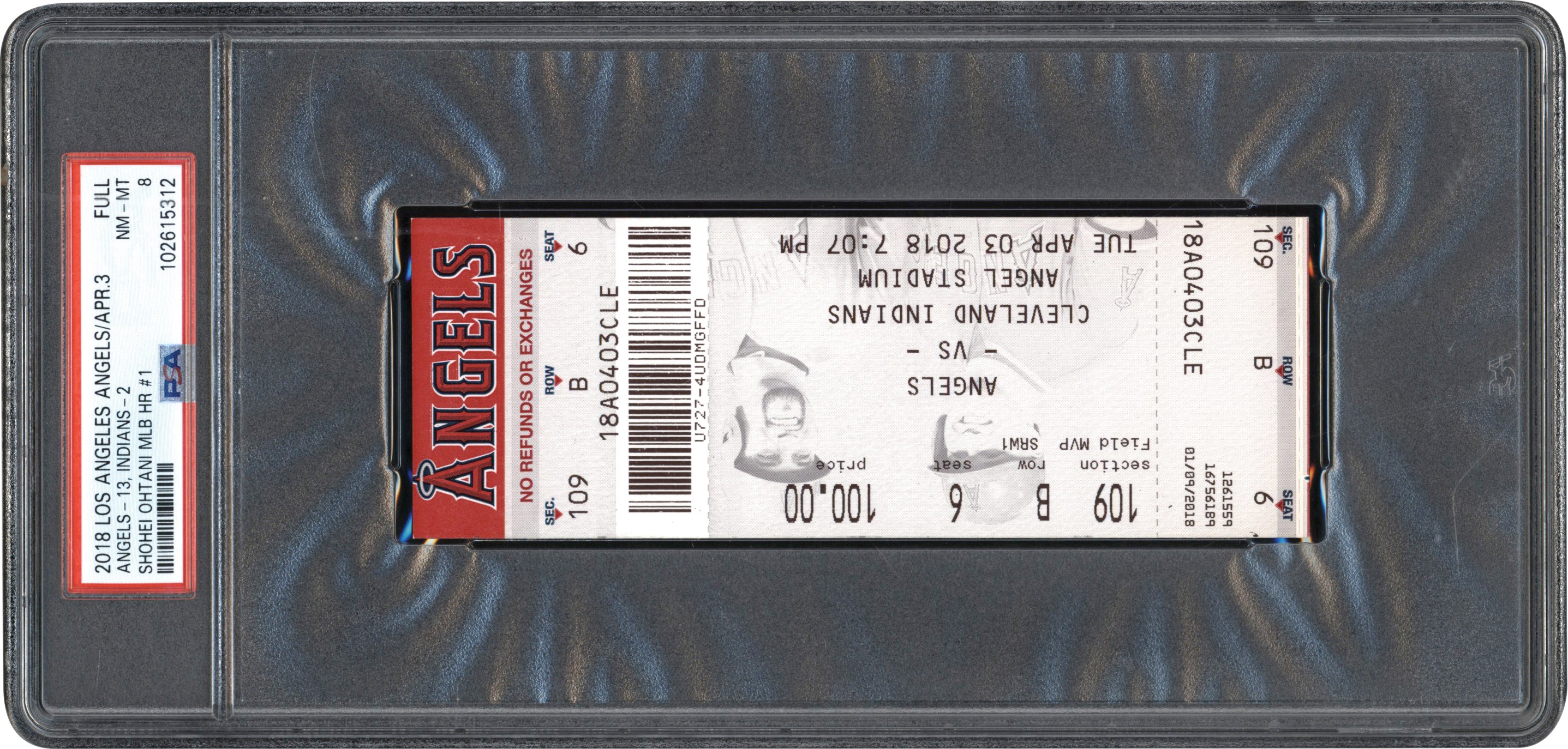 A PSA 8 graded full ticket from Shohei Ohtani's first Major League Baseball home run game. On April 3, 2018, Angels superstar Shohei Ohtani hit a three-run home run off of Cleveland Indian's starter Josh Tomlin at Angel Stadium. The home run was Ohtani's first career home run in Major League Baseball. The ticket measures 5.5" x 2" and has been slabbed by PSA. The slab size is 4.5" x 9.5." Ohtani exploded on the MLB scene in 2018 and has since become the face of Major League Baseball. In 2024, Ohtani won the National League Most Valuable Player Award as well as a World Series title with the Los Angeles Dodgers.