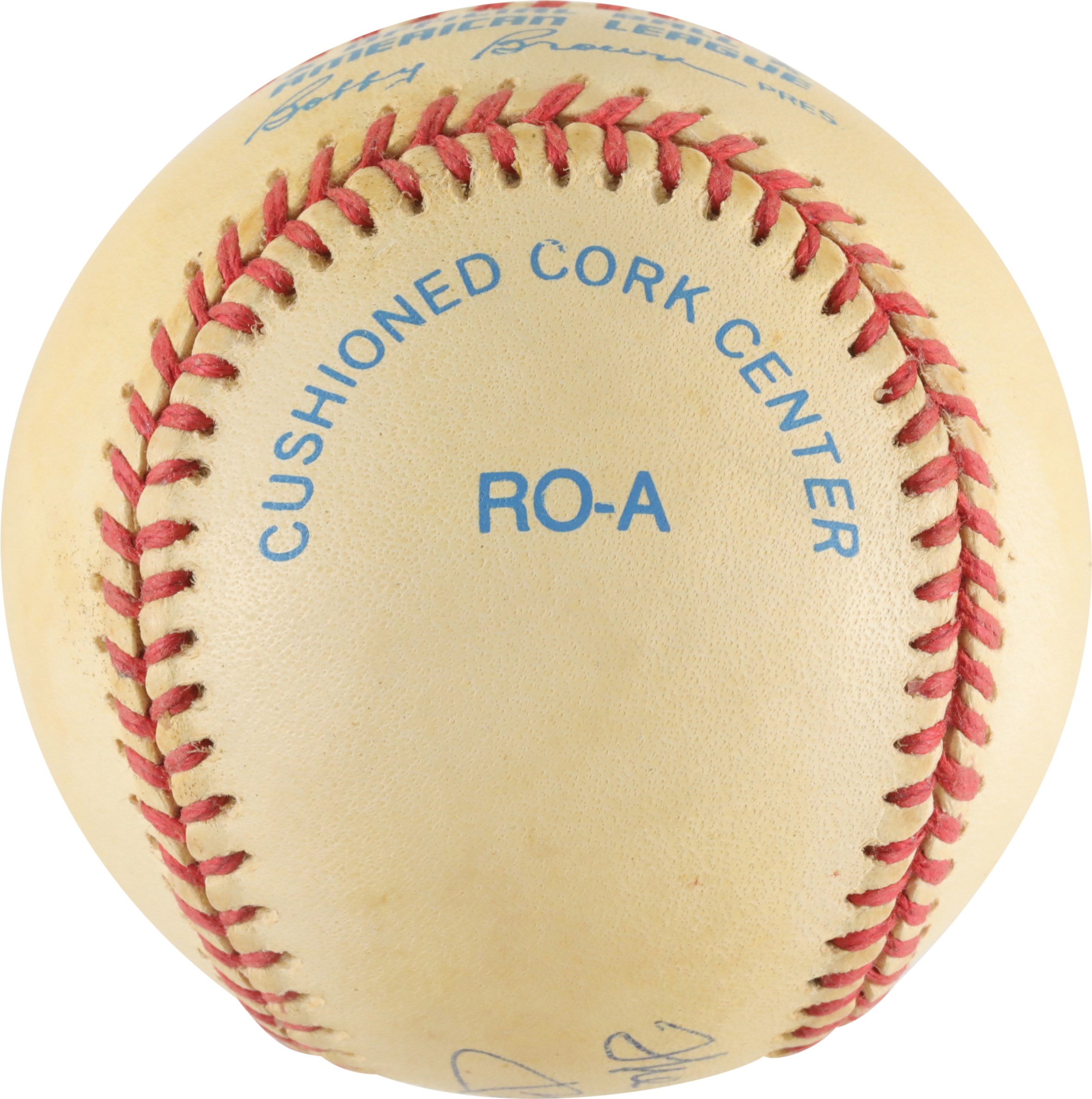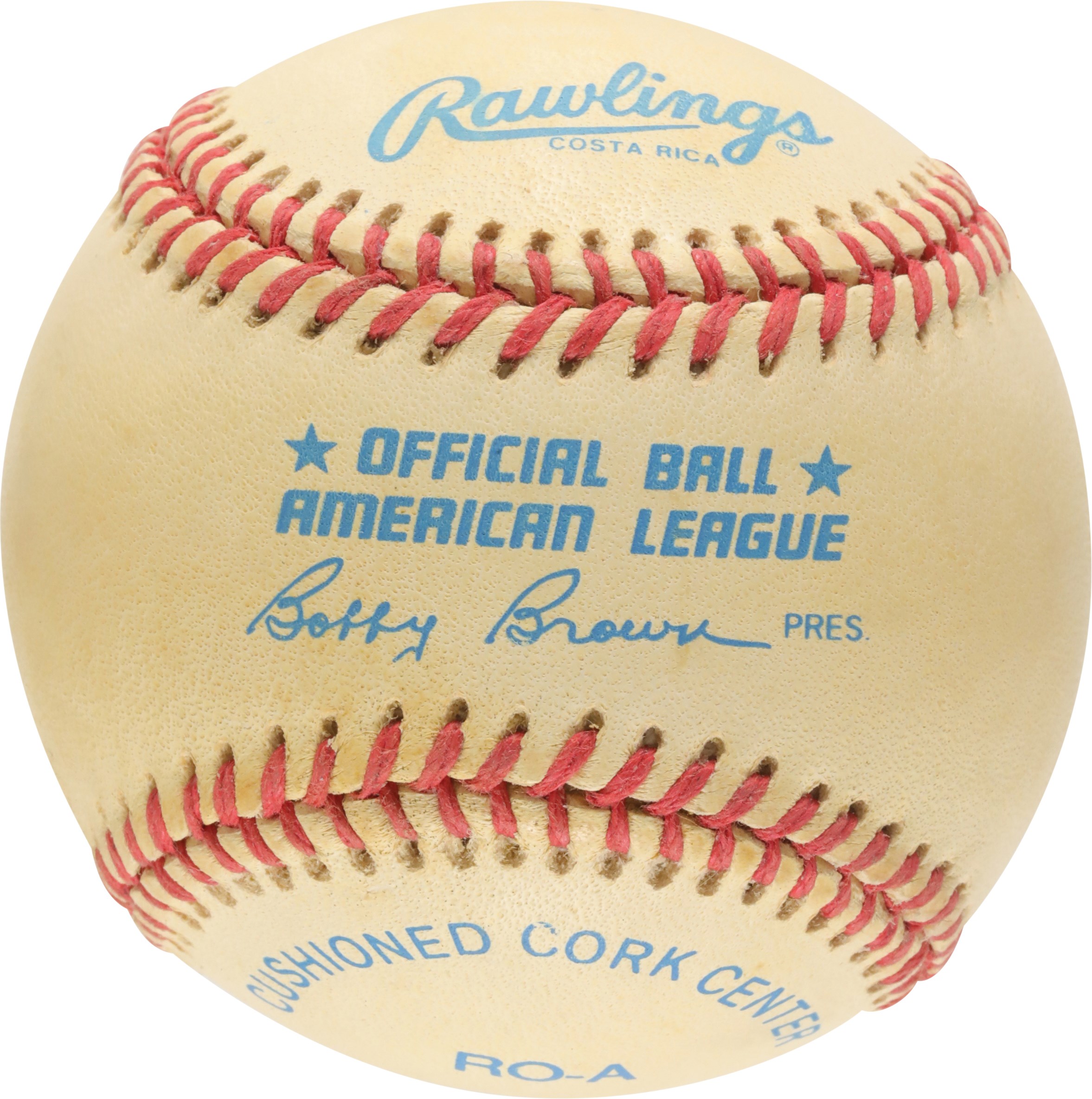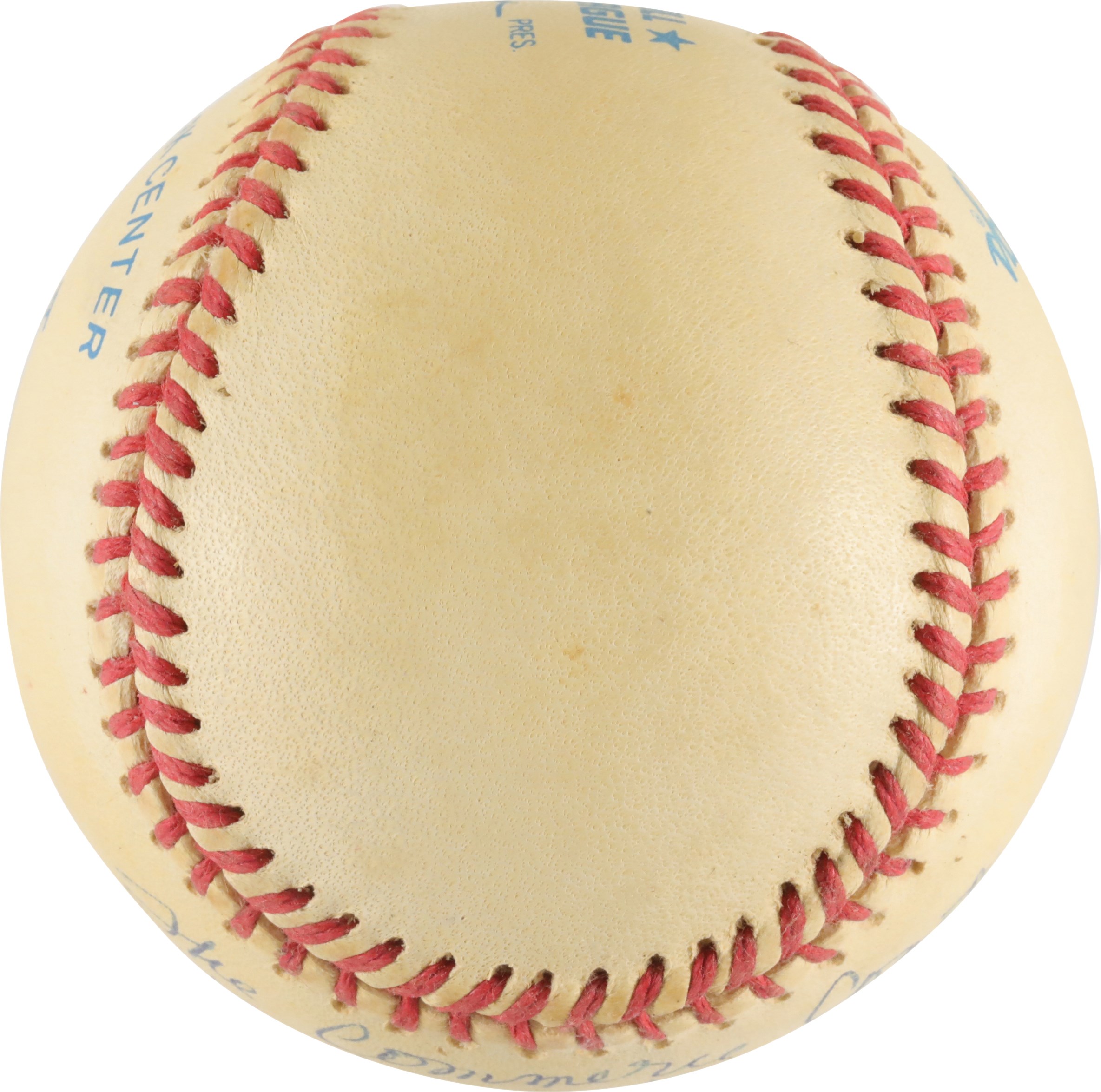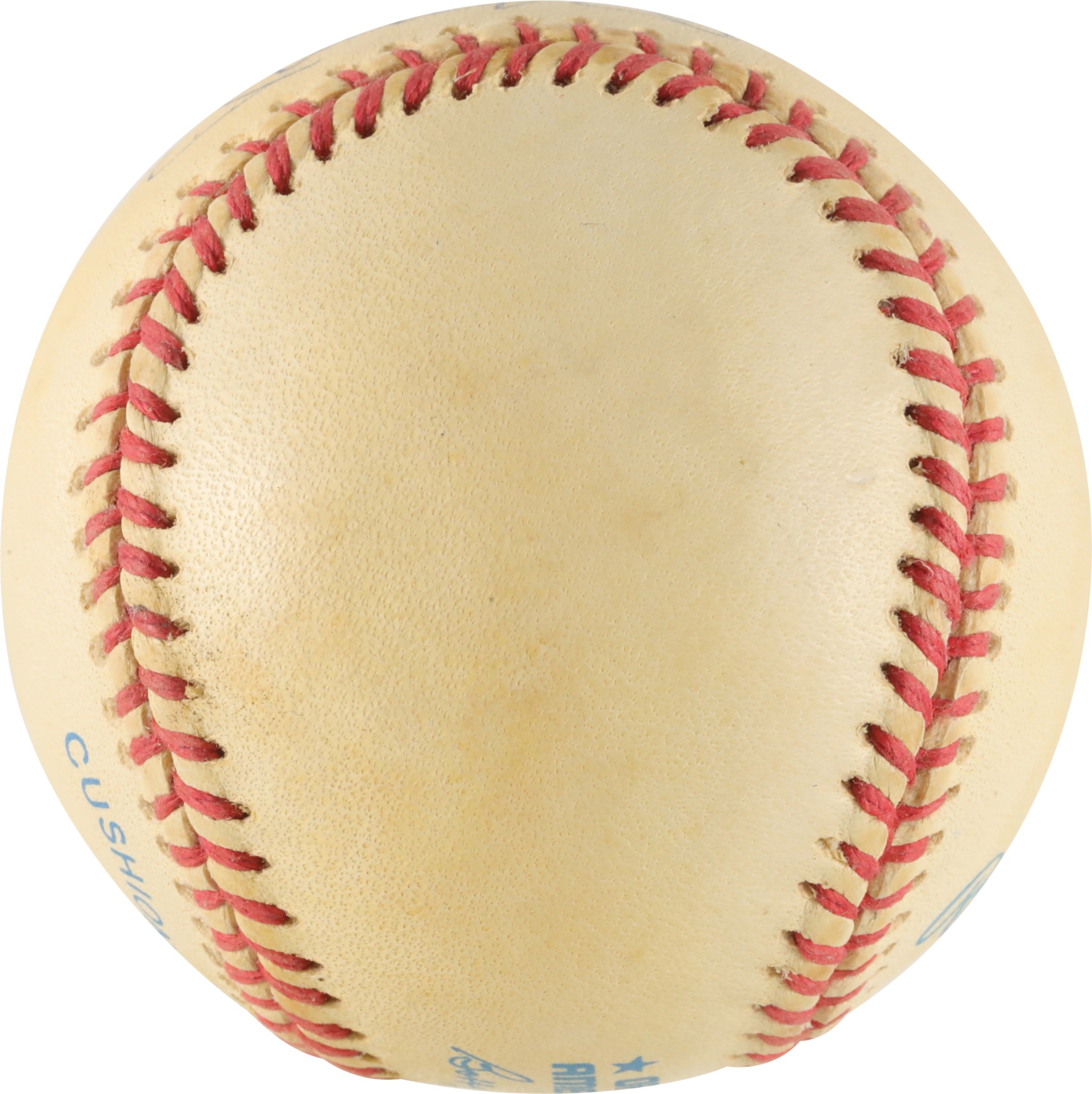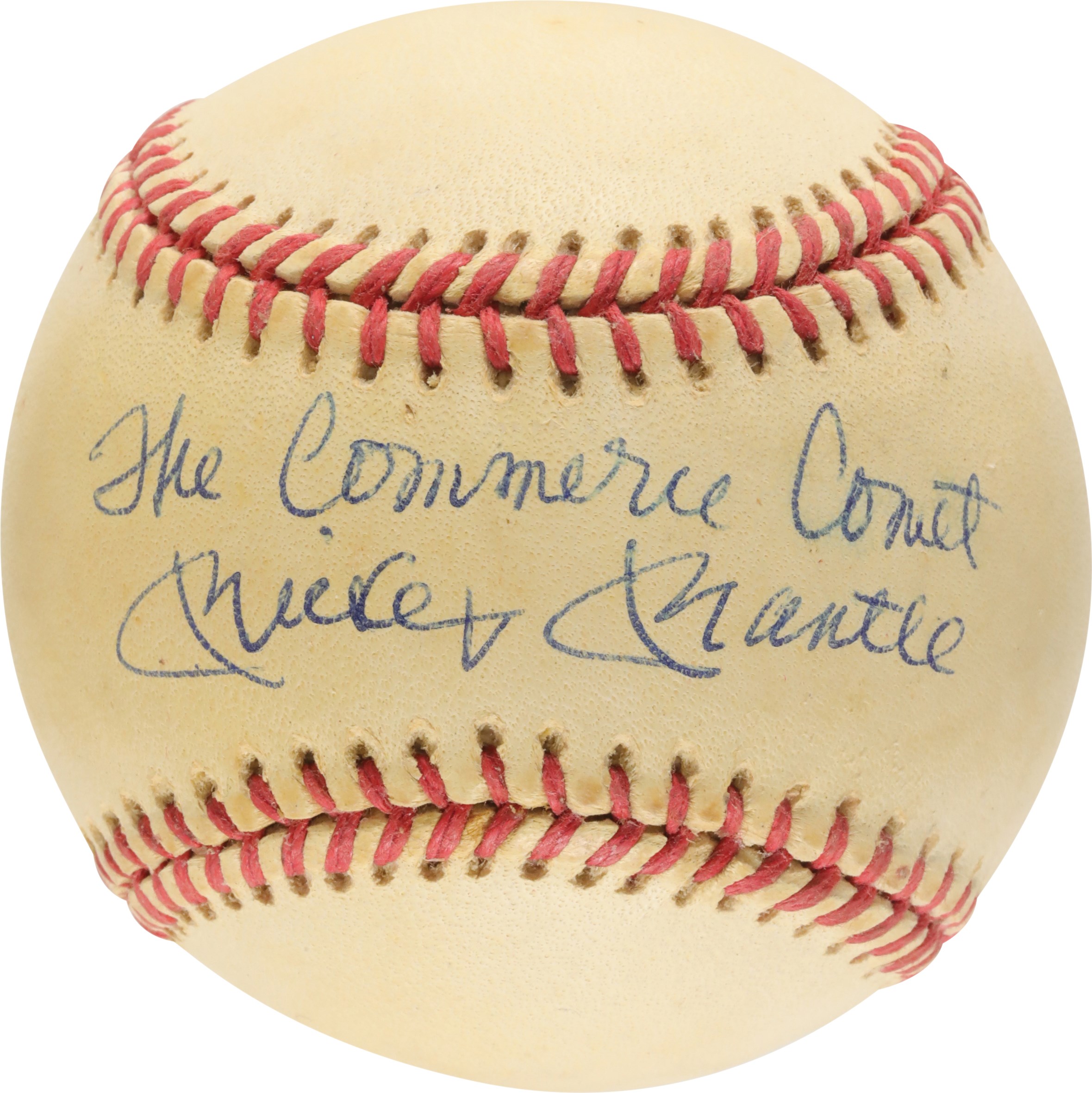 Mickey Mantle single-signed and inscribed "The Commerce Comet" baseball. This Official Rawlings American League (Brown) baseball has been signed on the sweet spot by Mickey Mantle. Mantle added "The Commerce Comet" above his name. The ball is in very good condition as it shows some signs of toning. Mantle signed baseballs with an inscription are more difficult to come by than a regular Mantle single-signed ball, and are usually more desirable among collectors. Comes with a full LOA from PSA.